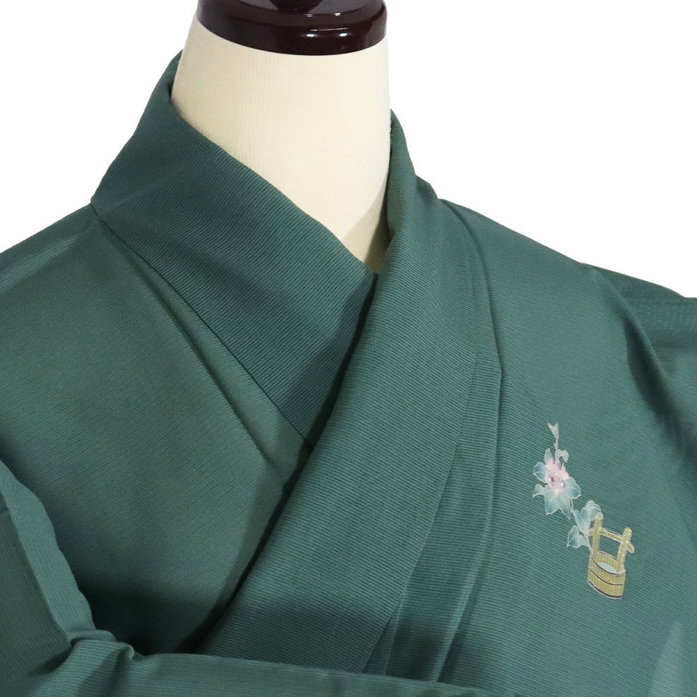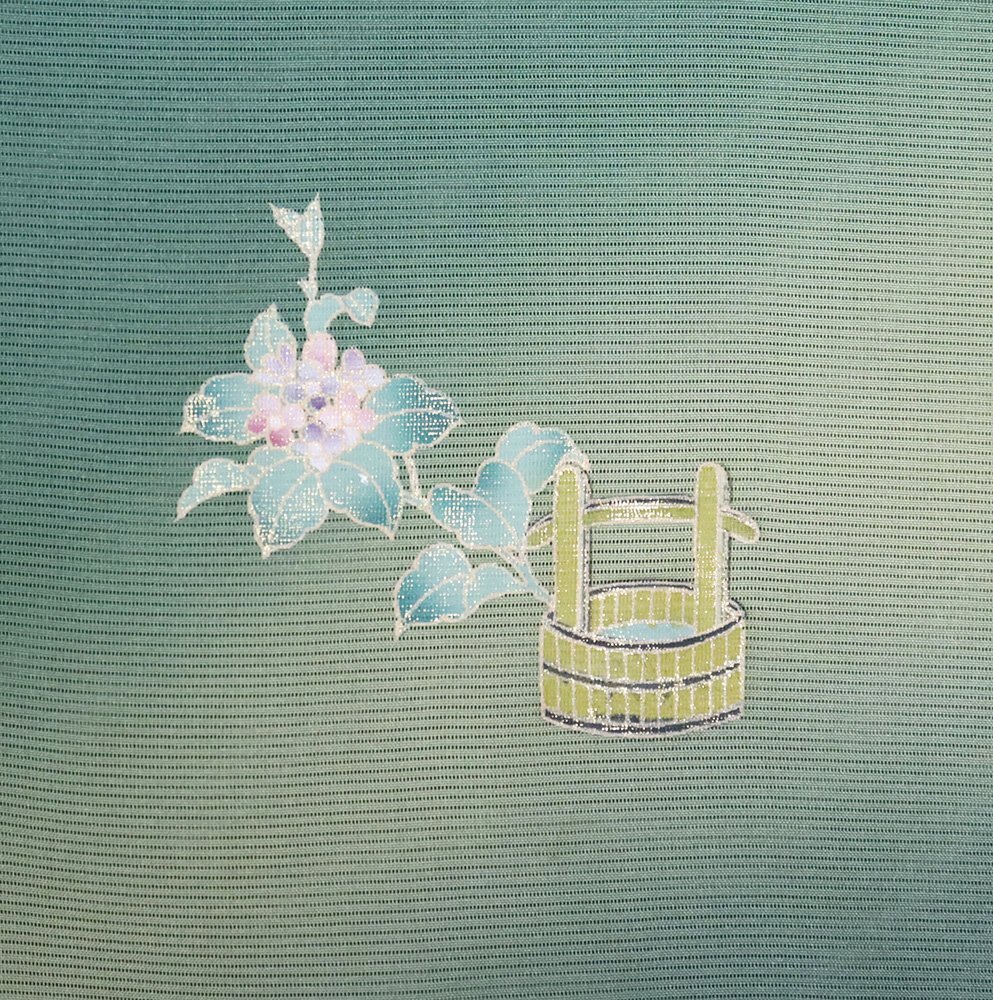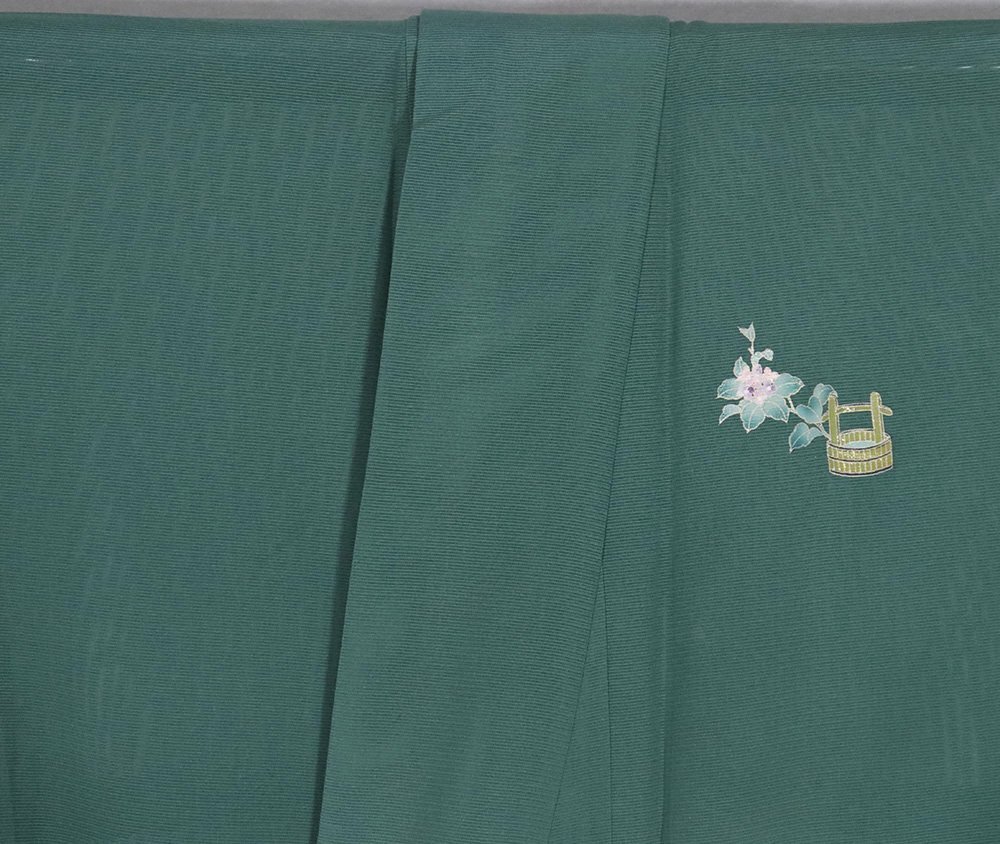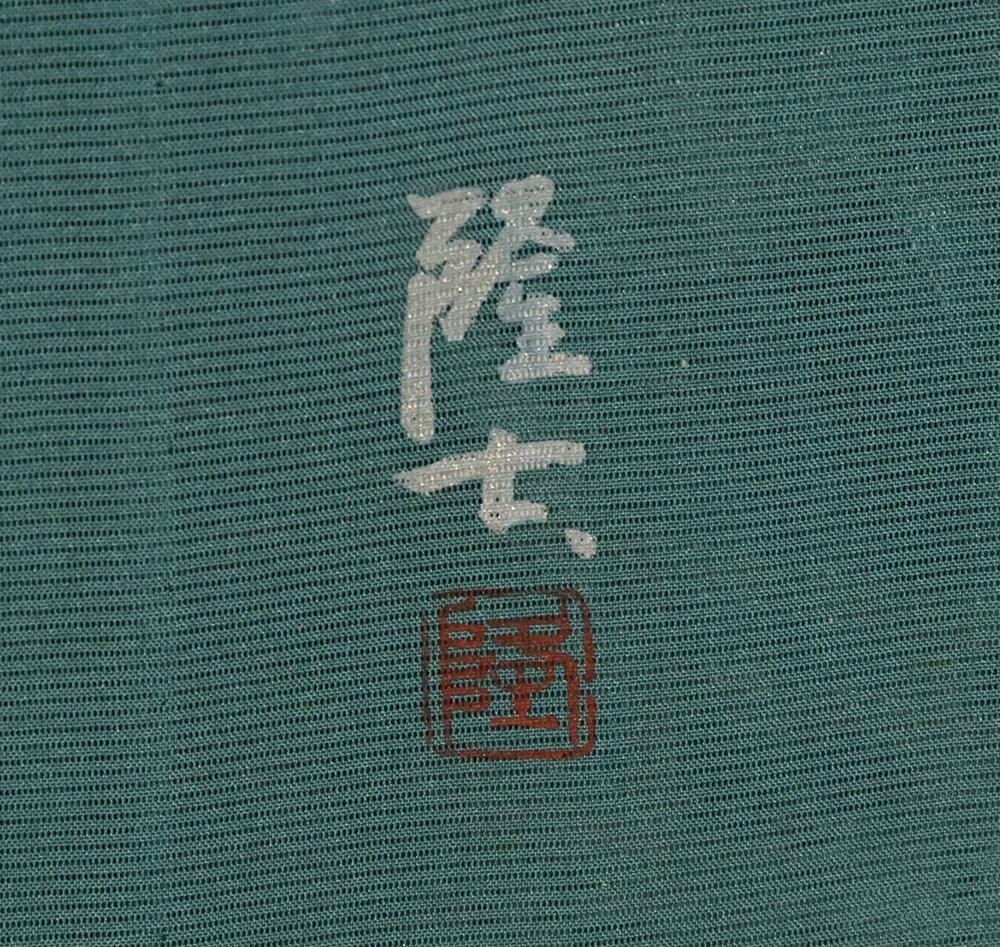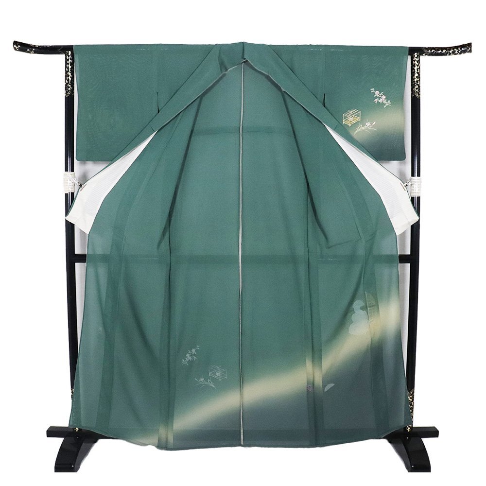 | 螺鈿作家 藤本隆士氏作 絽 訪問着 丹後縮緬地 緑(天鷲絨色)・ベージュ暈し地 芸者 螺鈿入り 月窓・花柄 168 広襟 作家落款入り | |