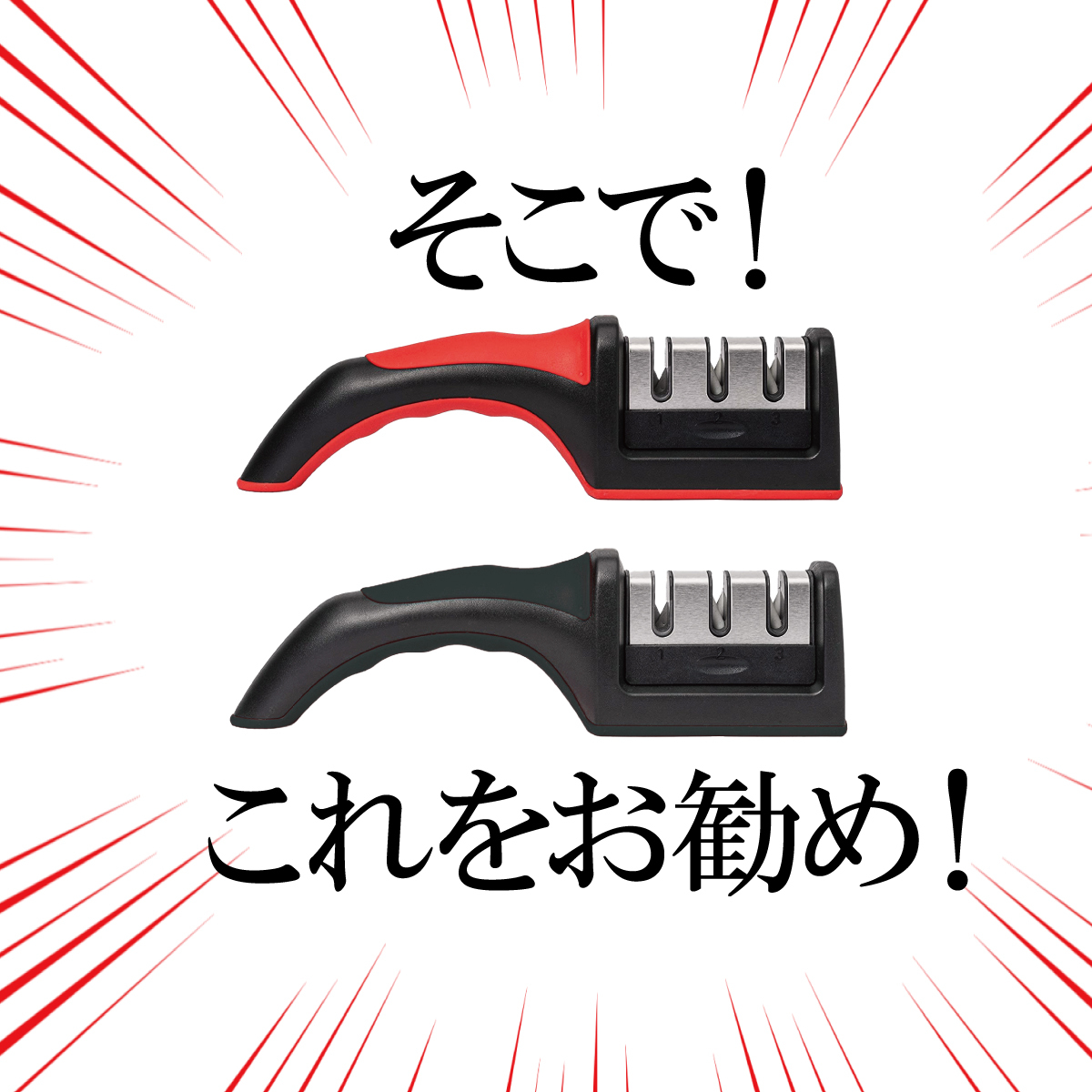 1. 利き手と逆の手で砥ぎ器の持ち手部分をしっかり支えます。