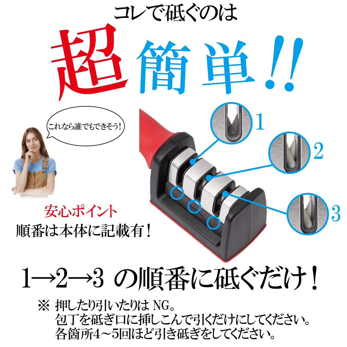 研ぎ器の砥ぎ部の下にある1-3の番号を確認してください。