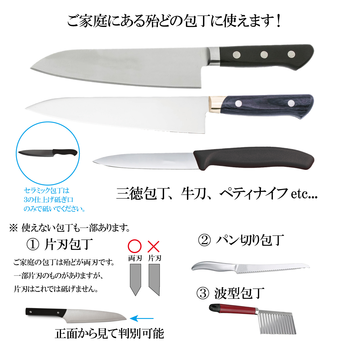 ・ 両刃専用です。片刃包丁は砥げません。(ご家庭の三徳包丁などはほとんど両刃です。商品画像を参照して包丁をご確認下さい)