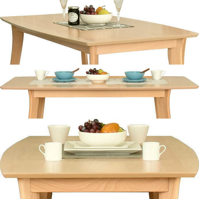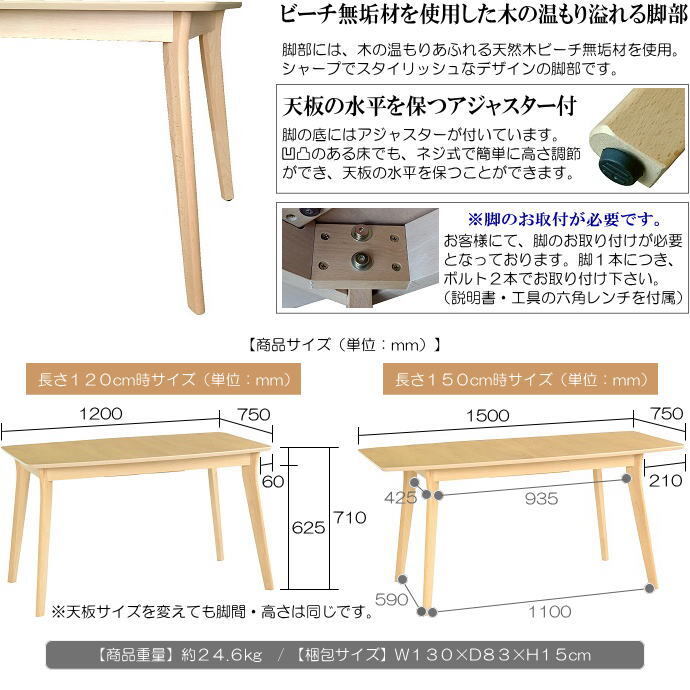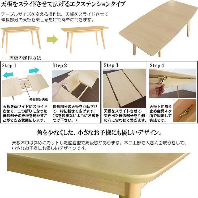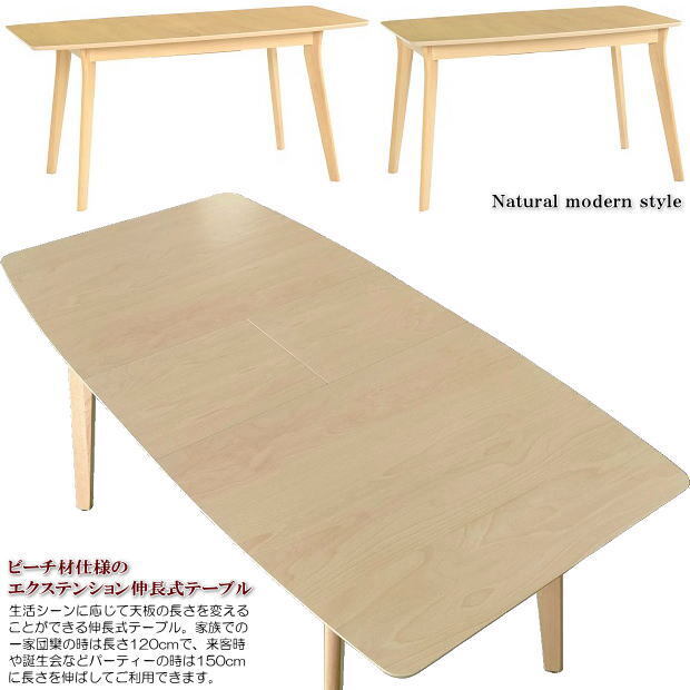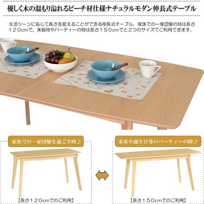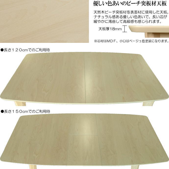 | 【商品特徴】 | ◇長さを120cmから150cmに伸長できるビーチ材仕様エクステンションダイニングテーブルの単品販売。 ・ご利用の生活シーンに応じて天板の長さを変えることができる伸長式テーブルです。家族での一家団欒の時は長さ120cmで、来客時や誕生会などのパーティーの時は長さ150cmでと2つのサイズでご利用できます。 ・テーブルサイズを変える操作は、天板をスライドさせて、伸長部分の天板を乗せるだけで簡単にできます。 ・天板にナチュラル感のある板目のビーチ突板材を使用し、脚には丈夫なビーチ無垢材(集成材)を使用しています。あたたかみのある優しい色合いで、ナチュラルモダンの趣です。 ・天板木口は斜めにカットした船底型で高級感があります。木口上部も大きく面取りをし、小さなお子様にも優しいデザインです。 ・すっきりとしたシャープなデザインの脚は、ビーチ無垢材を使用した安定感のある4本脚タイプです。 ・脚の底にはアジャスターが付いています。凹凸のある床でも調節ができ天板の水平を保つことができます。 ・お客様にて、脚のお取り付けが必要となっております。脚1本につき、ボルト2本でお取り付け下さい。(説明書・工具の六角レンチを付属。) | |