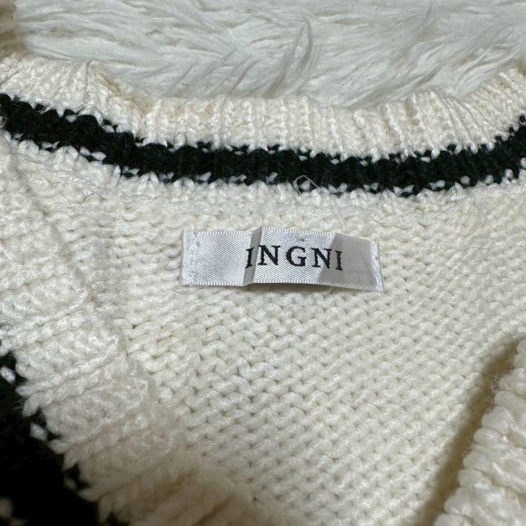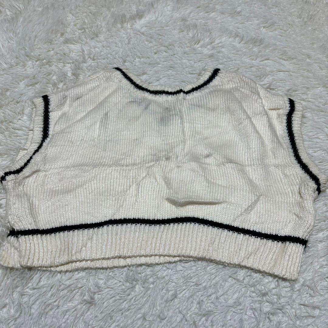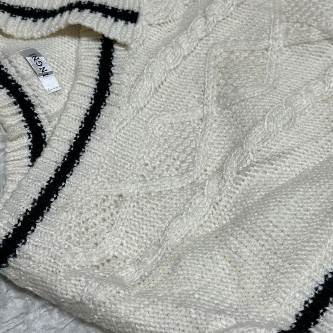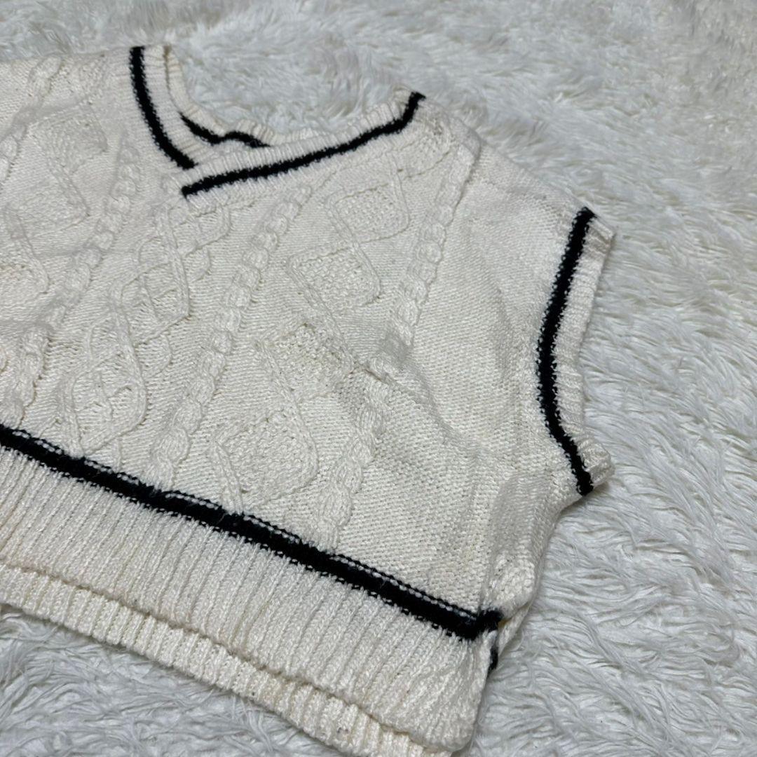 アイボリーのケーブルニットデザイン、ブラックトリムのクロップドニットベスト。