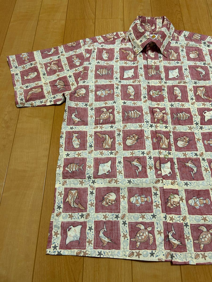 美品☆OKINAWA/Mango・マンゴ M 裏使い生地.半袖シャツ型アロハシャツ 海の生き物多数!沖縄の魚.貝.亀&サメ.エイ.カジキ&トド?他総柄!