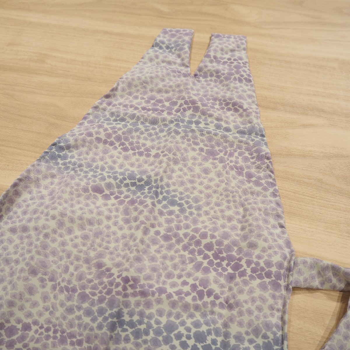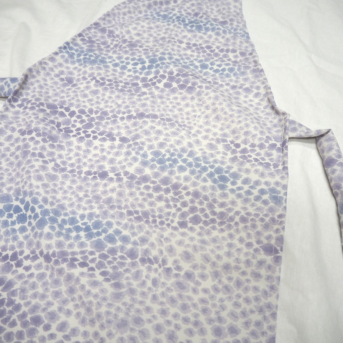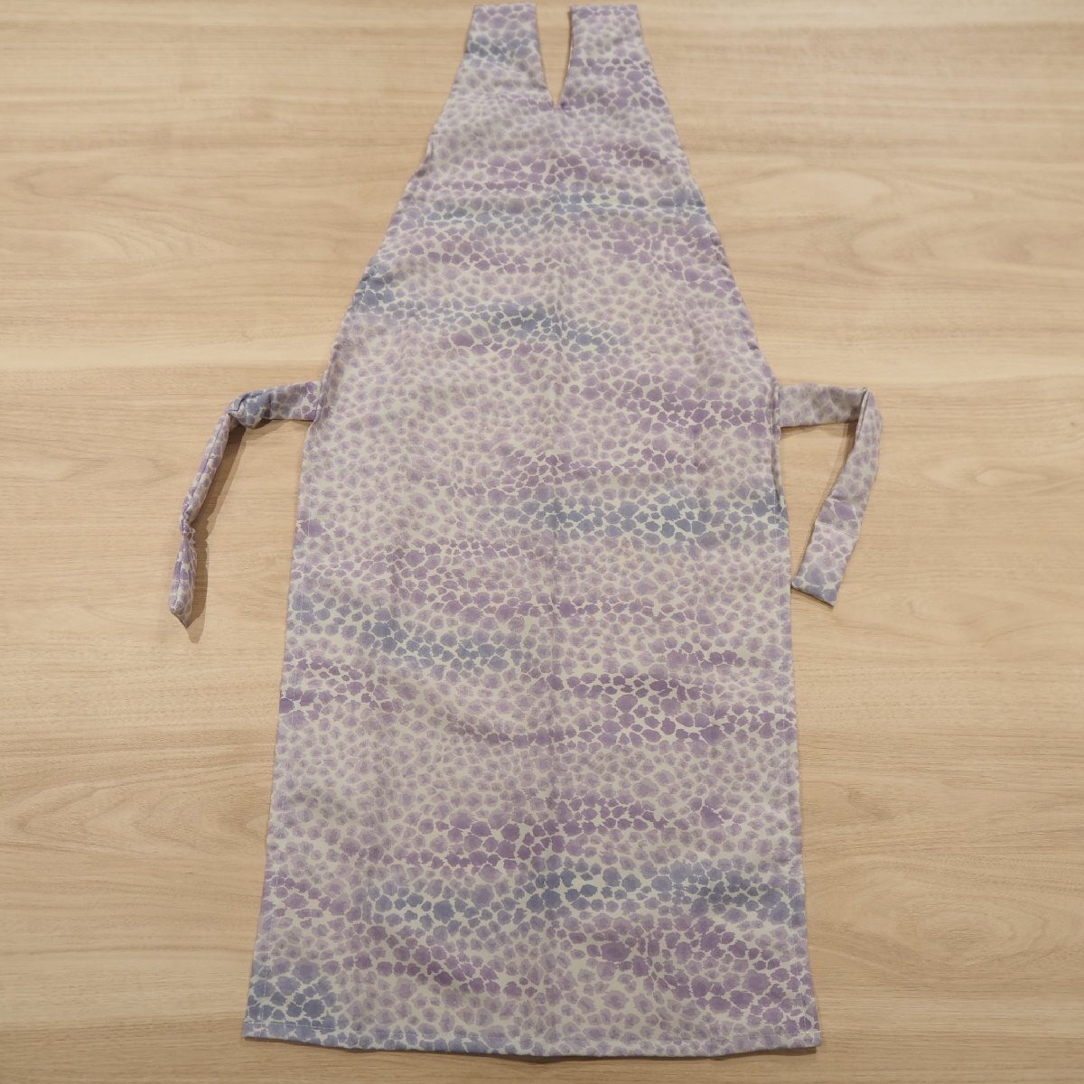エプロンの衿部分と紐の先にプラスチック芯が入っているので、衿と帯元にはさむだけ。