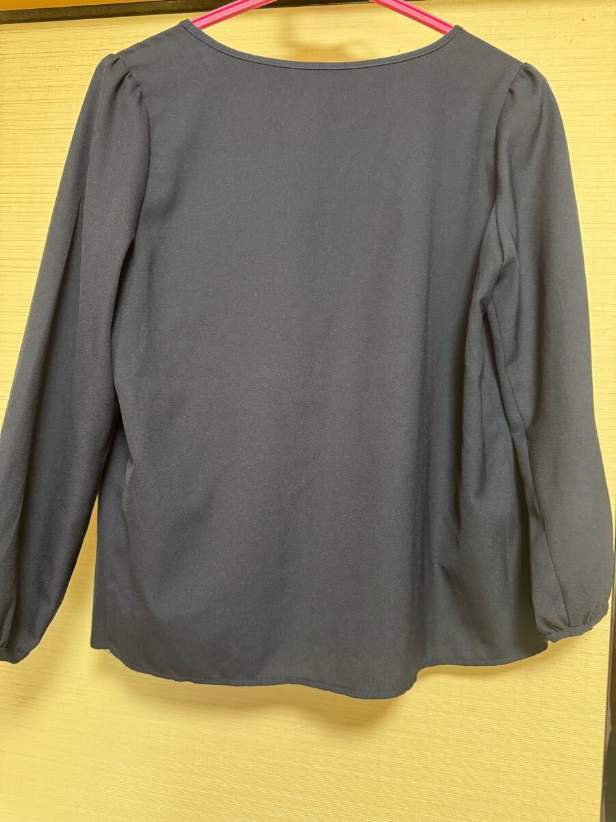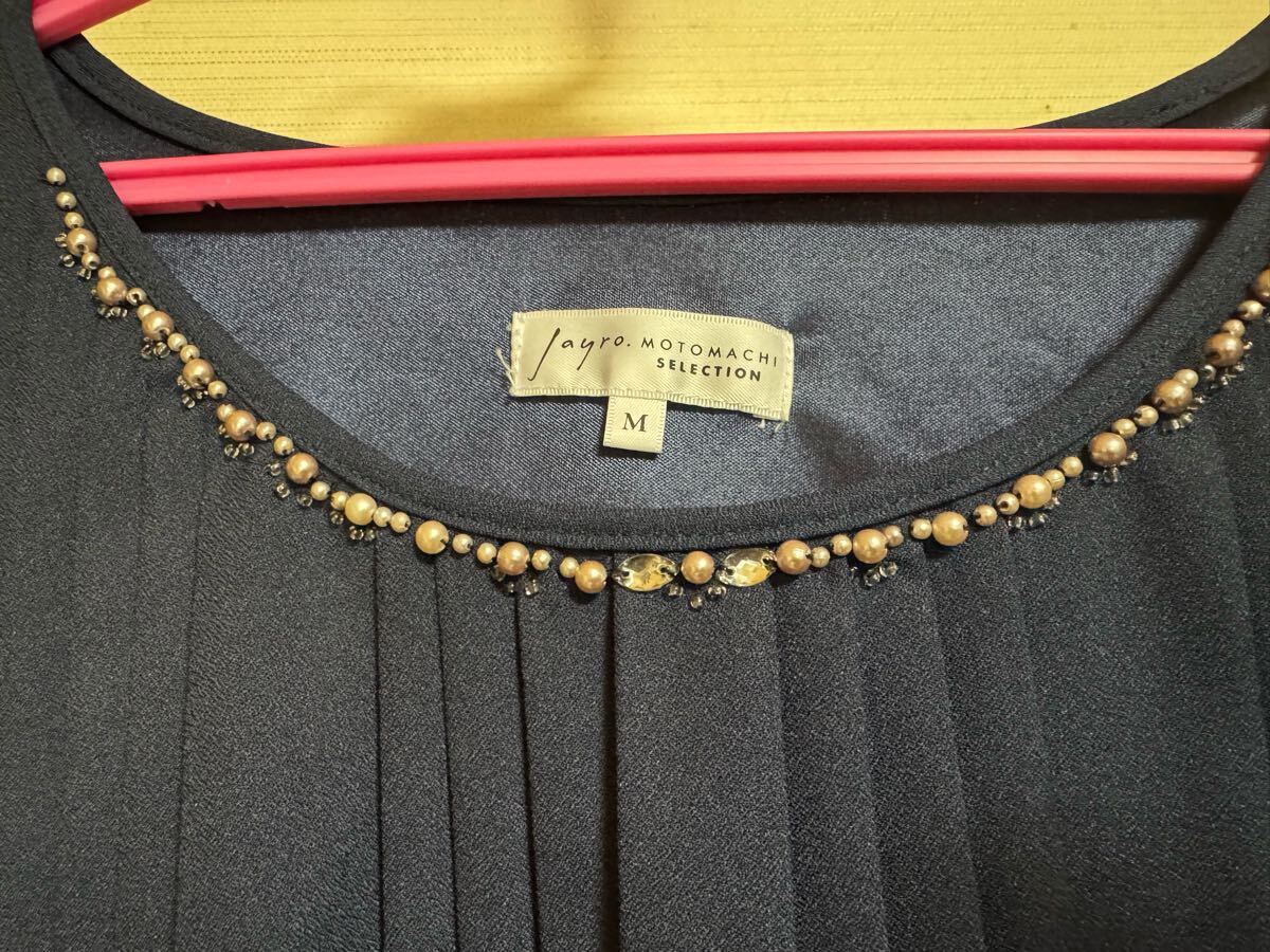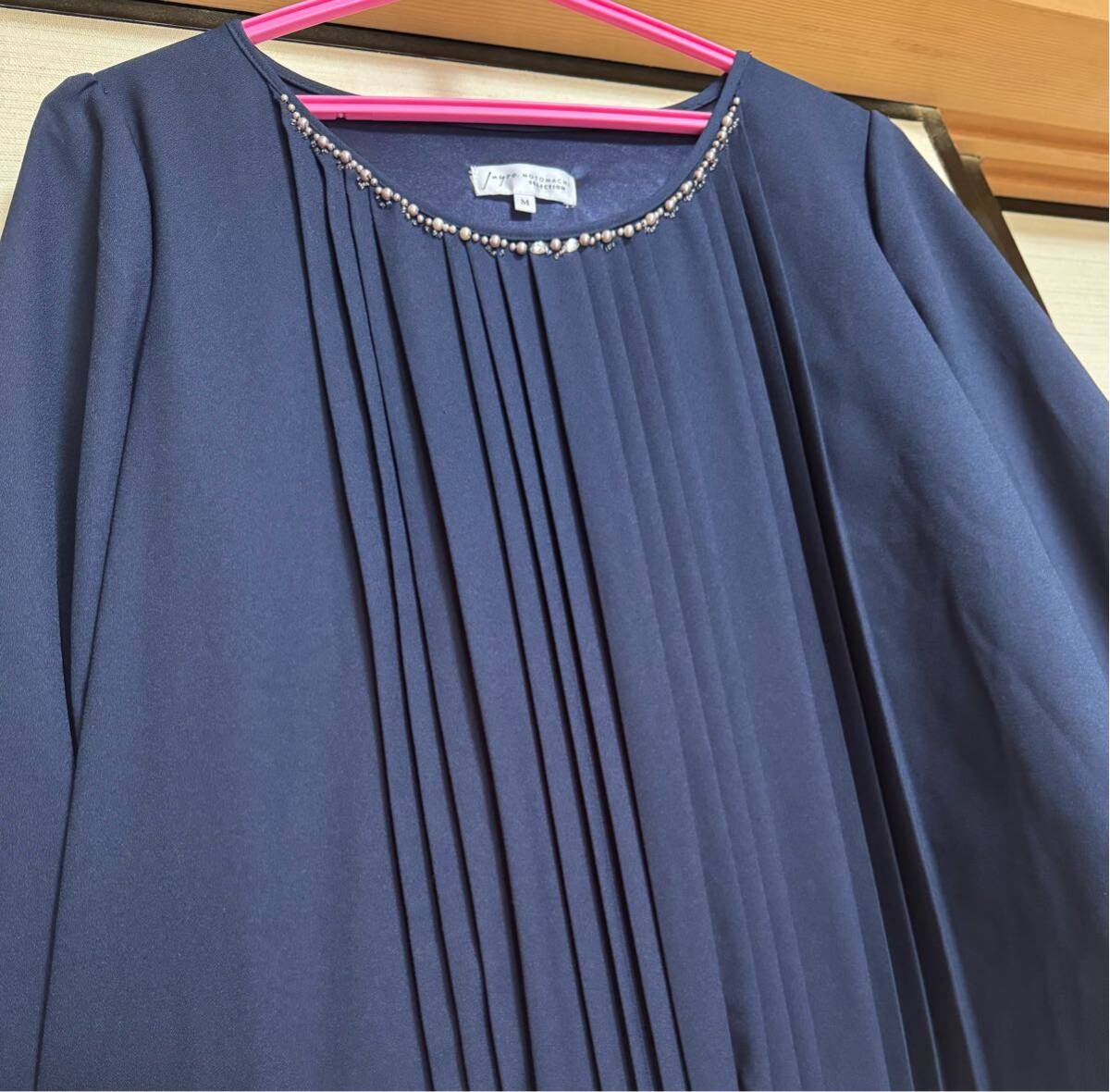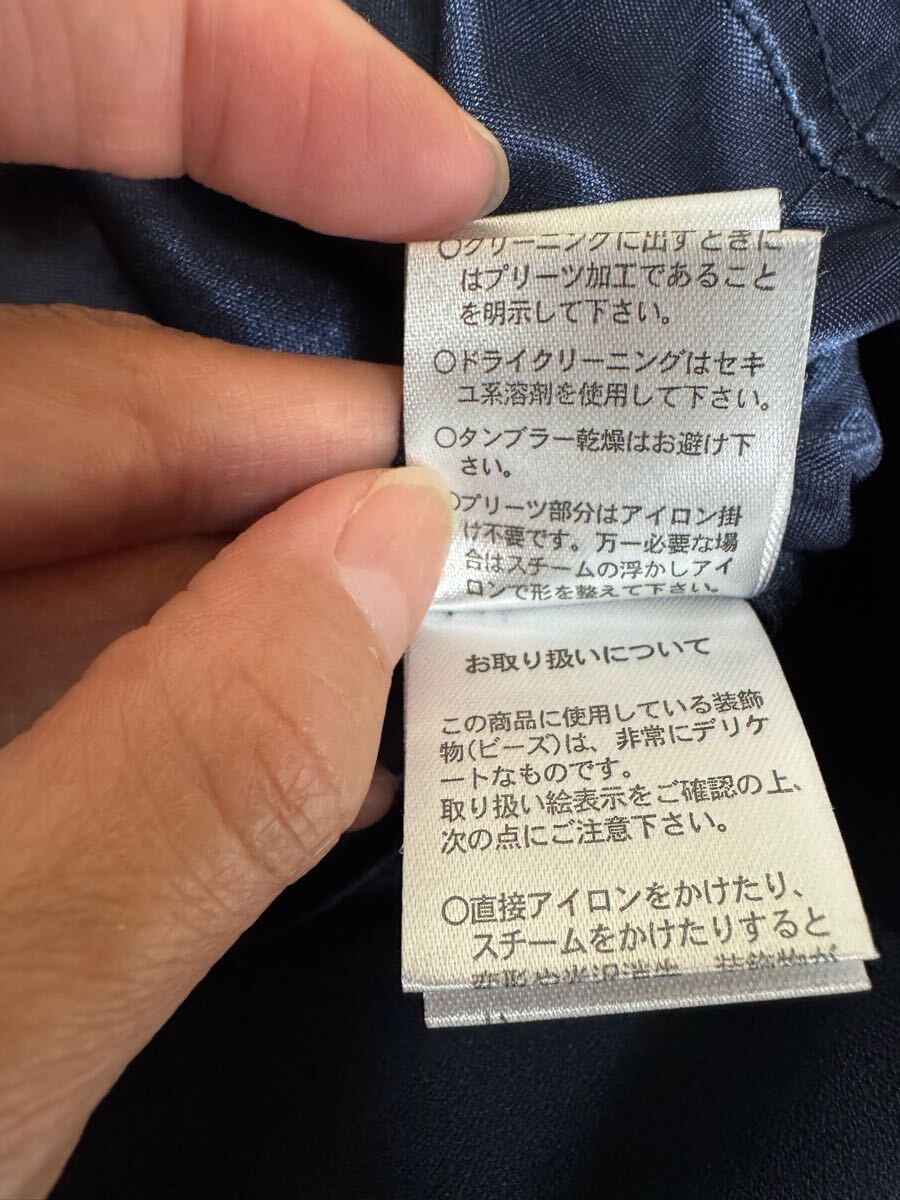 ネイビーのプリーツデザイン、Mサイズのビーズ装飾付きブラウス。