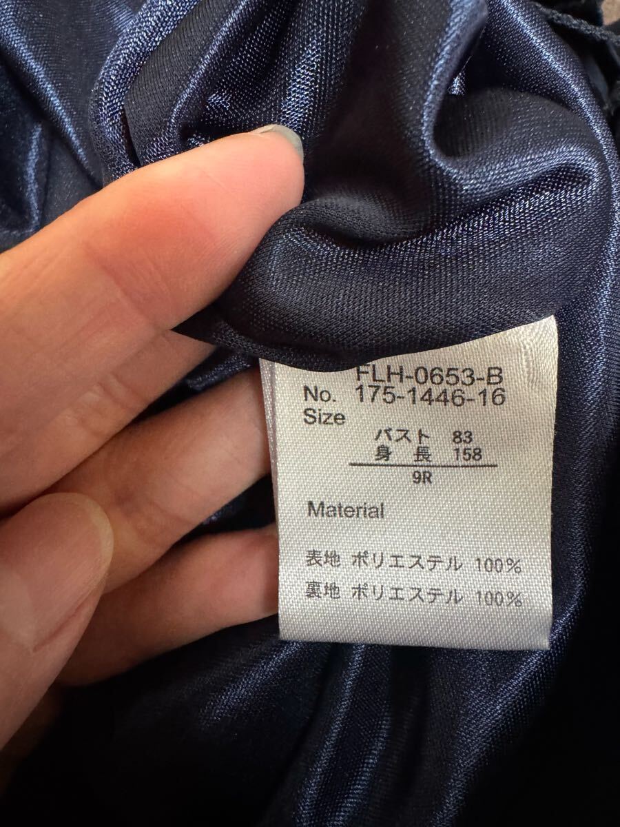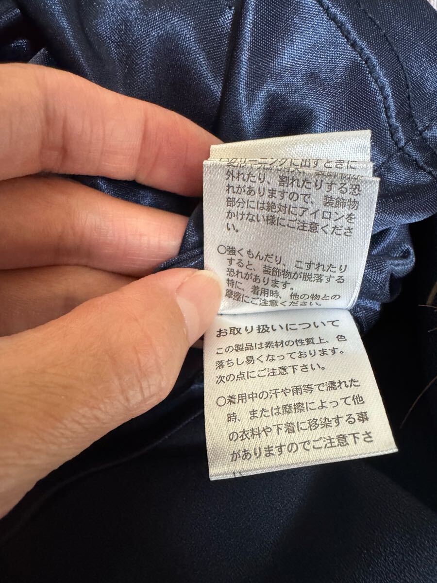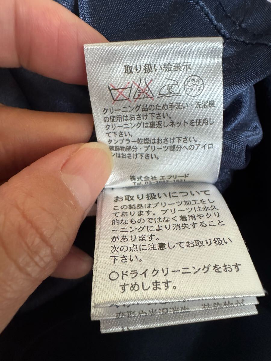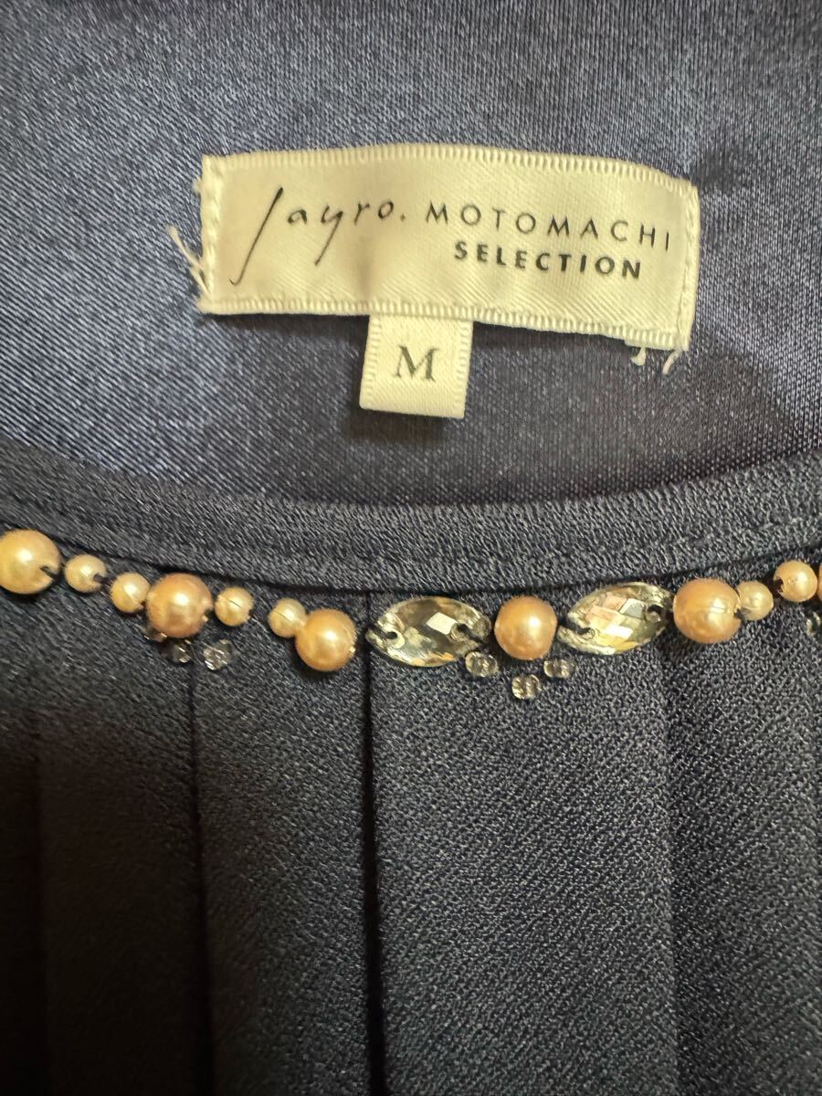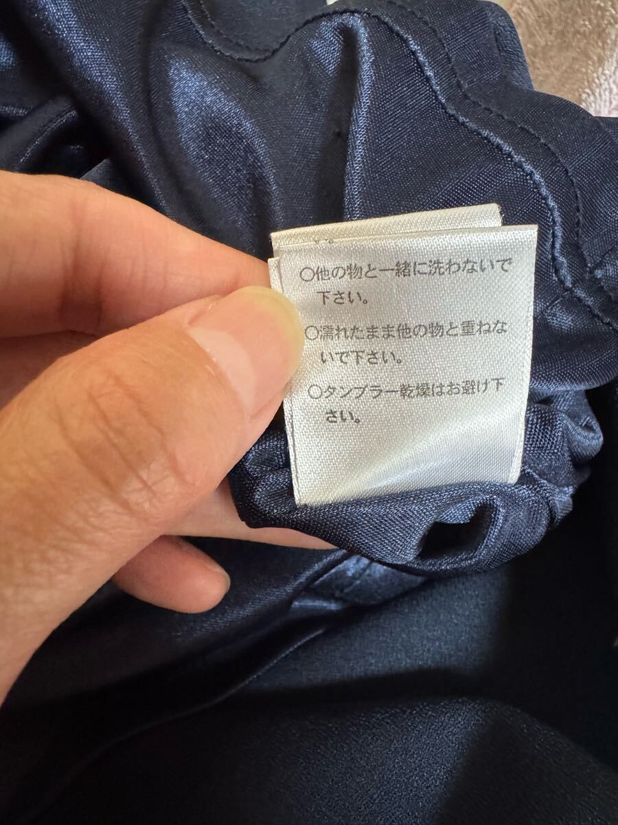 ネイビーのプリーツデザイン、Mサイズのビーズ装飾付きブラウス。
