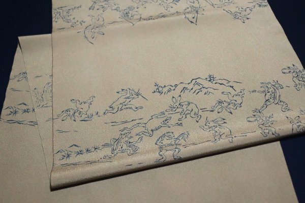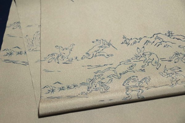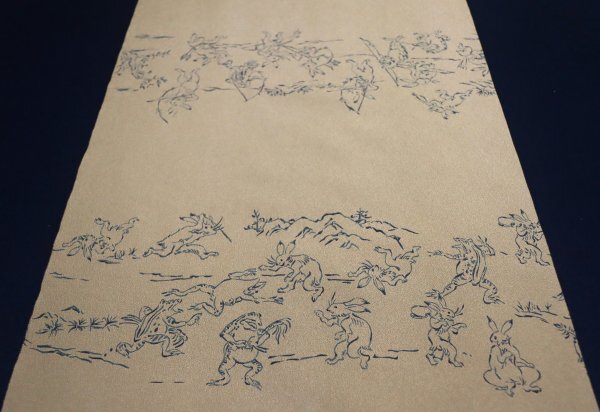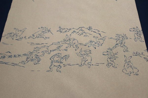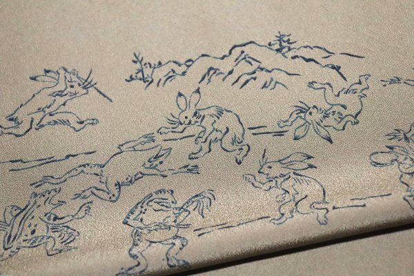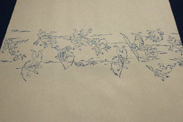 | 【京わぎれ】東レ シルック 男物 長襦袢はぎれ 横段 鳥獣戯画文様 薄焦げ茶系(薄紀州茶系) 替え袖用 2.2m 少難品 ② | ||||