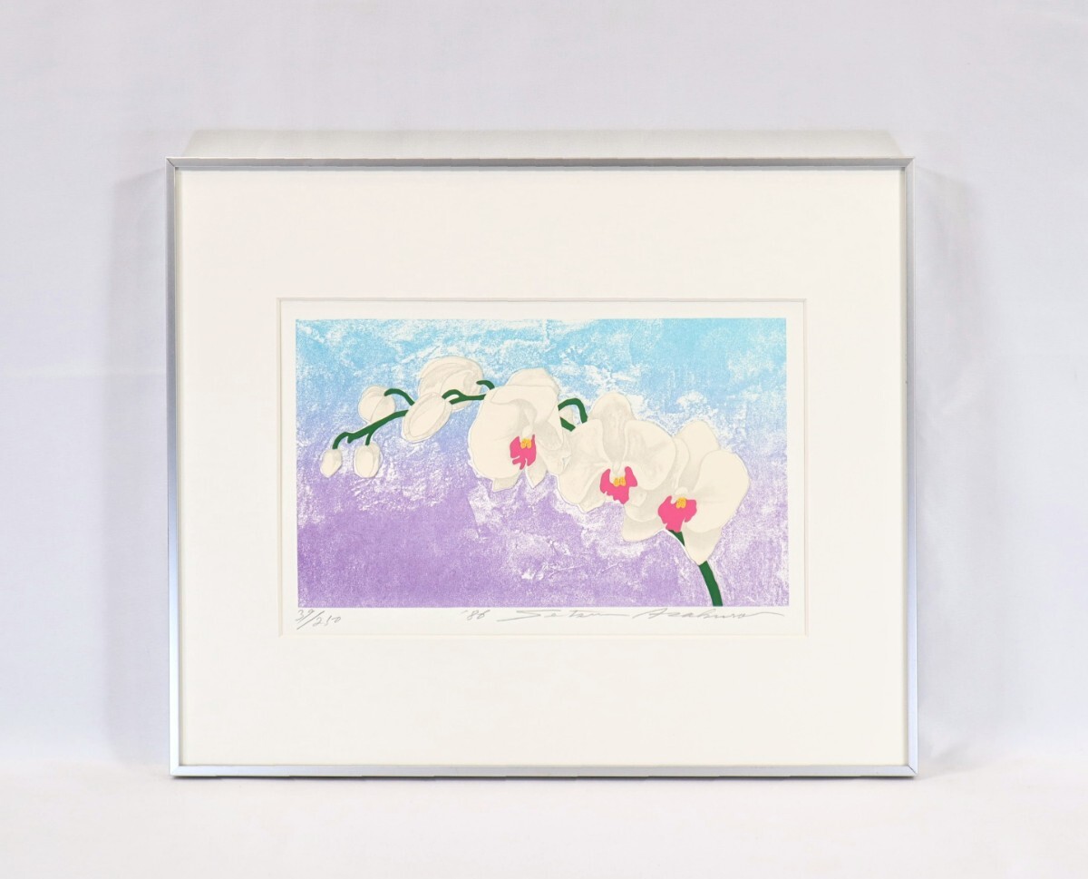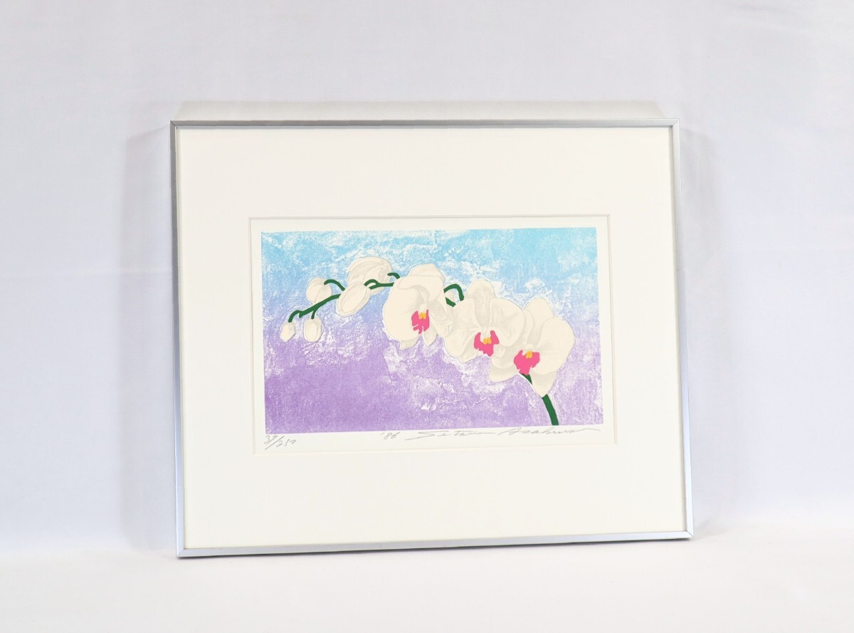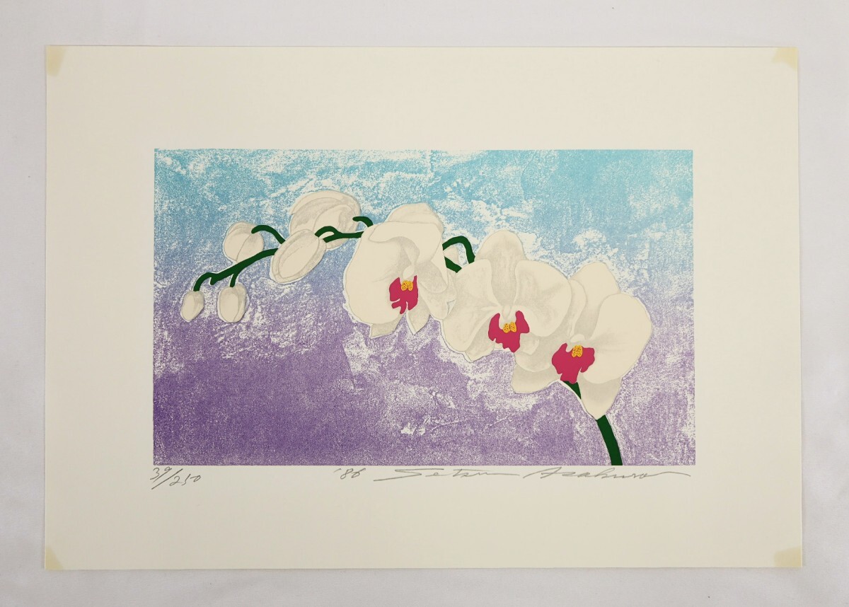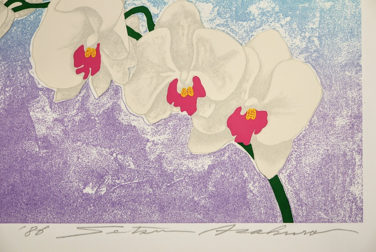真作 朝倉摂 1986年リトグラフ「蘭」画 28cm×16.5cm 東京都出身 舞台美術家 伊東深水に師事 蜷川幸雄演出の美術担当 瑞々しい胡蝶蘭 10664