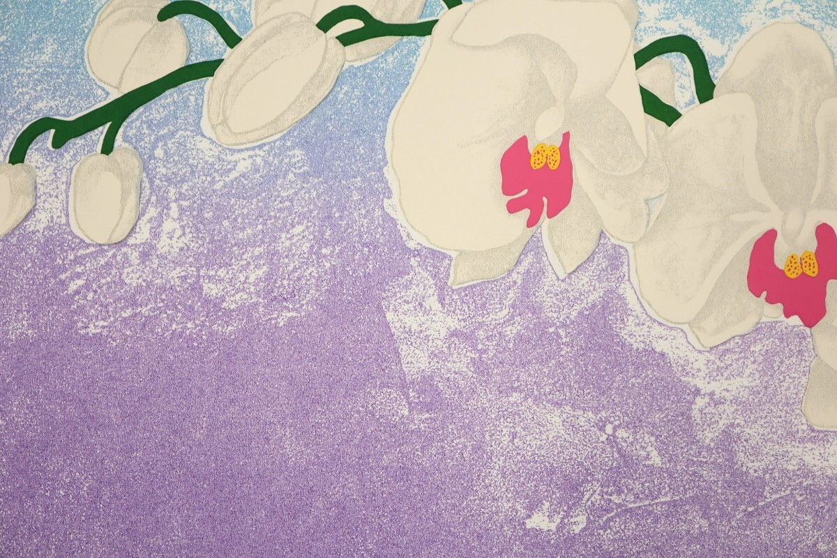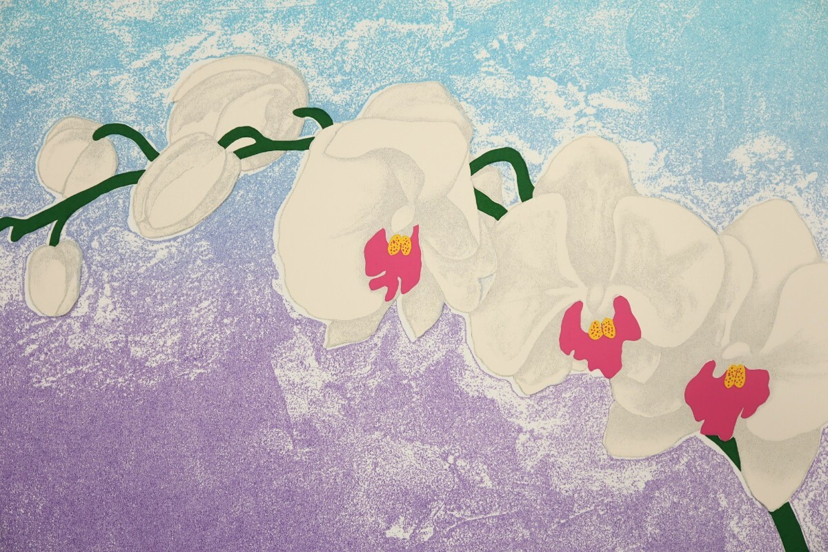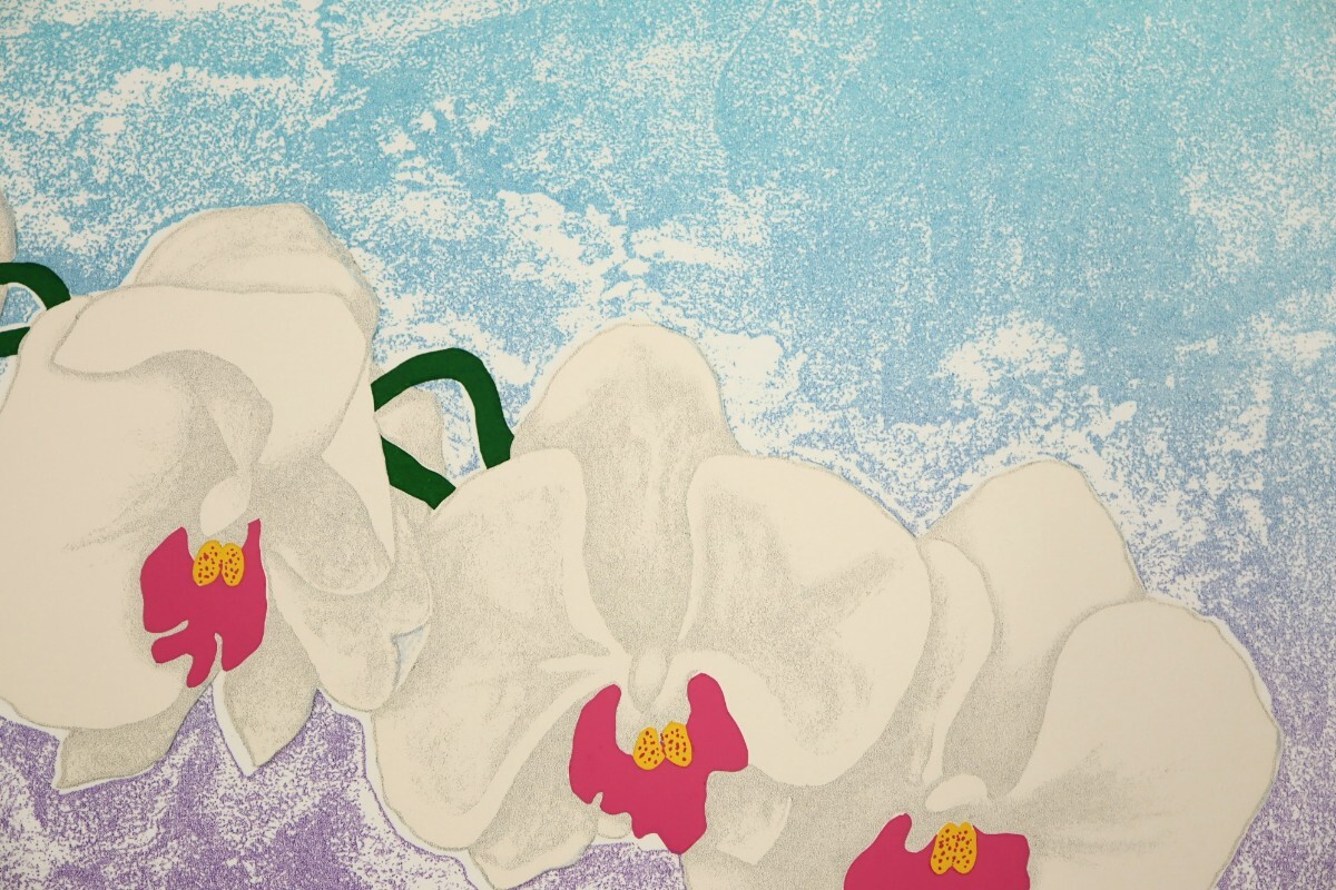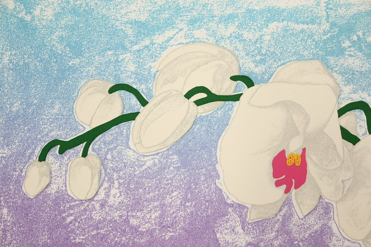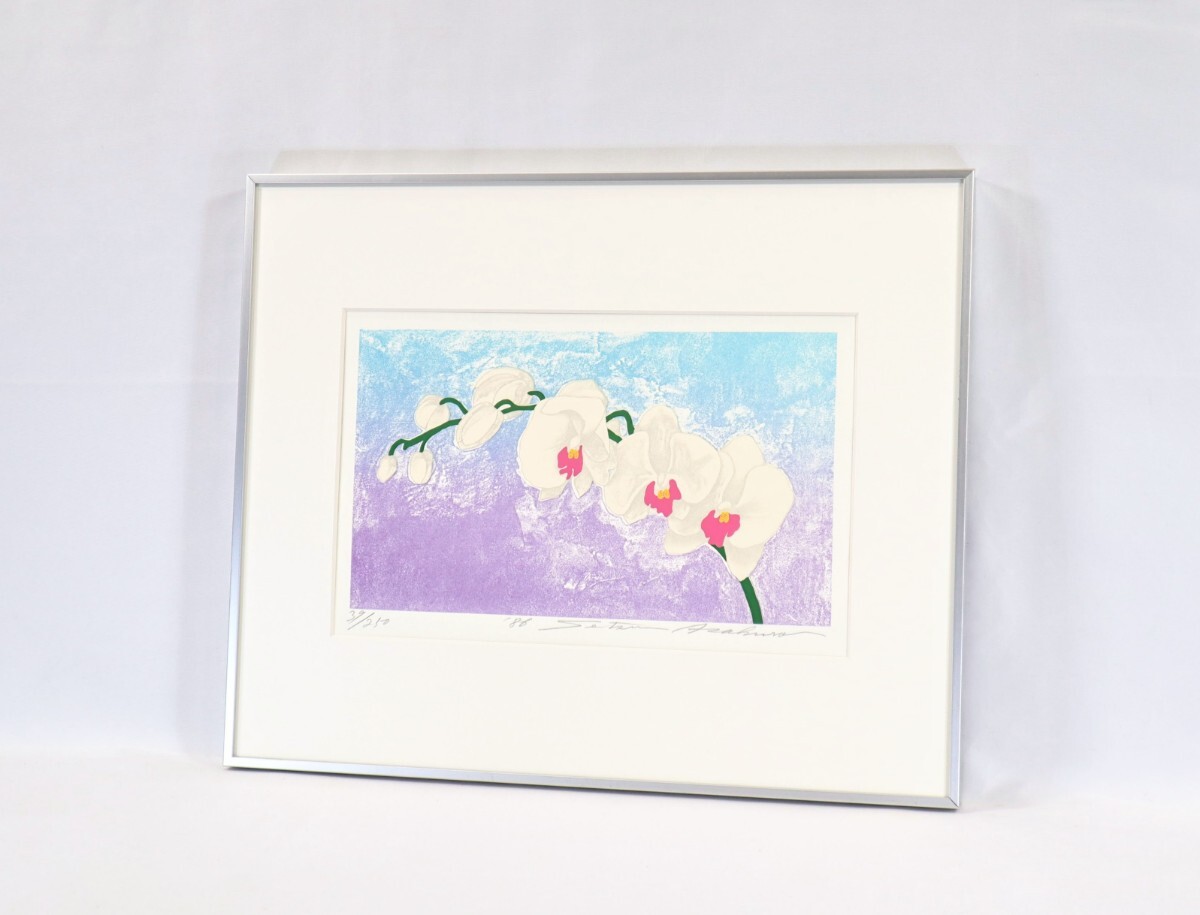 真作 朝倉摂 1986年リトグラフ「蘭」画 28cm×16.5cm 東京都出身 舞台美術家 伊東深水に師事 蜷川幸雄演出の美術担当 瑞々しい胡蝶蘭 10664