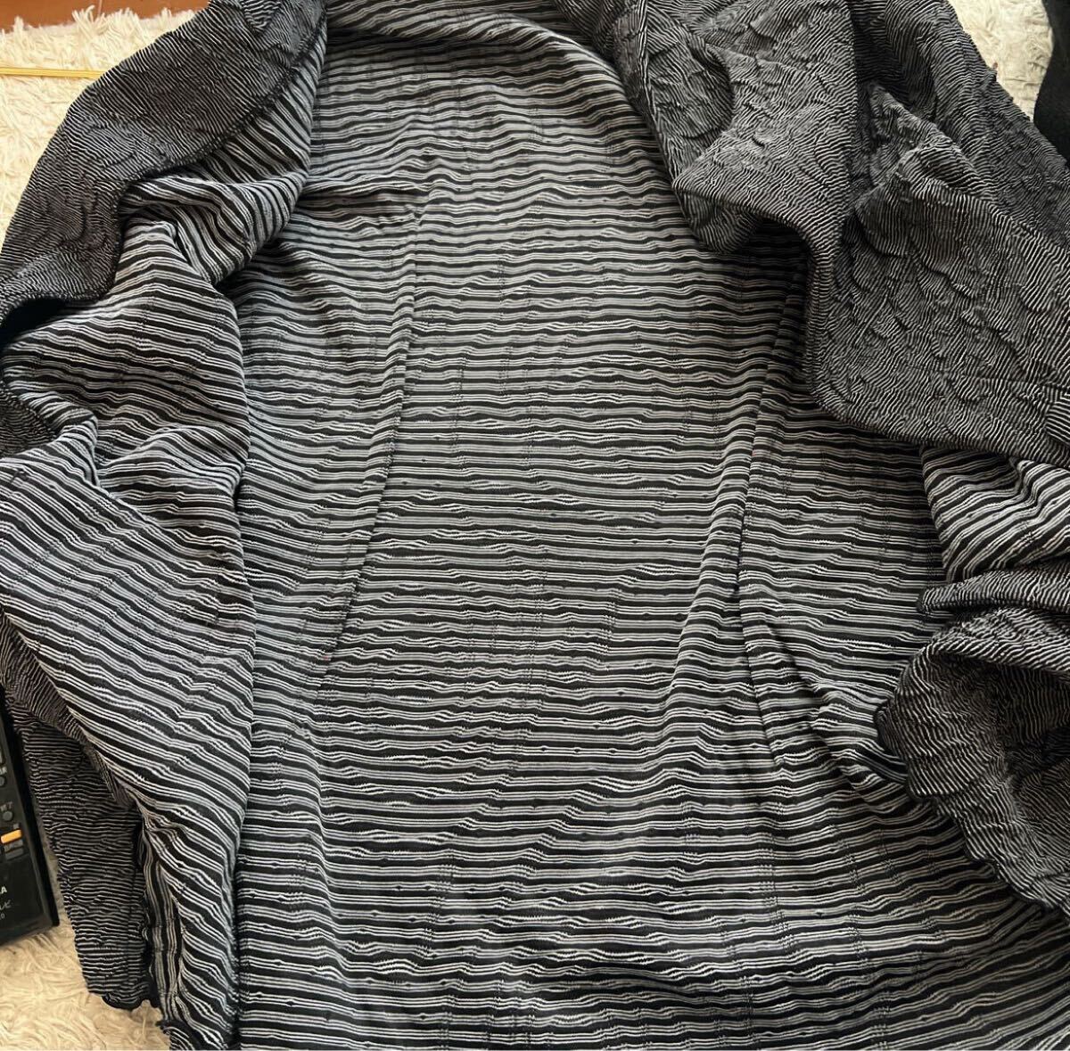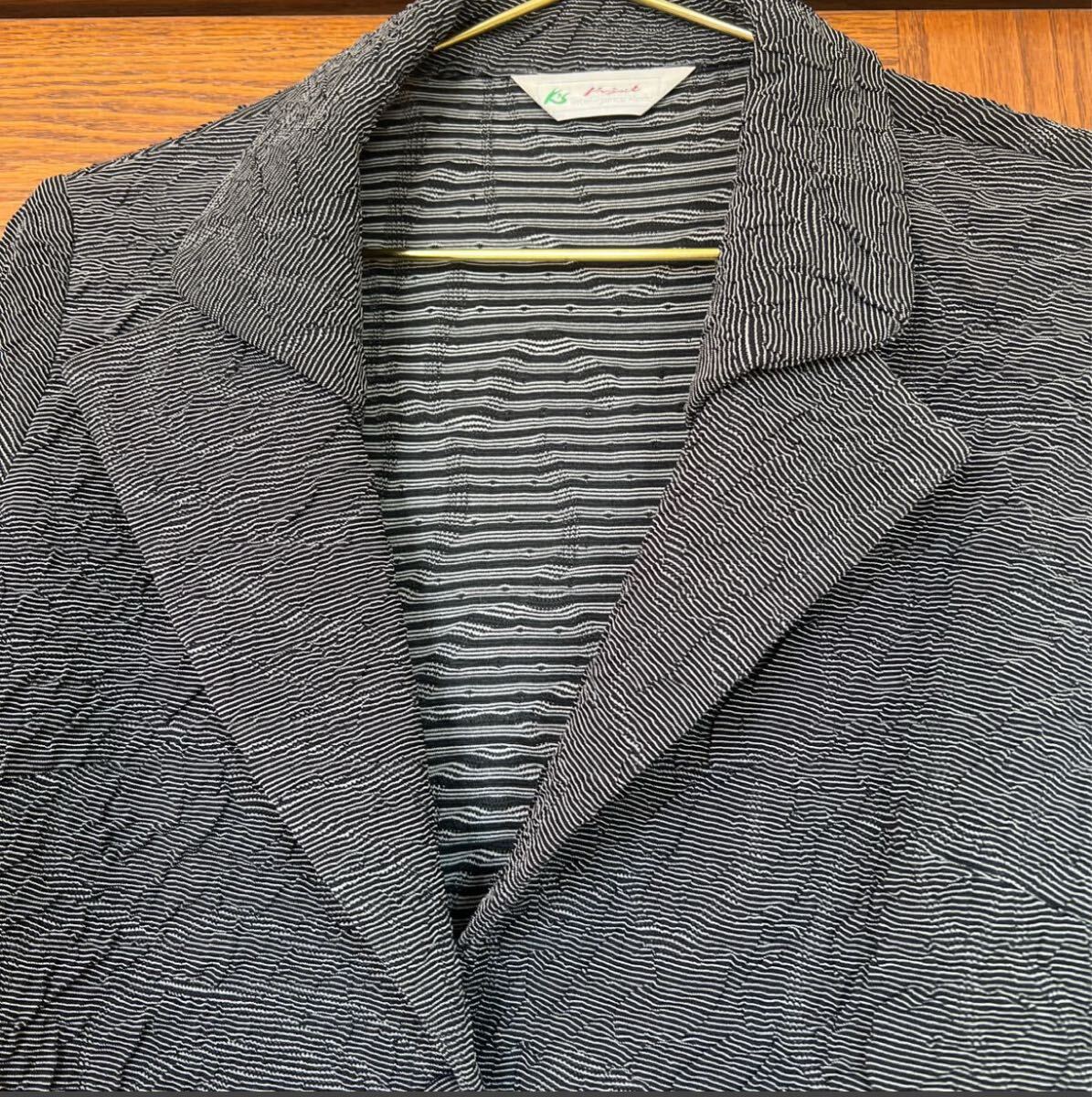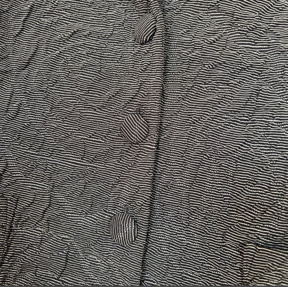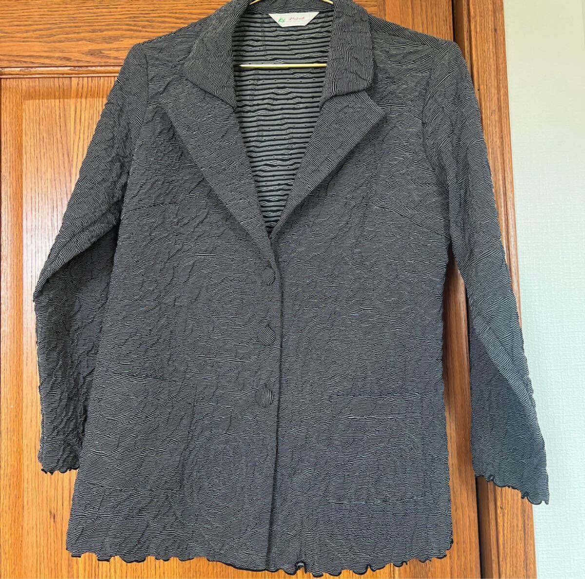 このテーラードジャケットは、クレープ状のテクスチャーが特徴で、シンプルながらも個性的な印象を与えます。波型の裾や袖口がアクセントとなり、カジュアルにもフォーマルにも合わせやすいアイテムです。