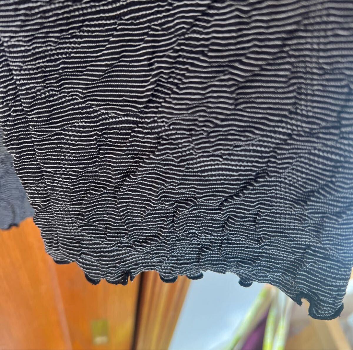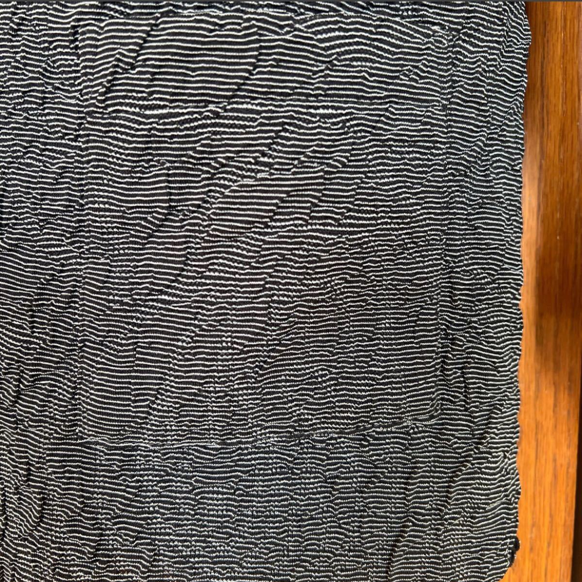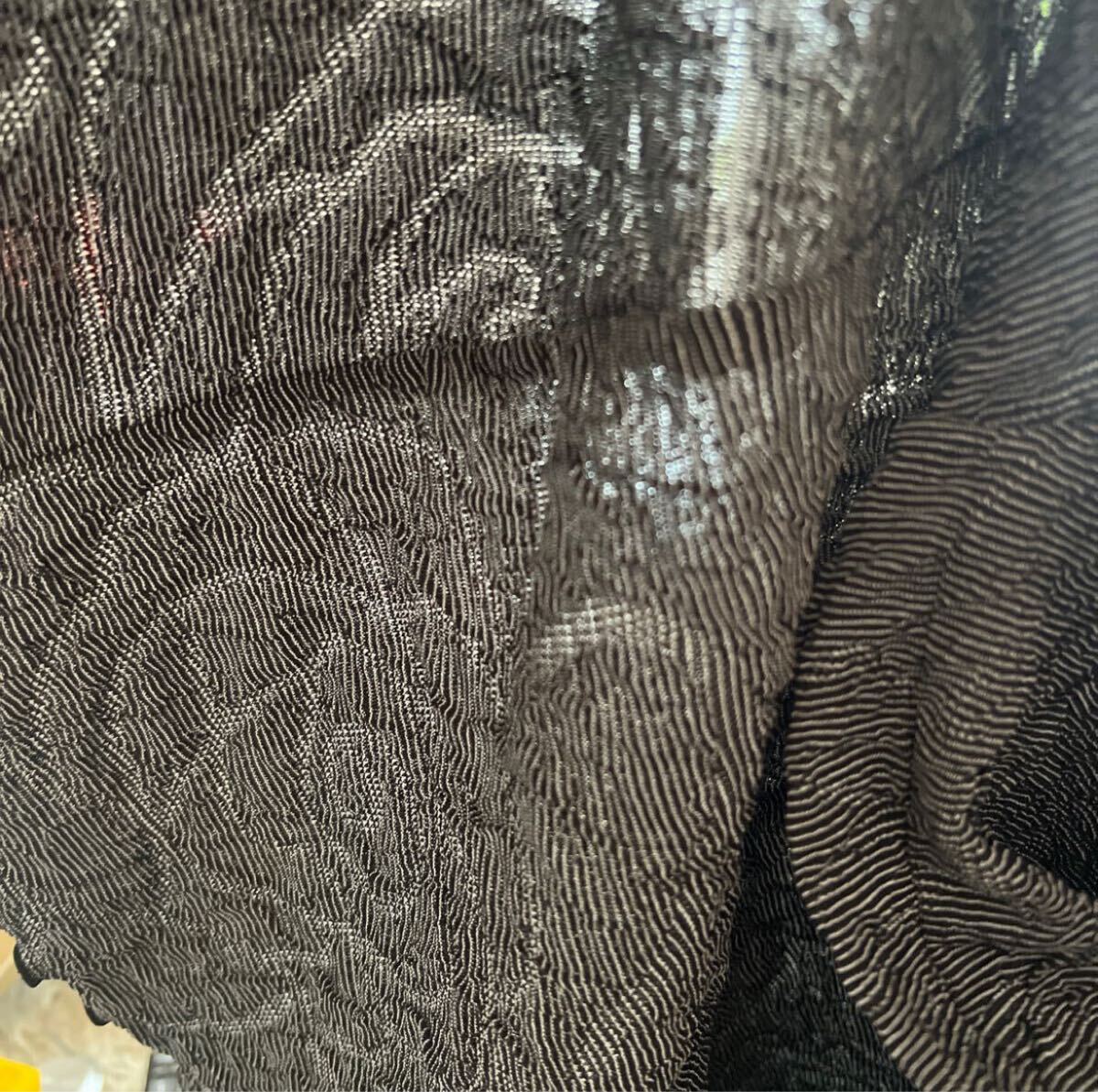 ちりめんのようなくしゅくしゅした伸縮性のある生地に大ぶりなローズが透けて見え、裏地はまた違ったボーダーのような、色はシンプルながら凝ったデザイン。