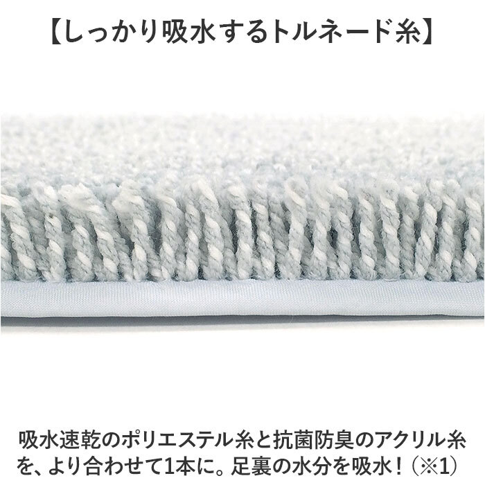 | 商品説明 | ・・【至福の2度拭きで快適な使い心地】 ・・2種のマットを1枚に♪「実はすごいバスマット ニド」60x60cmサイズ。 ・【2ステップ吸水!さっぱりふわふわ】 ・しっかり吸水するトルネードマット&足触りが心地良い極細ポリエステル糸マットで至福の体験☆ ・【しっかり吸水するトルネード糸】 ・吸水速乾のポリエステル糸と抗菌防臭のアクリル糸を、より合わせて1本に。足裏の水分を吸水! ・(※1)さっぱりした短めのパイルで吸水します。 ・【へたりにくく長く使えるのが嬉しい】 ・使うほどに納得!長く愛用してもへたりにくい仕上がりで、足裏を優しく受け止める◎ ・【ふんわり吸水、極細ポリエステル糸】 ・脚が沈み込む程長めのパイルが足指の間に残った水分を優しく吸水。ボリュームのある踏み心地。 ・【滑りを防いで安全面にも配慮】 ・裏面には滑りにくい加工をプラス。マットのズレを軽減できるのもポイント。 ・【丸洗い&防カビ加工で清潔をキープ】 ・ネットに入れて、洗濯機洗いOK!裏面に防カビ加工を施し、カビの発生や繁殖を抑える◎ ・(※2)全てのカビ菌に対して効果があるわけではございません。洗濯機の弱モードを使用してください。一部のドラム式洗濯機では、洗濯や脱水ができない場合がございます。 ・【空間に馴染むナチュラルカラー】 ・温かみのある風合いを演出する、カラーバリエーション。バイカラーがアクセント♪ |