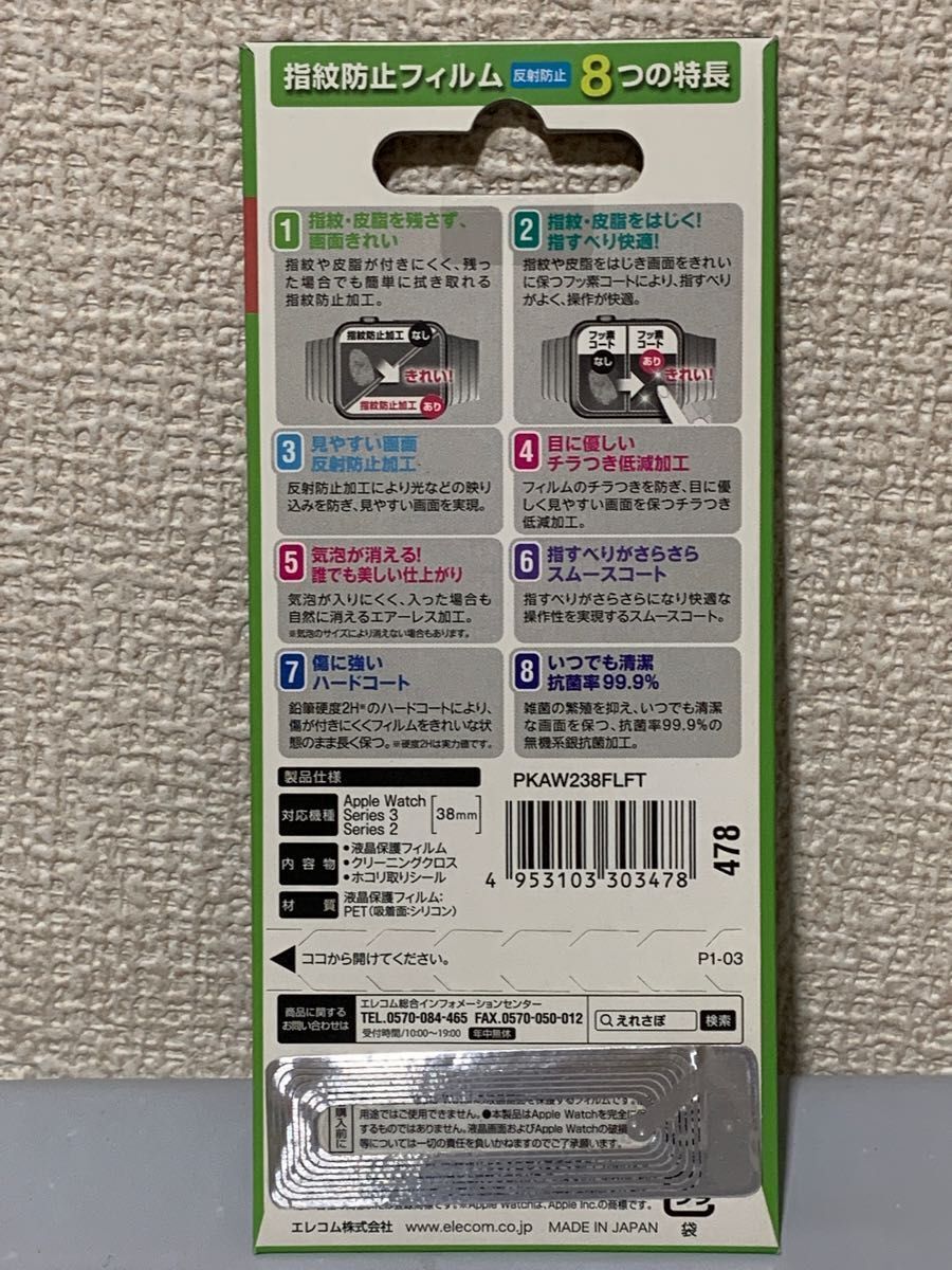 Apple Watch 38mm PKAW238FLFT 指紋防止フィルム シリーズ2,3対応 a2 反射防止タイプ エレコム 匿名配送 クリーニングクロス付き