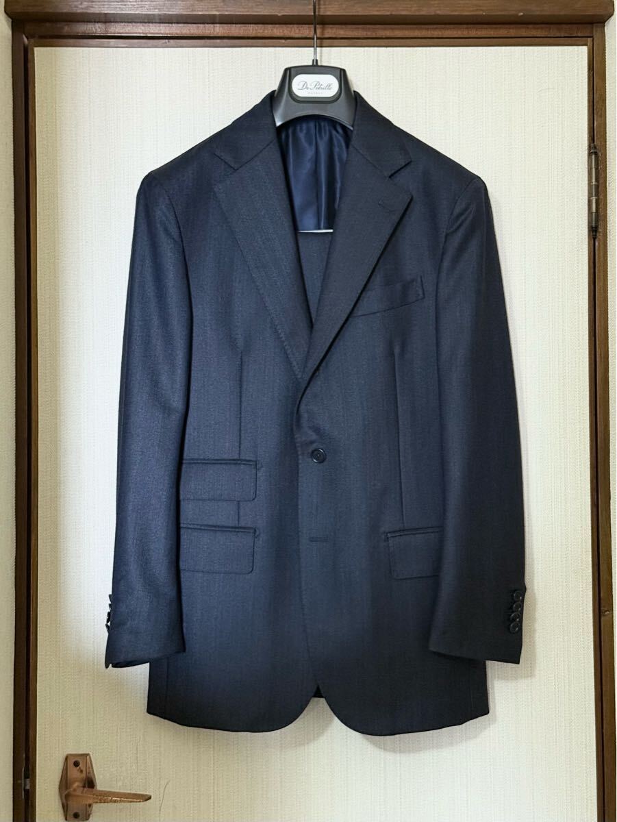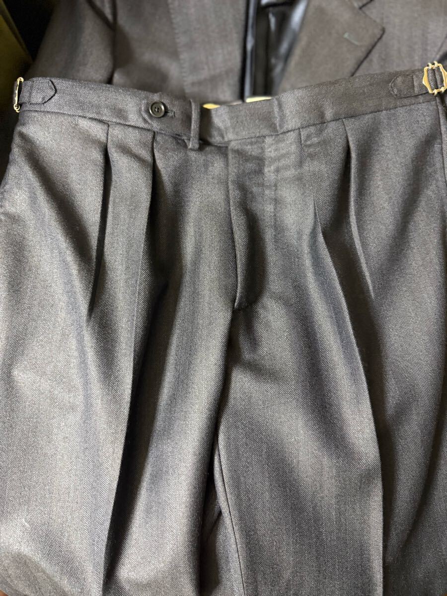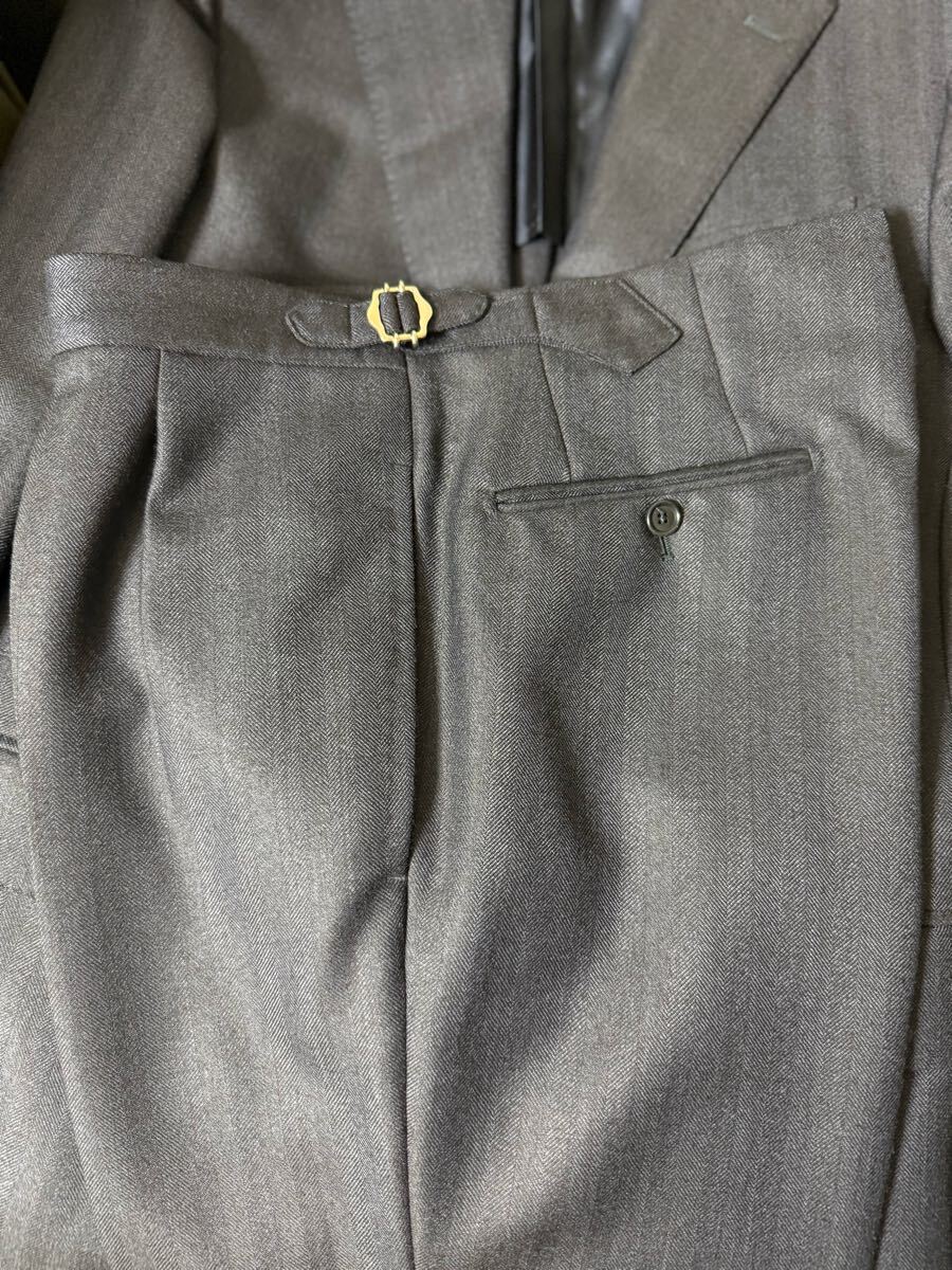 ナポリのファクトリーブランド De Petrilloのネイビーヘリンボーンウールスーツです。トラウザーズはベルトレスのサイドアジャスター仕様です。