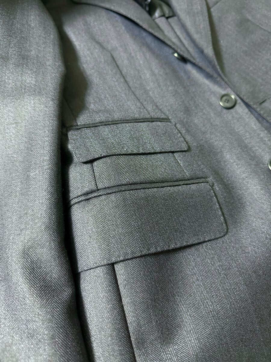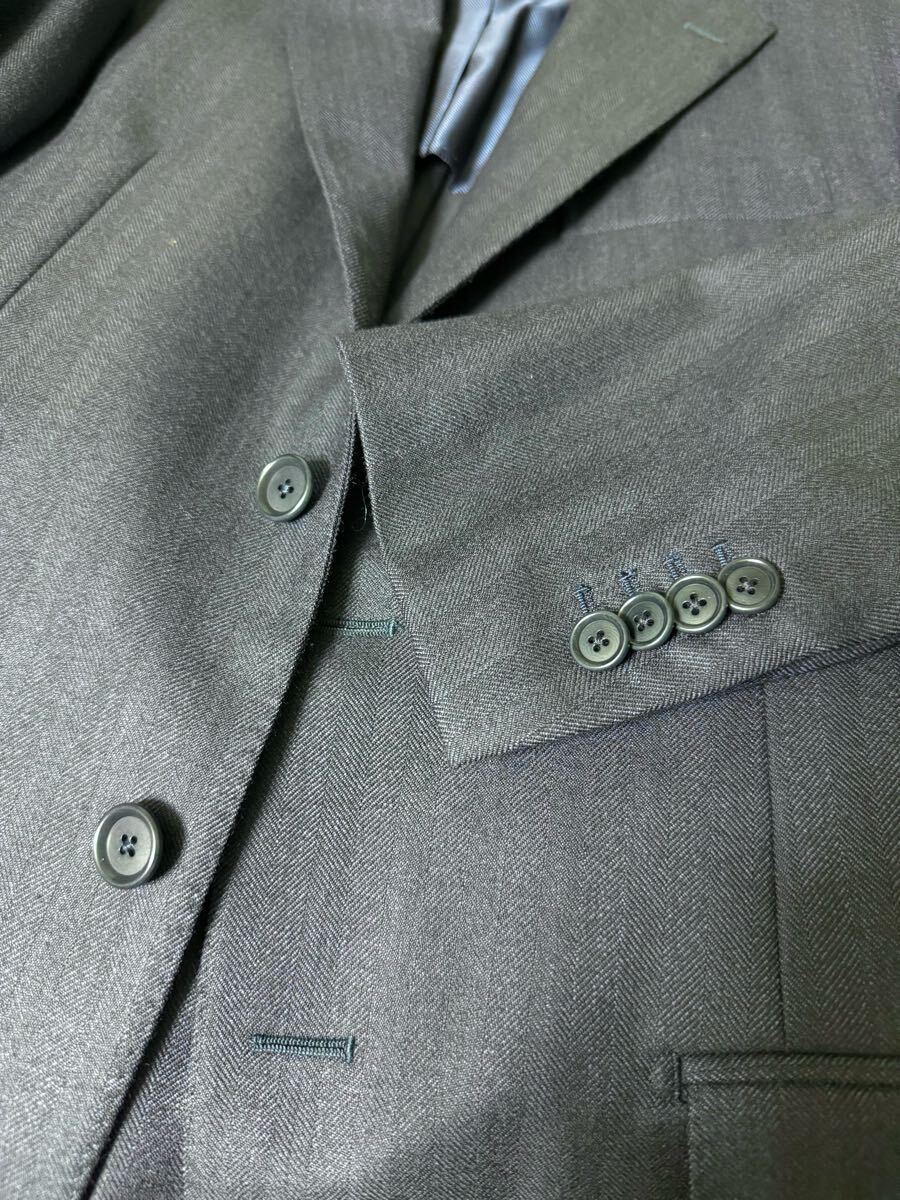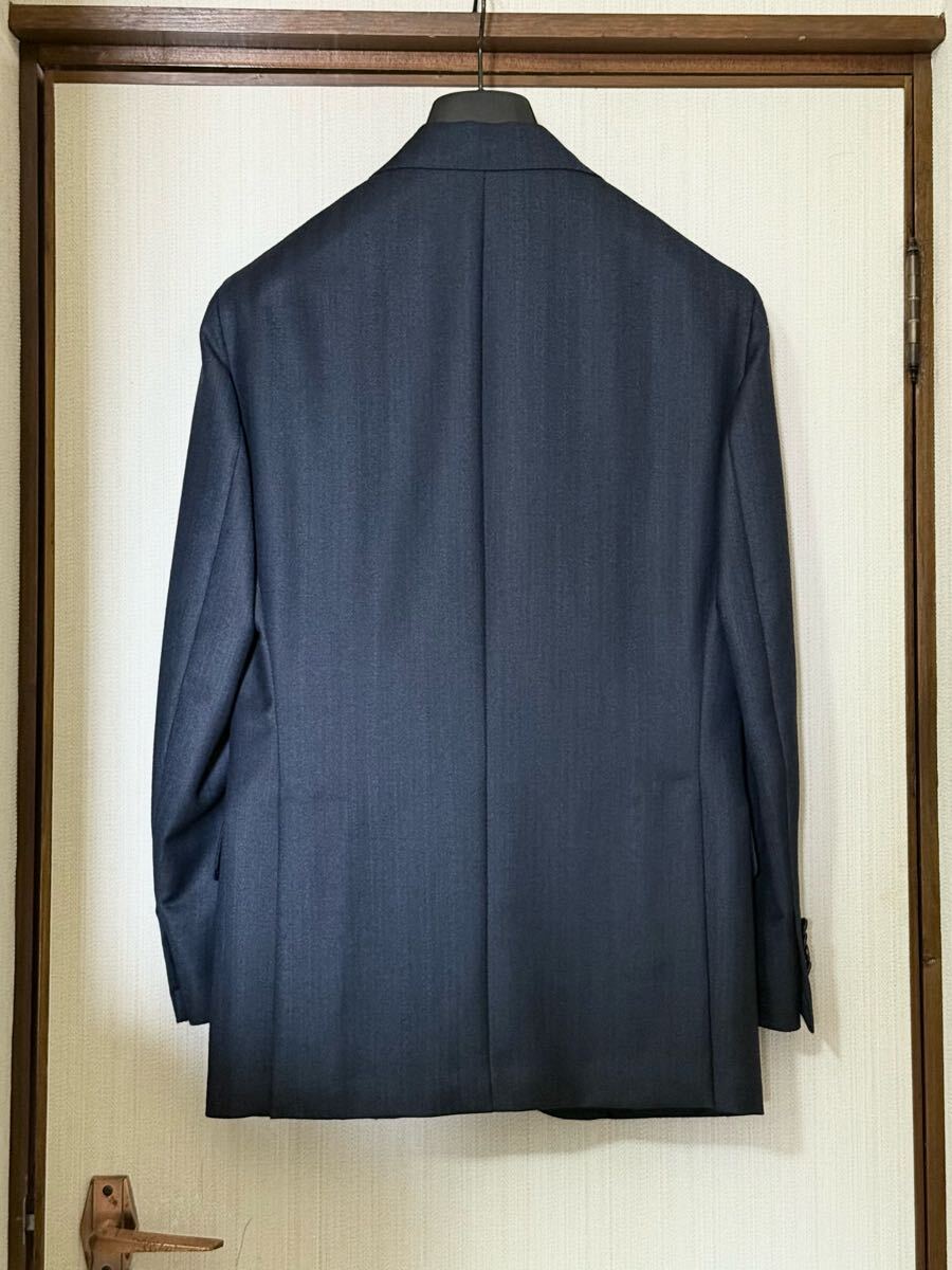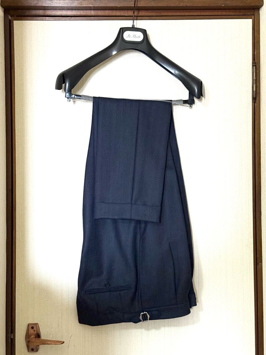 ナポリのファクトリーブランド De Petrilloのネイビーヘリンボーンウールスーツです。トラウザーズはベルトレスのサイドアジャスター仕様です。