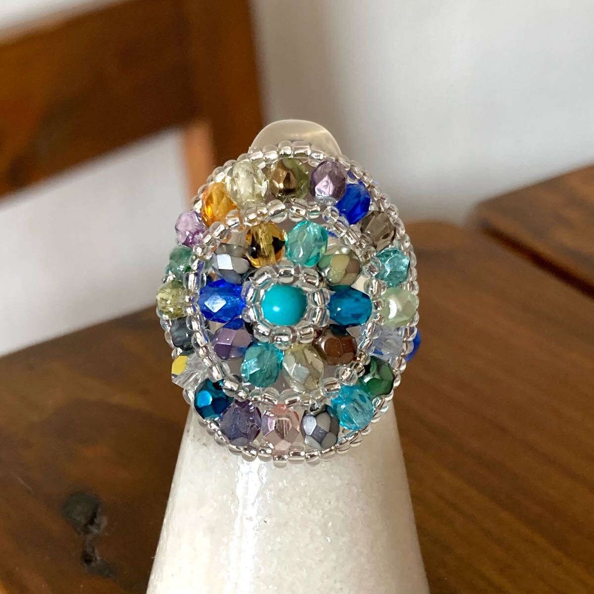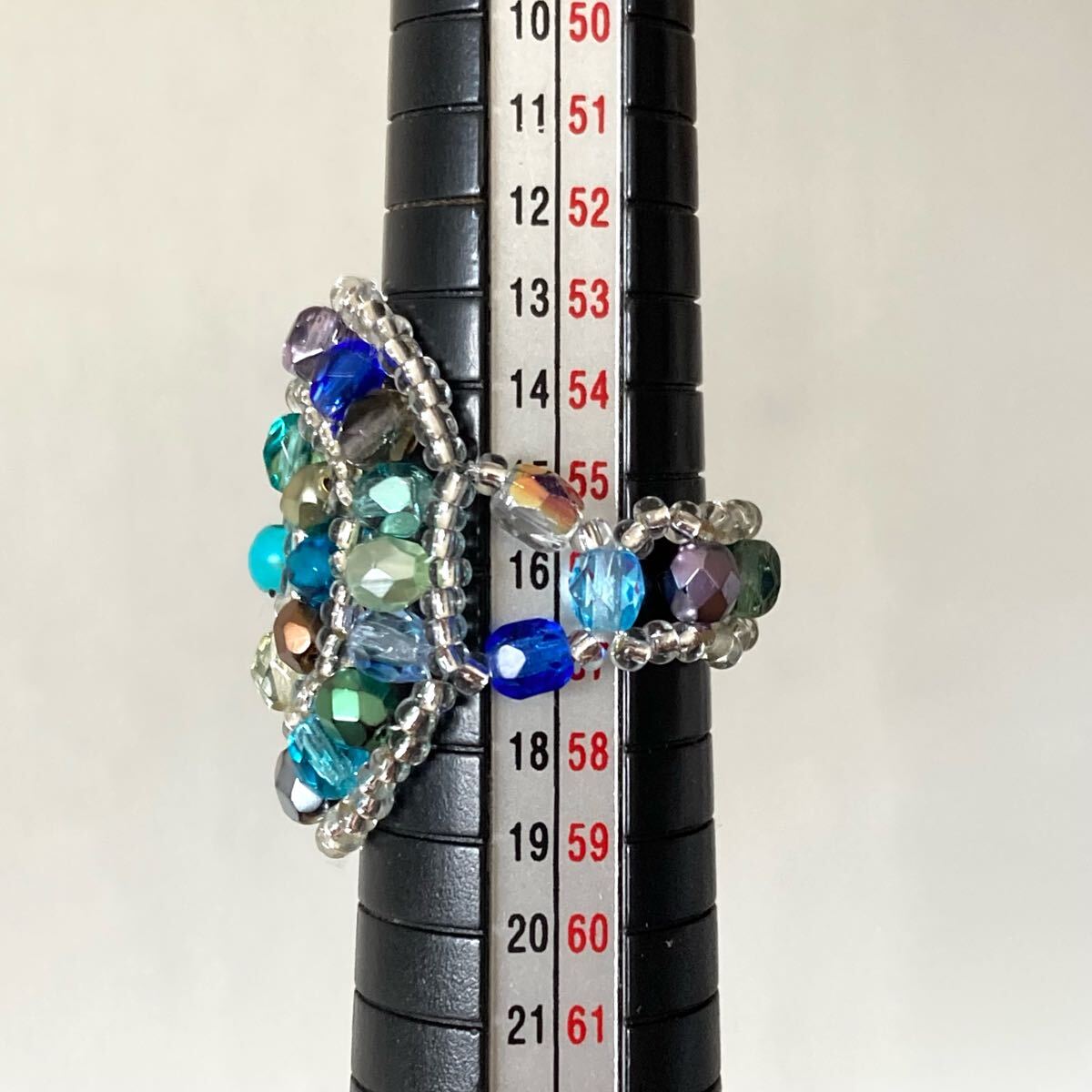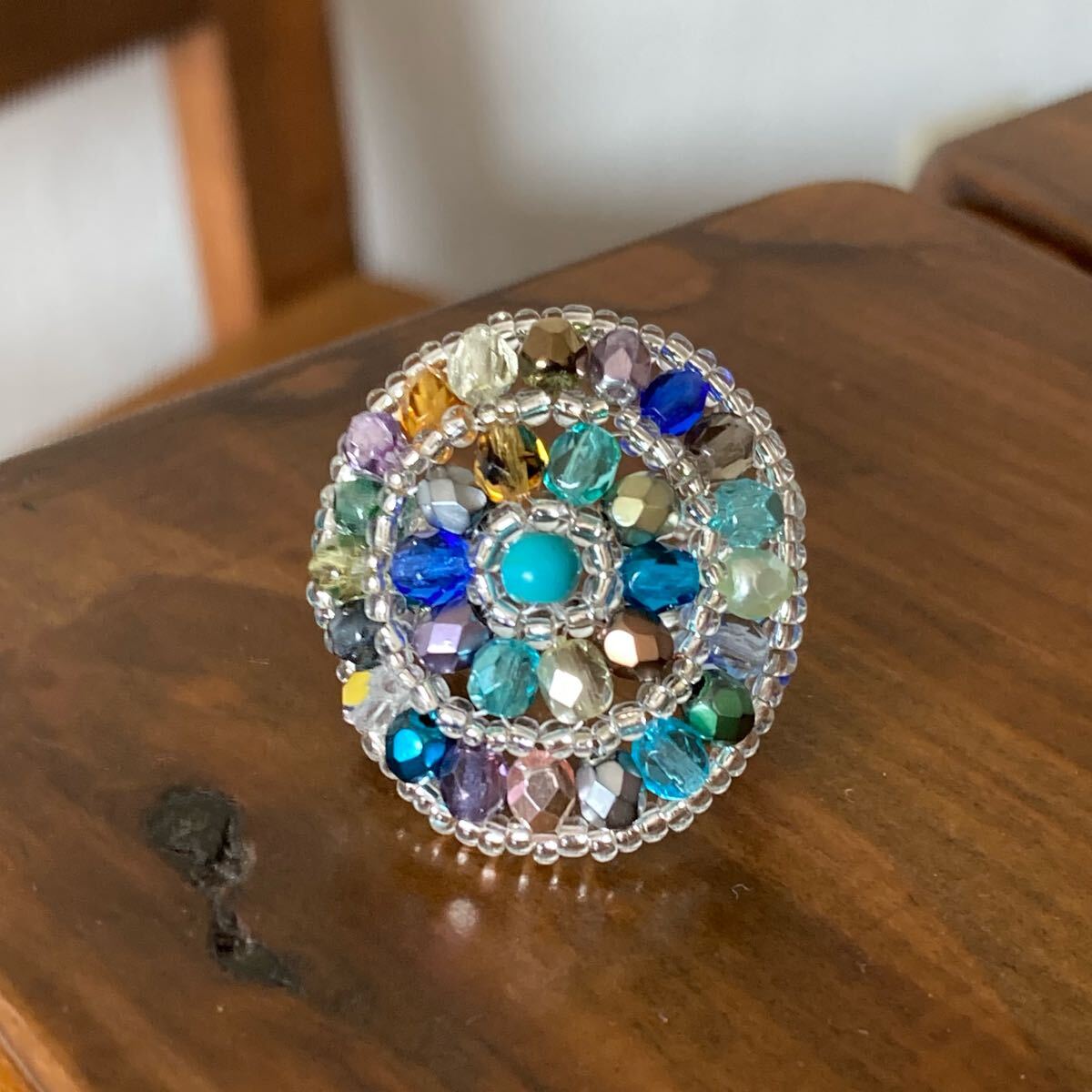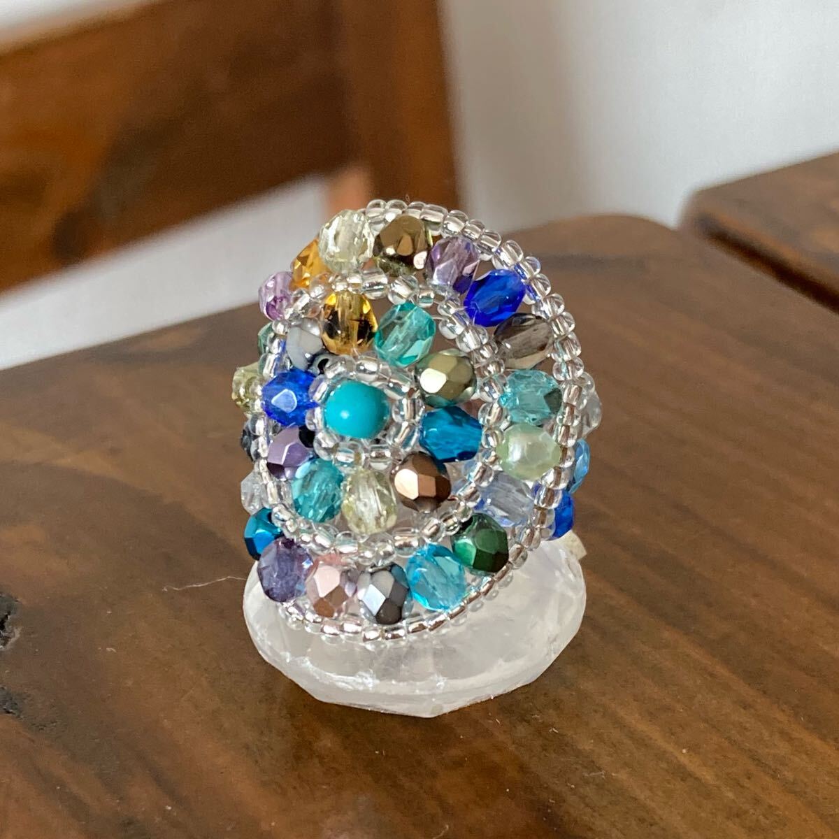 ビーズ  リング  指輪  ハンドメイド 大きい丸型 寒色系ミックス 15-17号です。