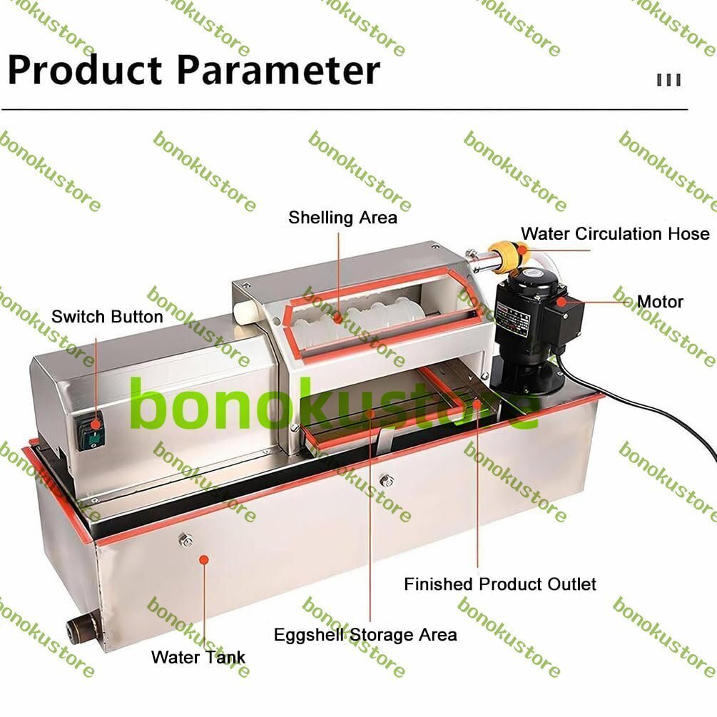 25W電気ウズラ卵殻むき機、70kg/hウズラ卵皮むき機、効率的な殻むき、低破損率、水循環優しい卵、ウズラの卵、鳥の卵の皮むき用仕様:名前: 電気ウズラ卵殻むき機電力: 25W効率: 70kg/h製品サイズ: 73x24x33cm重量: 15kg状態: 新品ユニット数: 1標準製品ID: 1包装内容明細書:1×商業ウズラ卵殻剥き器特徴:- 市販のウズラ卵殻剥き機は、卵の殻を手で割る貴重な時間を費やすことなく、数秒で簡単にウズラの卵を剥くことができます。- 304ステンレス鋼の本体と食品グレードのホースにより、ウズラ卵殻むき機は安全で信頼性の高い皮むきツールとなり、掃除とメンテナンスが簡単です。・卵の殻をむく際に水をリサイクル・再利用する革新的な水循環技術を搭載。