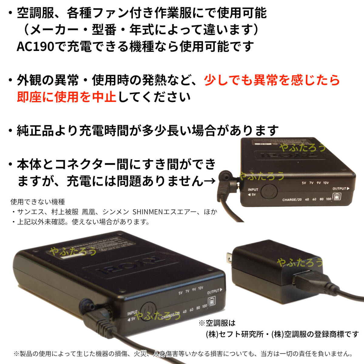 | 商品説明 | ・バートルAC190互換品 ・対応バッテリー AC260、AC230、AC210、AC140、AC130、AC100 ・長さ1.2m 車内の充電でもバッテリーの置き場に困りません。 ・取り回しの楽なスリムケーブル・スリムコネクター ・各種空調服・ヒートベスト・温熱ベスト・ヒーターベスト等のバッテリーの充電に使用可能です。 ・新品未使用品 ・バートル以外の数多くのバッテリーに対応していますが、バートル以外は動作確認できていません。 ・5V2A以上のUSB充電器をご使用ください。 下記6メーカーは対応しません。 ・サンエス ・村上被服 鳳凰 ・シンメン SHINMENエスエアー ・ワークマン ・リンクサス ・ミドリ安全 バートル BURTLE air craft クロダルマ Kurodaruma airsensor-1 アタックベース ビッグボーン bigborn コーコス ディッキーズ アイトス AITOZ DirectCooling 自重堂 タカヤ商事 Grancisco ジーベック DirectCooling 寅壱 中国産業 WINDZONE 大川被服 桑和 ミズノ コーコス信岡 CO-COS 日新被服 山田辰 ベスト Best ジンナイ Jinnnai |