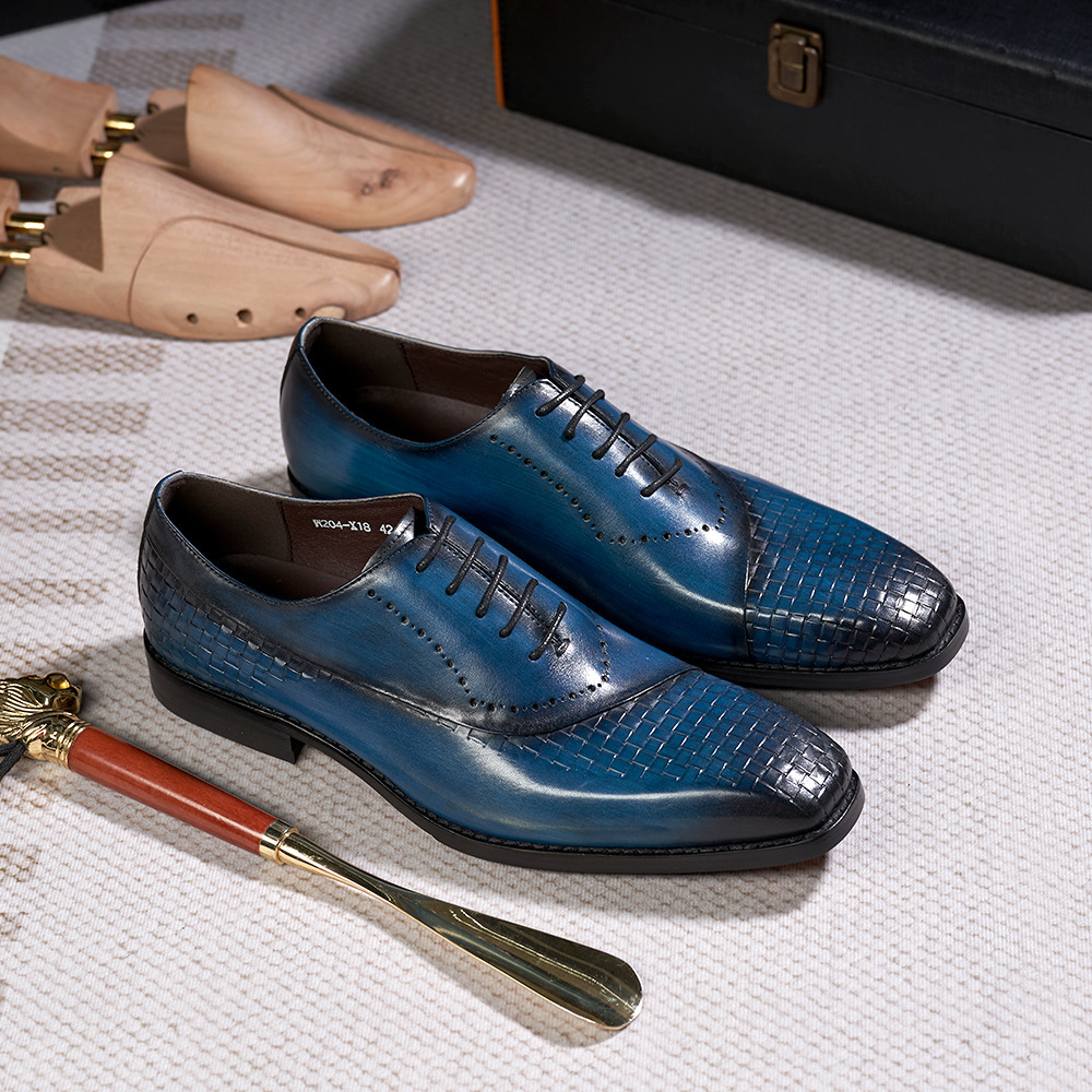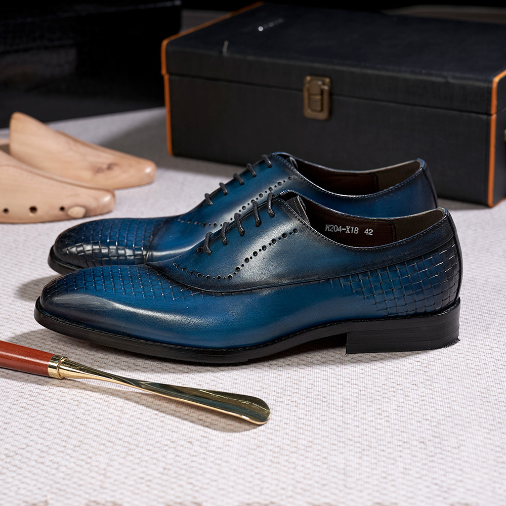人気品ビジネスシューズ 本革 編み込み レザーシューズ 職人手作り 手塗り上げ 牛革 革靴 紳士靴 個性 フォーマル 宴会 ブルー24.5~28cm