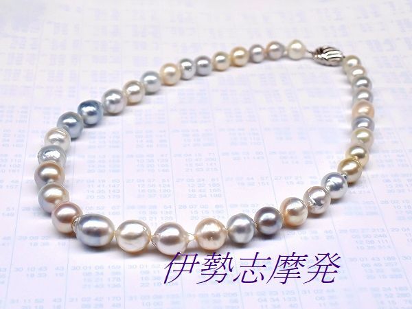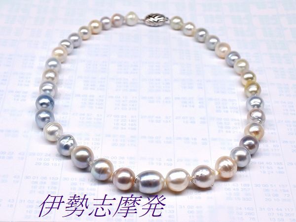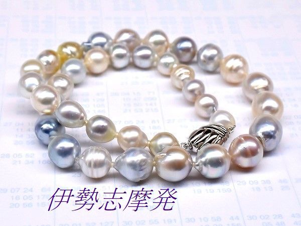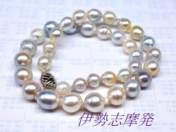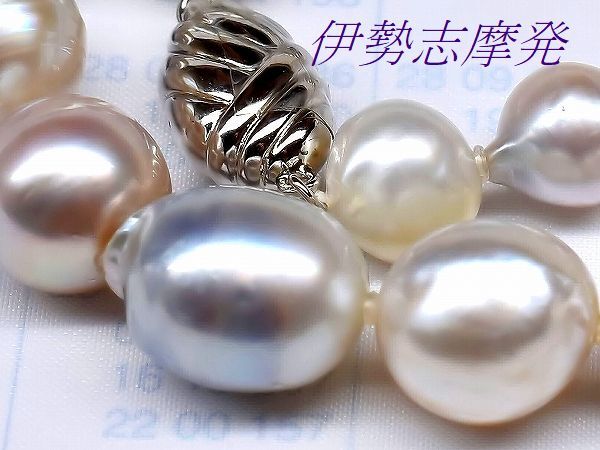 【真珠の種類】 南洋白蝶ナチュラル真珠 【珠サイズ】 センター12,16㎜と15,5㎜x11,8㎜ 端珠で9,3㎜ 【珠の形状】 形の綺麗なセミバロック珠 【色】 シルバーグレーやホワイトピンク等 【巻き】 非常に良い◎ 【照り】 非常に良い◎ 【キズ】 あり・多少 【エクボ】 あり・多少 【金具の材質】 ロジウムシルバーワンプッシュ 【デザインの大きさなど】クラスプを含んで全長44,5cm ◆ 自然な形の持つ穏やかさが胸元を優しく包み込む、お洒落なネックレスです。◆ 大粒で気品のある輝きを放つ白蝶真珠!照りの強い上品なホワイト・シルバーグレー珠です。年齢を重ねた大人の女性だからこそエレガントで上品に身につけられるアイテム。 形の綺麗なセミバロック珠で、同じ形が存在しない個性を象徴する味のある珠です。センターには12,16㎜と15,5㎜x11,8㎜の大珠でをセットした存在感がある豪華なネックレスです 天然真珠のセミバロック珠ですので、えくぼやキズは混ざります。華やかな席やお食事会など、結婚式や同窓会ご旅行にも色んなシーンでお楽しみ下さい。 付け外しが行い易いワンプッシュクラスプ仕上げです。大人の女性なら一本は揃えたい大粒の南洋真珠ネックレス、是非この機会にお揃え下さいませ。 | ||||||||