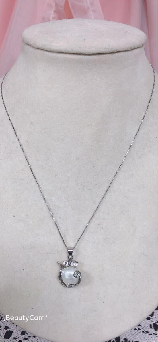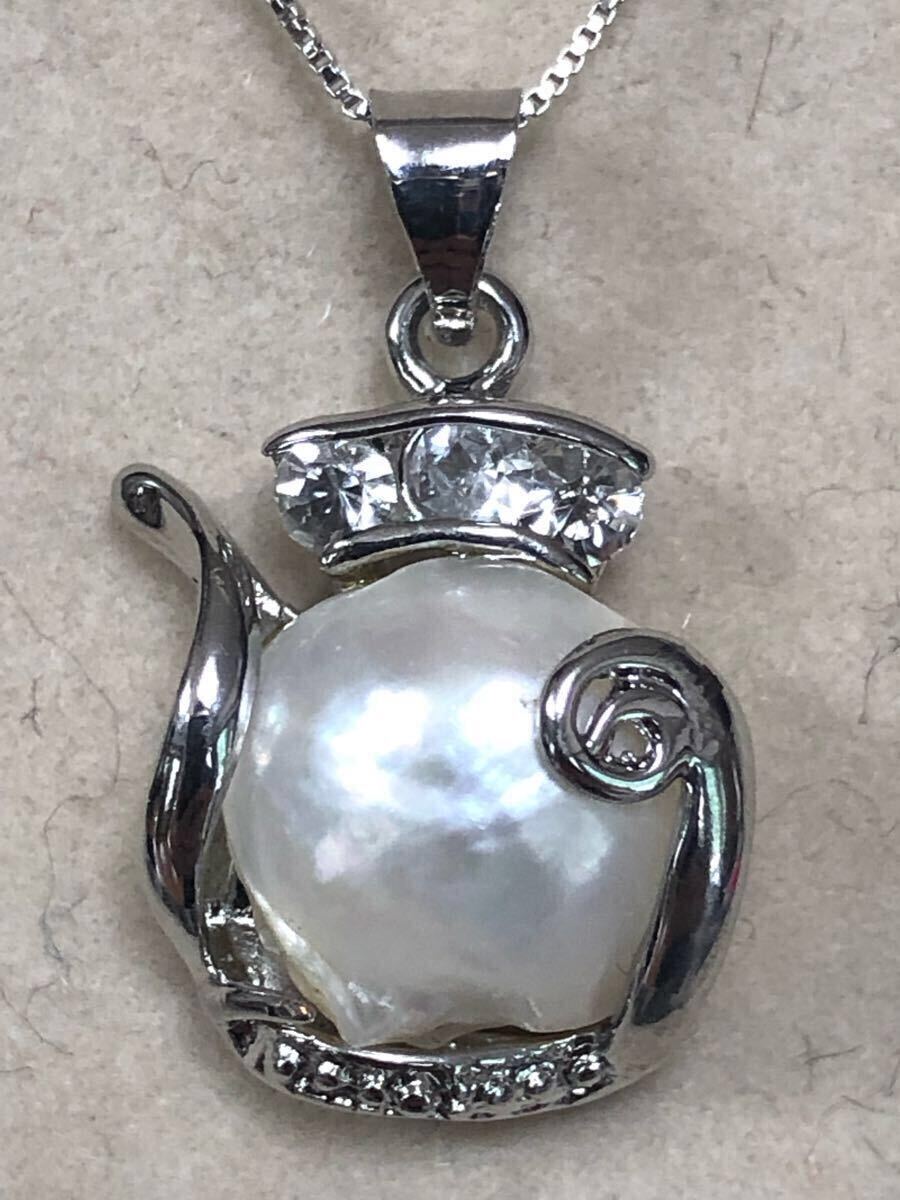 淡水パールを使用した花モチーフのネックレス、925刻印の銀製チェーン付き。