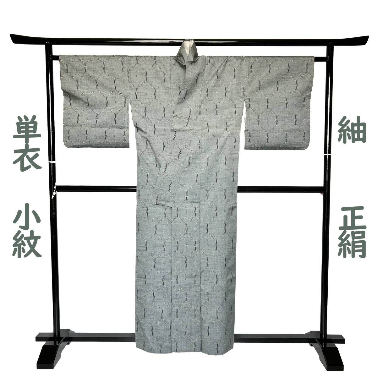 着物 胴単衣 正絹 小紋 紬 夏用 カジュアル セージグリーン 中古 仕立て上り M~Lサイズ 送料無料★