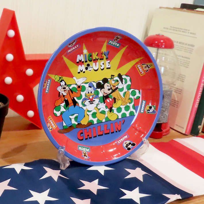部屋でくつろぐミッキー&フレンズのトレーです。