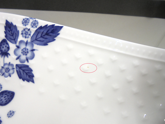 デジカメでは写せませんでしたが花の絵柄部分に小キズがあり、製造過程についたのか茶色の点有り(画像3赤丸参照)。