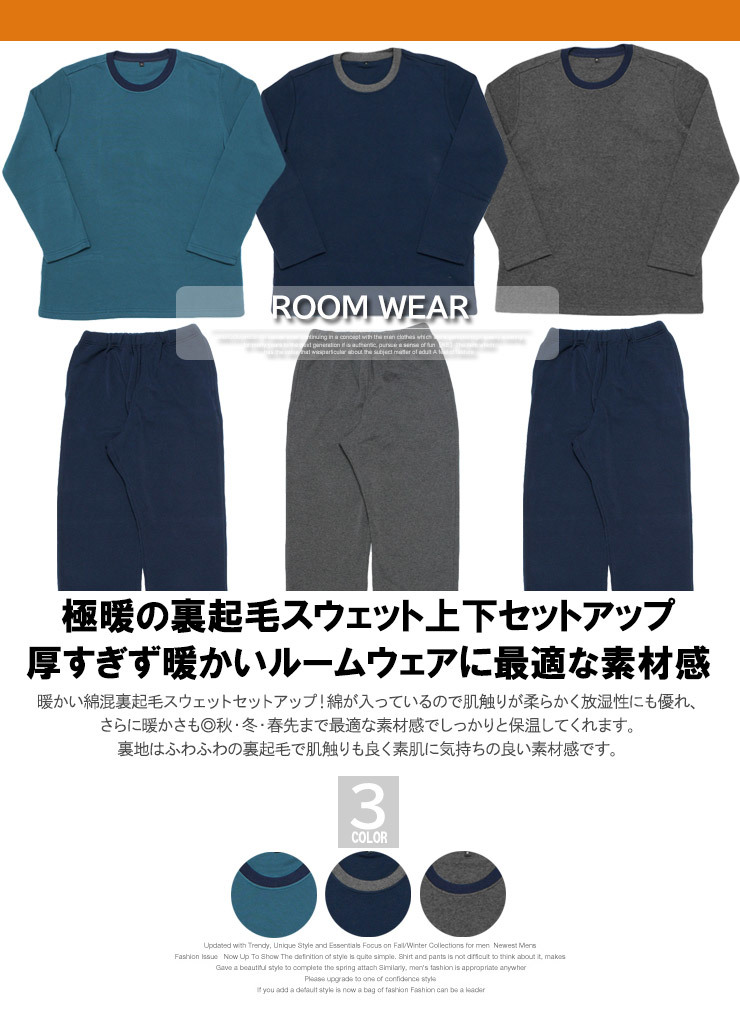 | 商品説明 | あったか裏起毛素材の無地スウェットトレーナーとスウェットパンツの上下セットアップです。 |