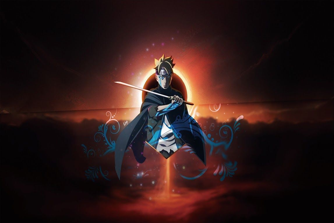 幻想的な赤い空と、日蝕を背景にしたボルトの勇ましい姿が描かれています。