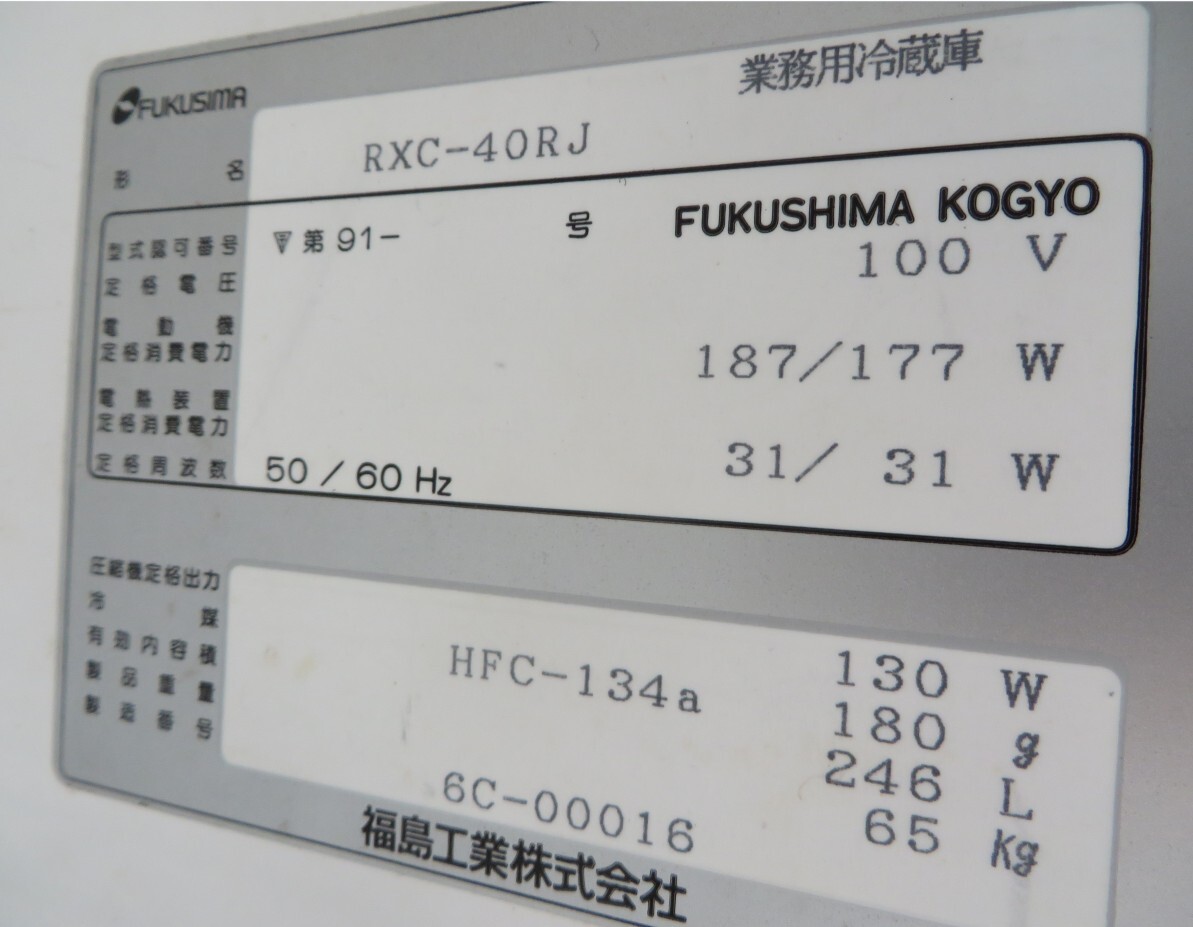 X-504奈良発!フクシマ 246L  業務用冷蔵庫 RXC-40RJ  中古 動作品