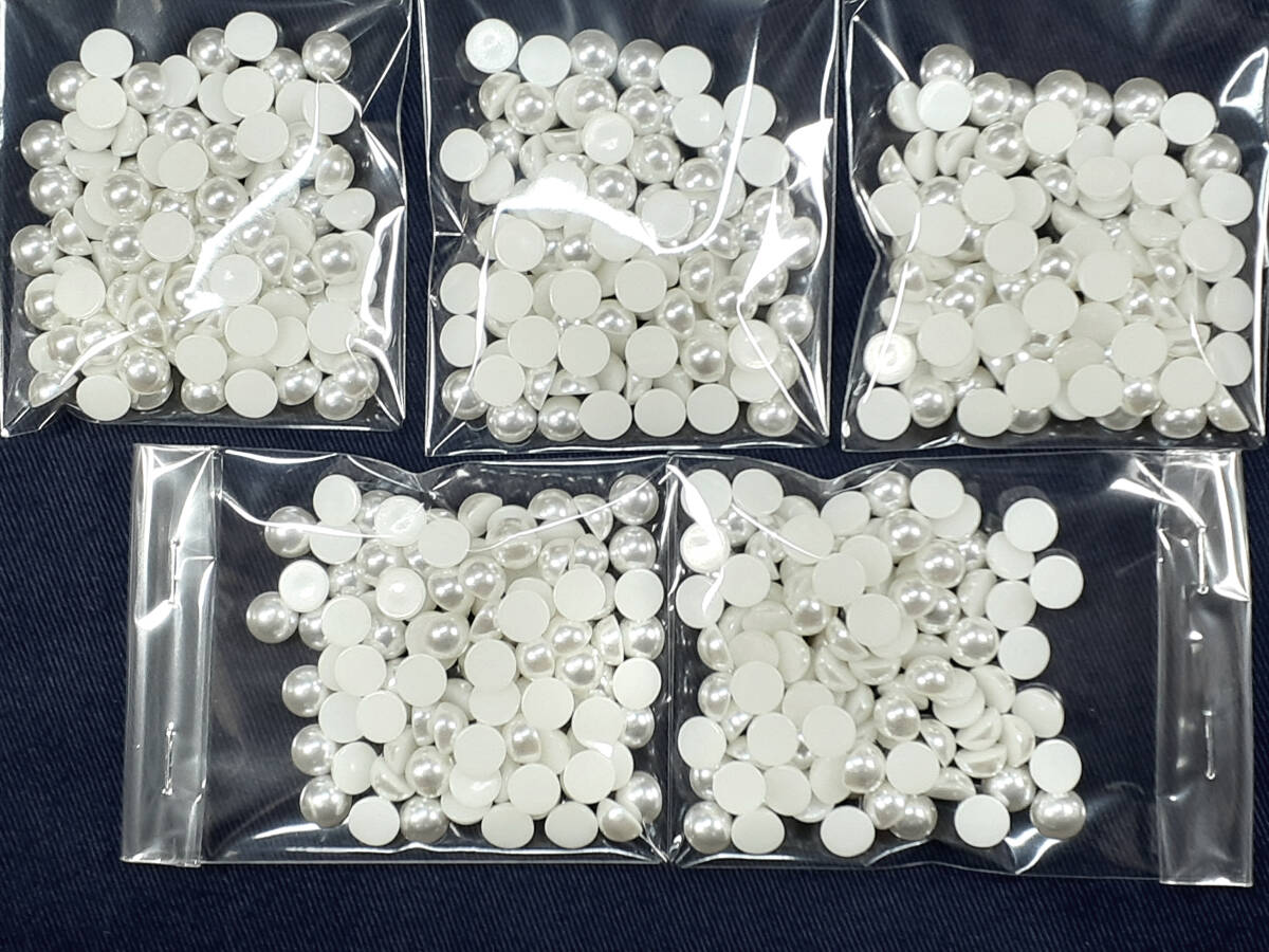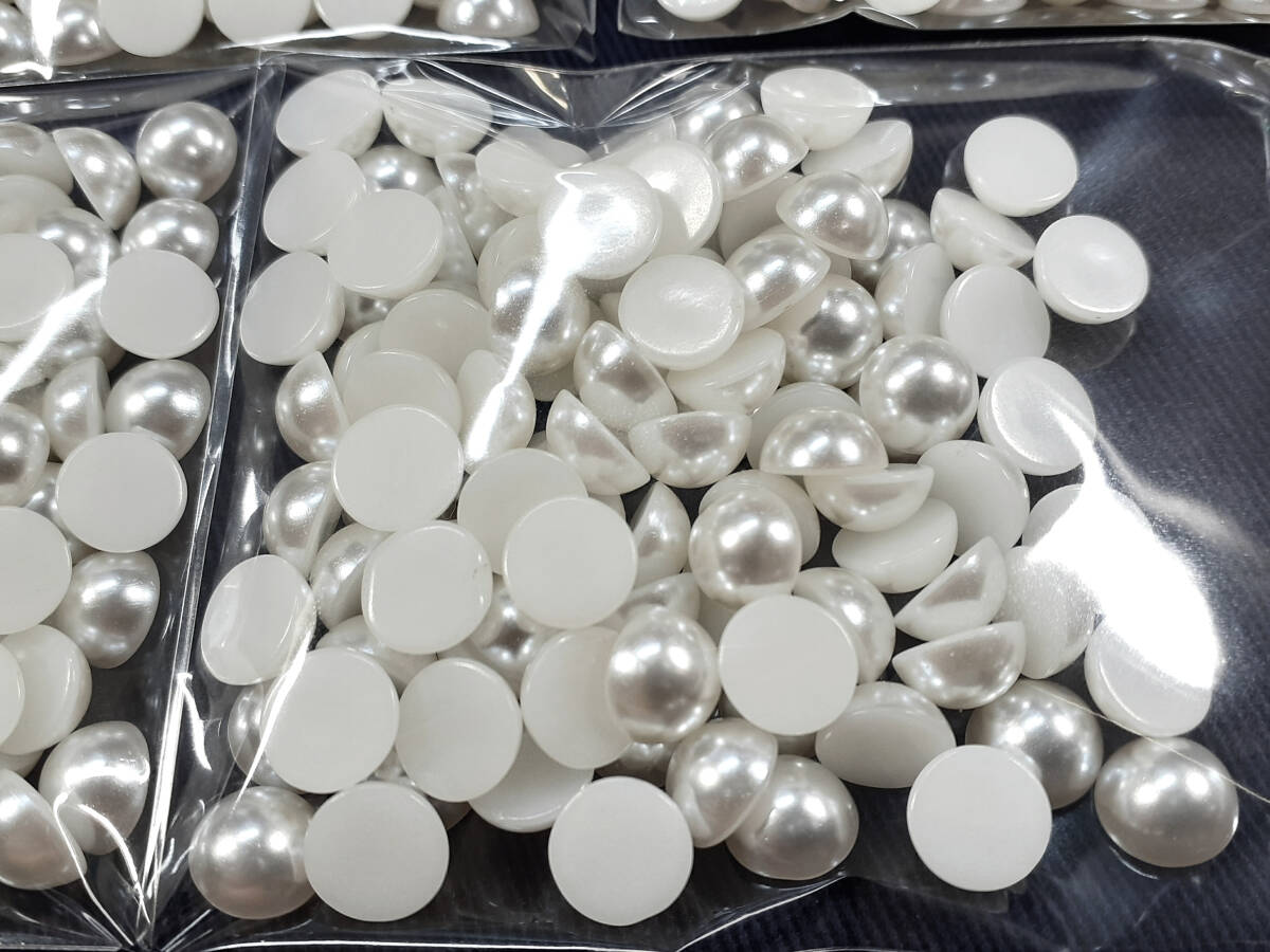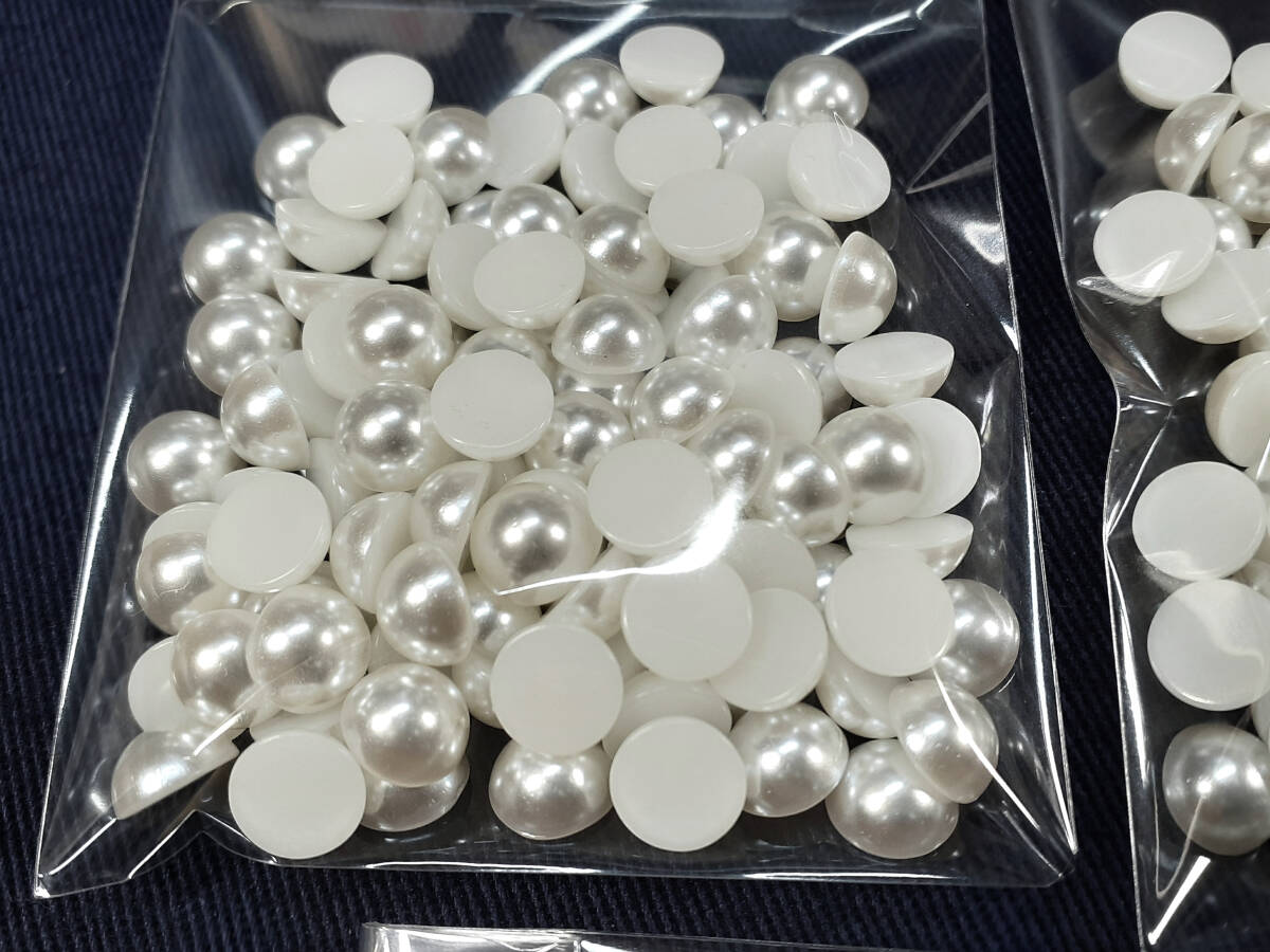 商品の ご説明 7mm 半丸 500個 以上です。 色目 白パール 半丸面のみの塗りです。 バリの無い綺麗な玉です。 | ||