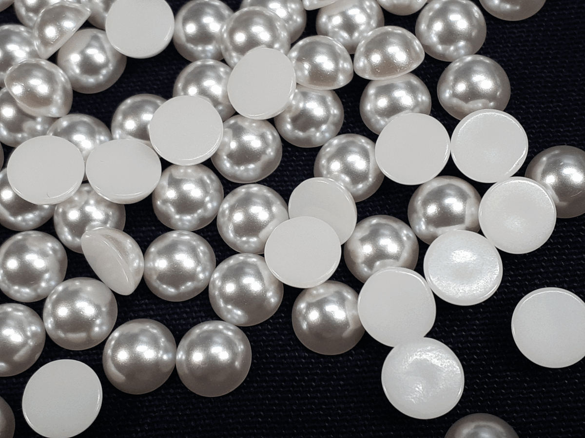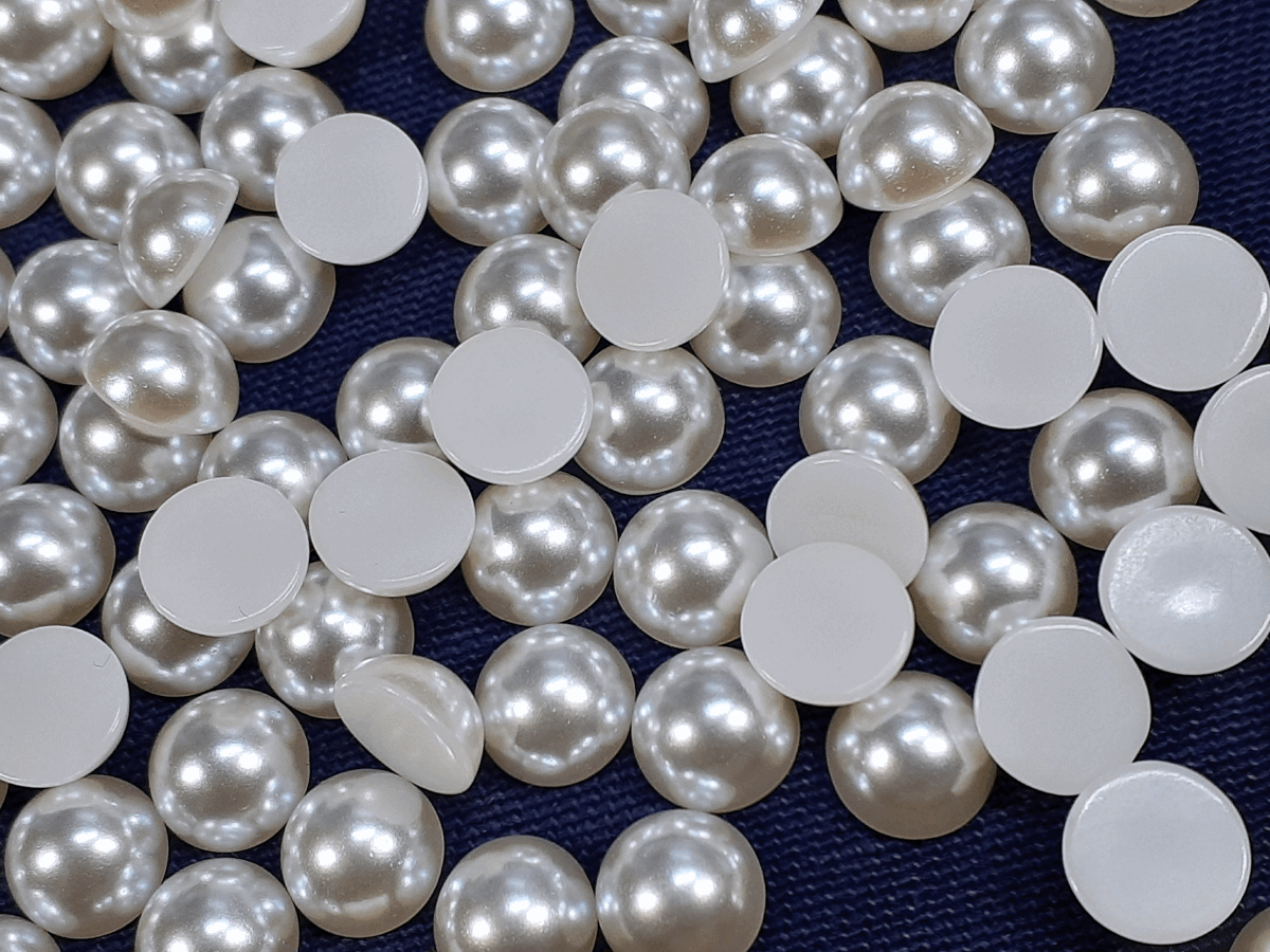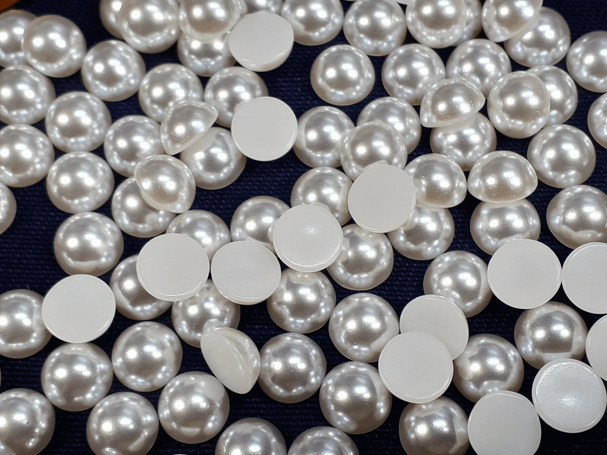 商品の ご説明 7mm 半丸 500個 以上です。 色目 白パール 半丸面のみの塗りです。 バリの無い綺麗な玉です。 | ||