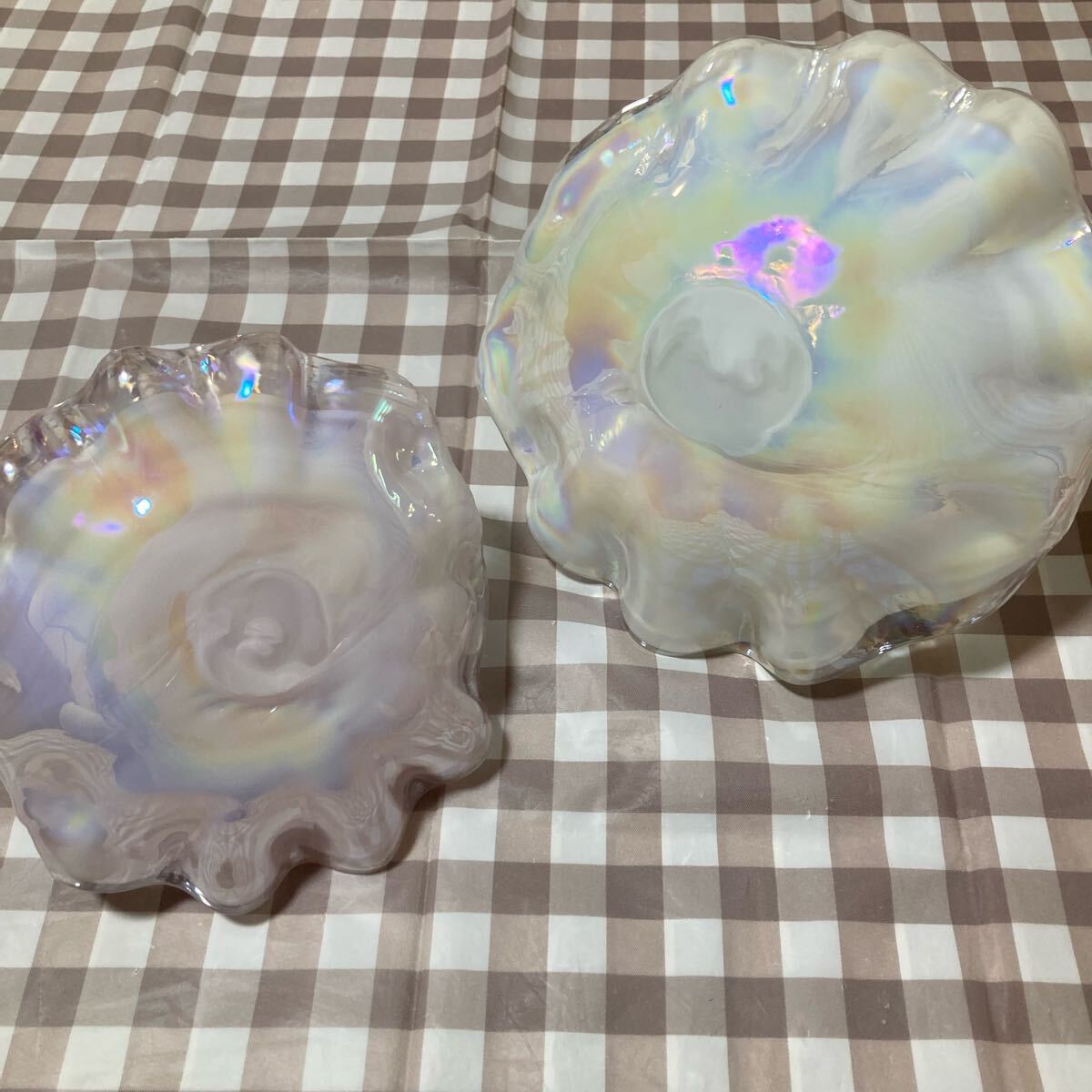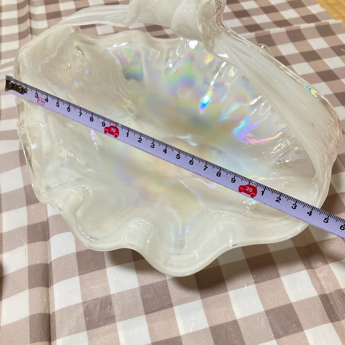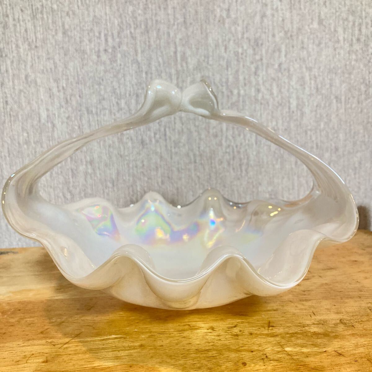 シェル型のガラス製ボウル、虹色の光沢が特徴。
