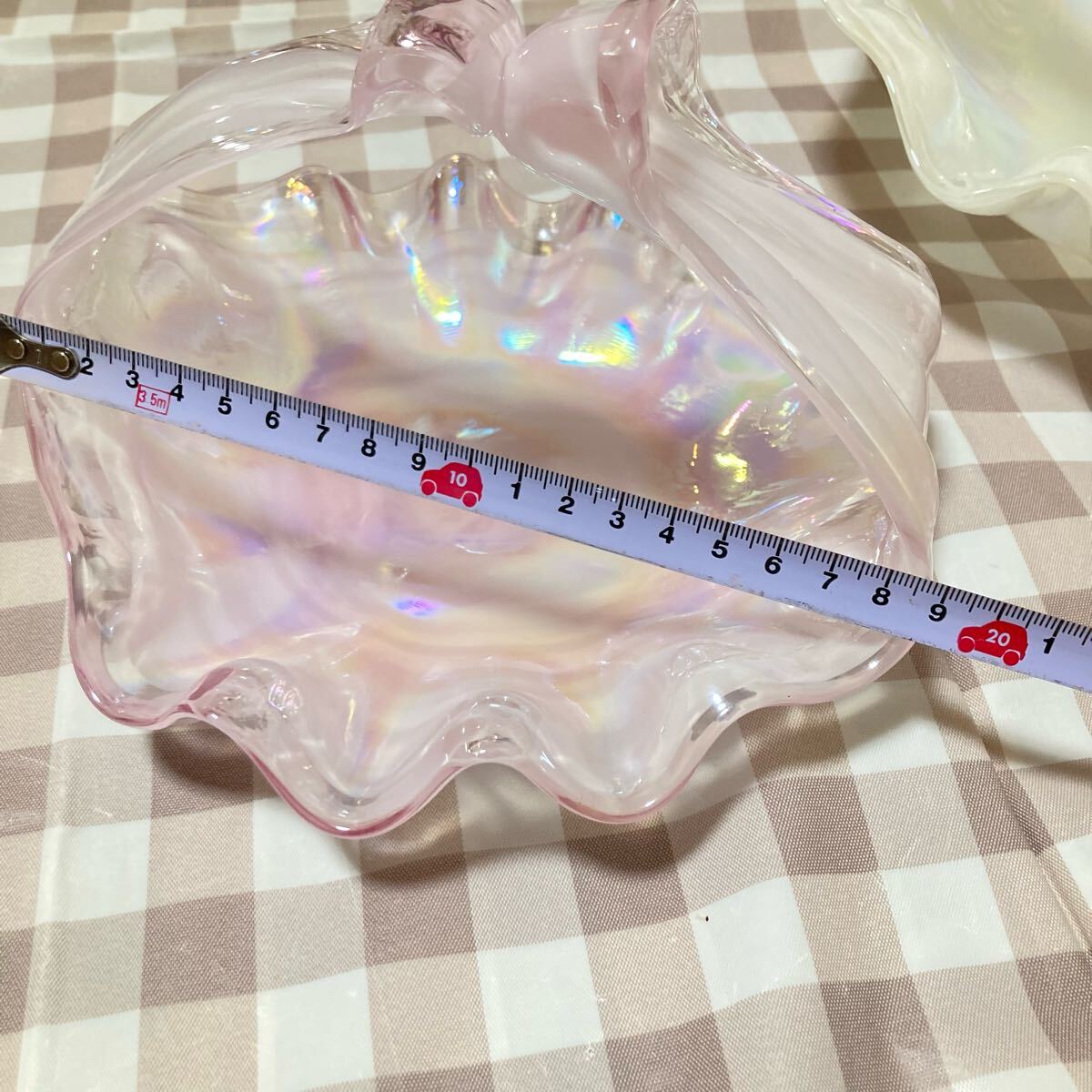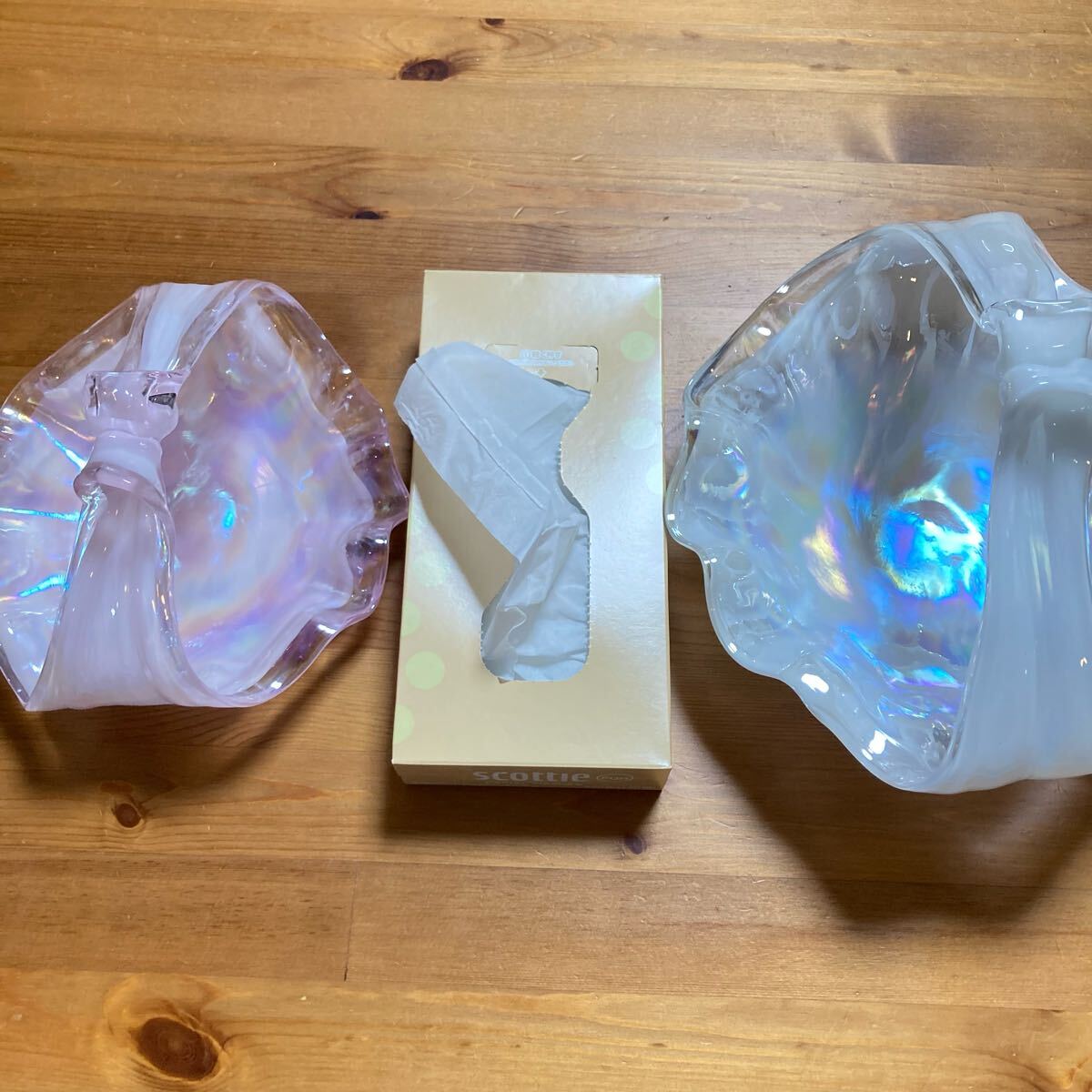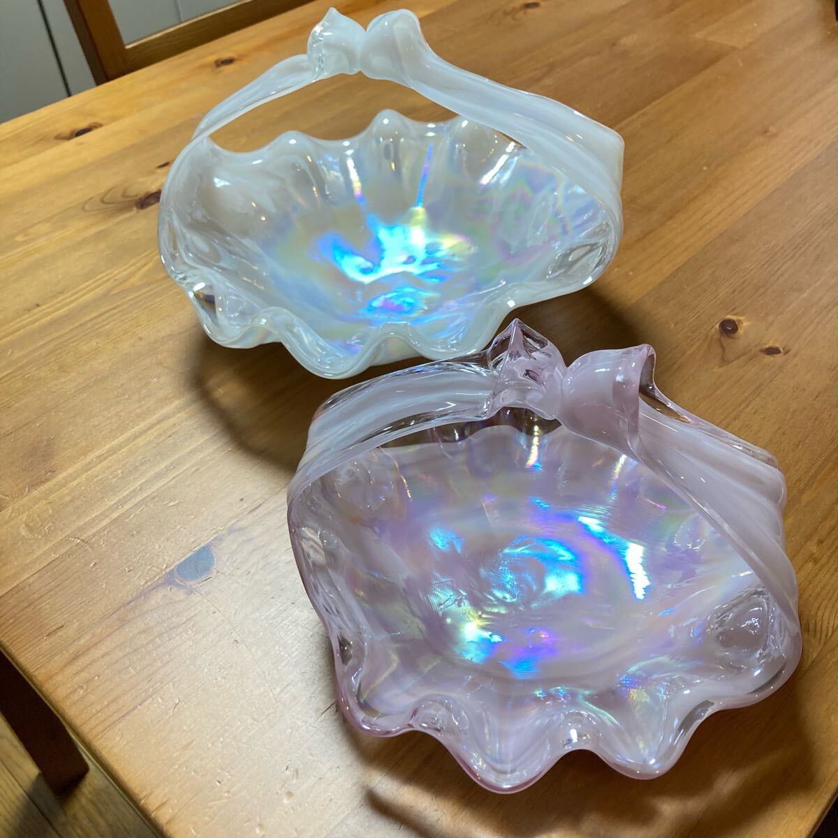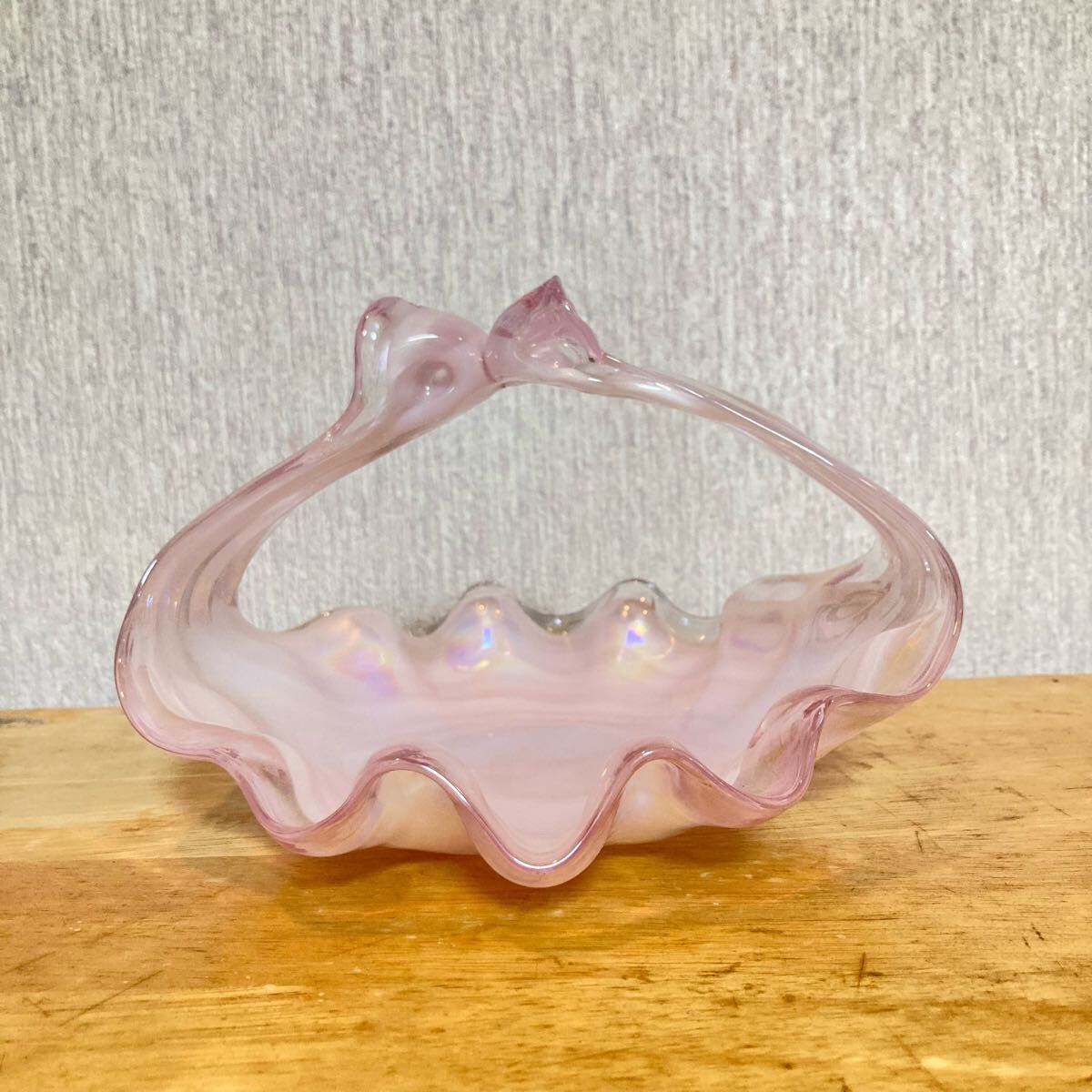 シェル型のガラス製ボウル、虹色の光沢が特徴。