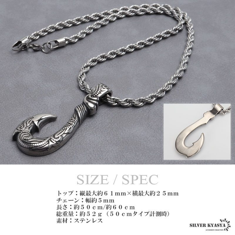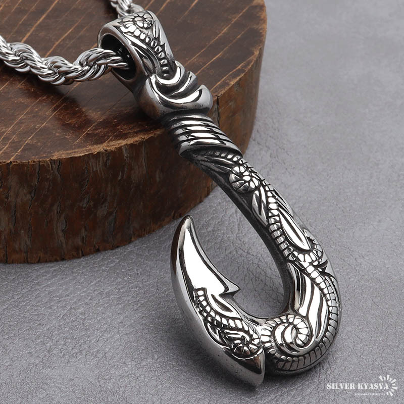 | 商品概要 | ■ITEM DETAIL フィッシュフック(釣り針)をモチーフとした重厚感たっぷりのネックレス。トップにハワイの自然を感じられるスクロールとマイレをレリーフした逸品。単品でも十分に存在感があります。 ■ステンレス素材を使用 金属部分は頑丈なことで知られるステンレス素材を採用。耐久性はもちろん耐水性も高く水場での着用も可能。金属アレルギーも出にくいとされている金属です。 |