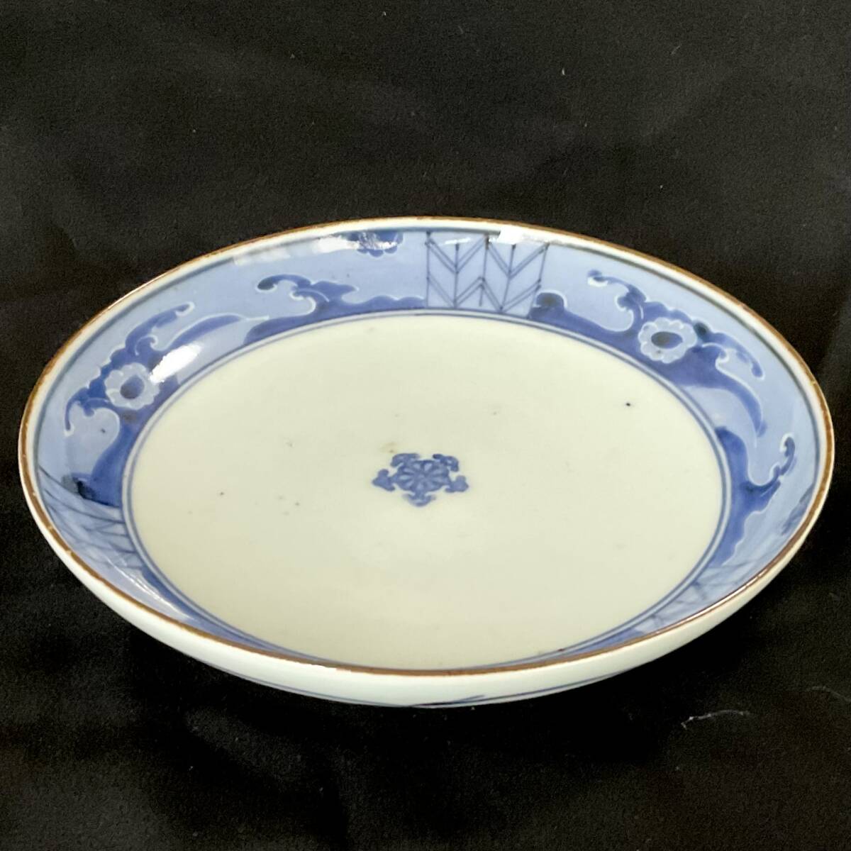 古伊万里:江戸中期末流水桜墨弾矢羽薄濃紅縁五寸五分皿⑧