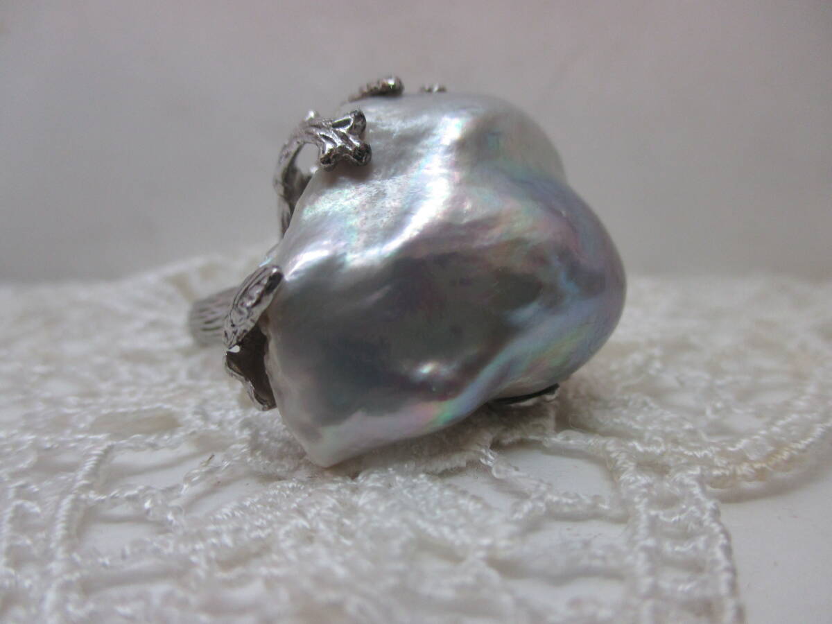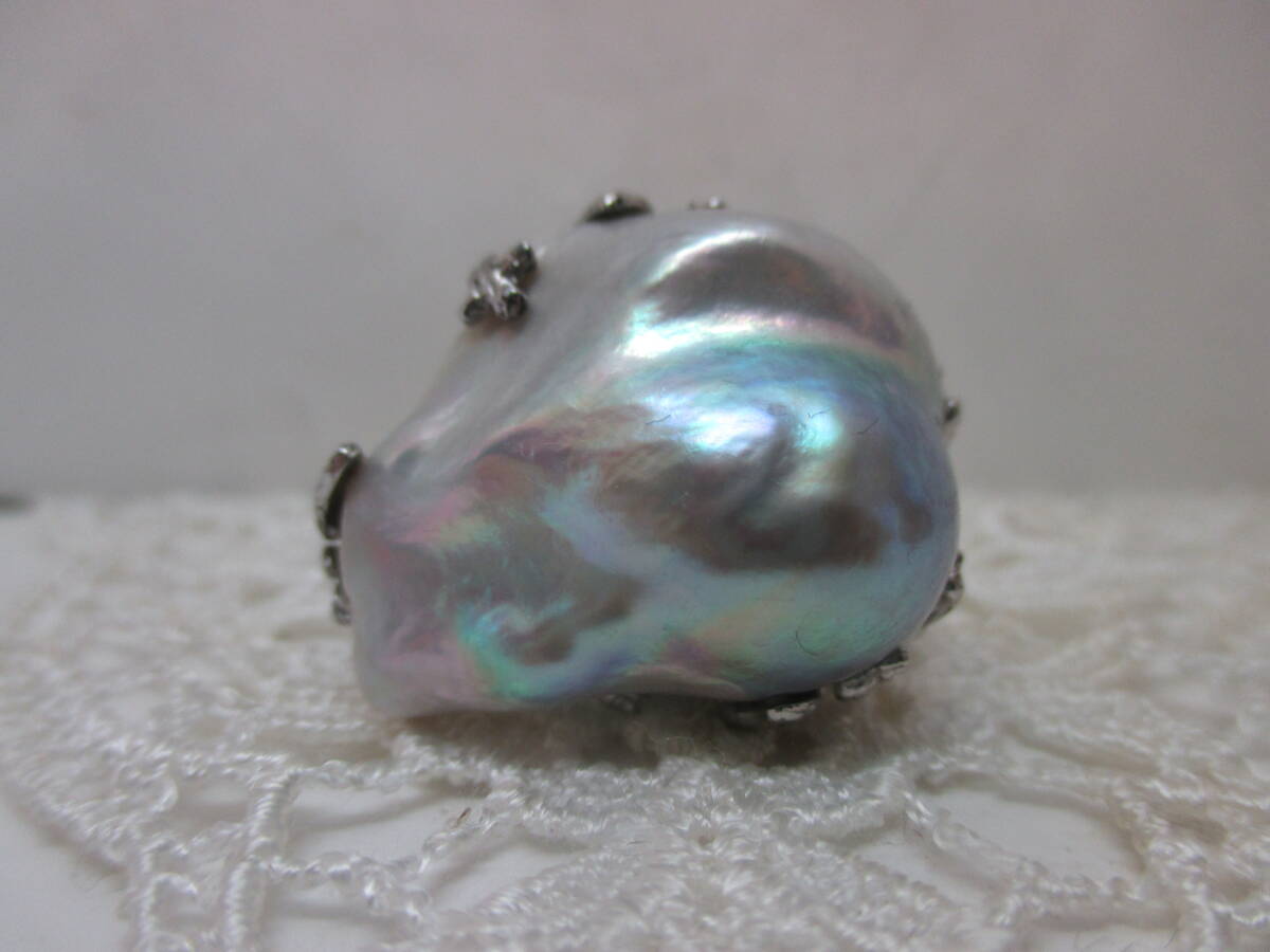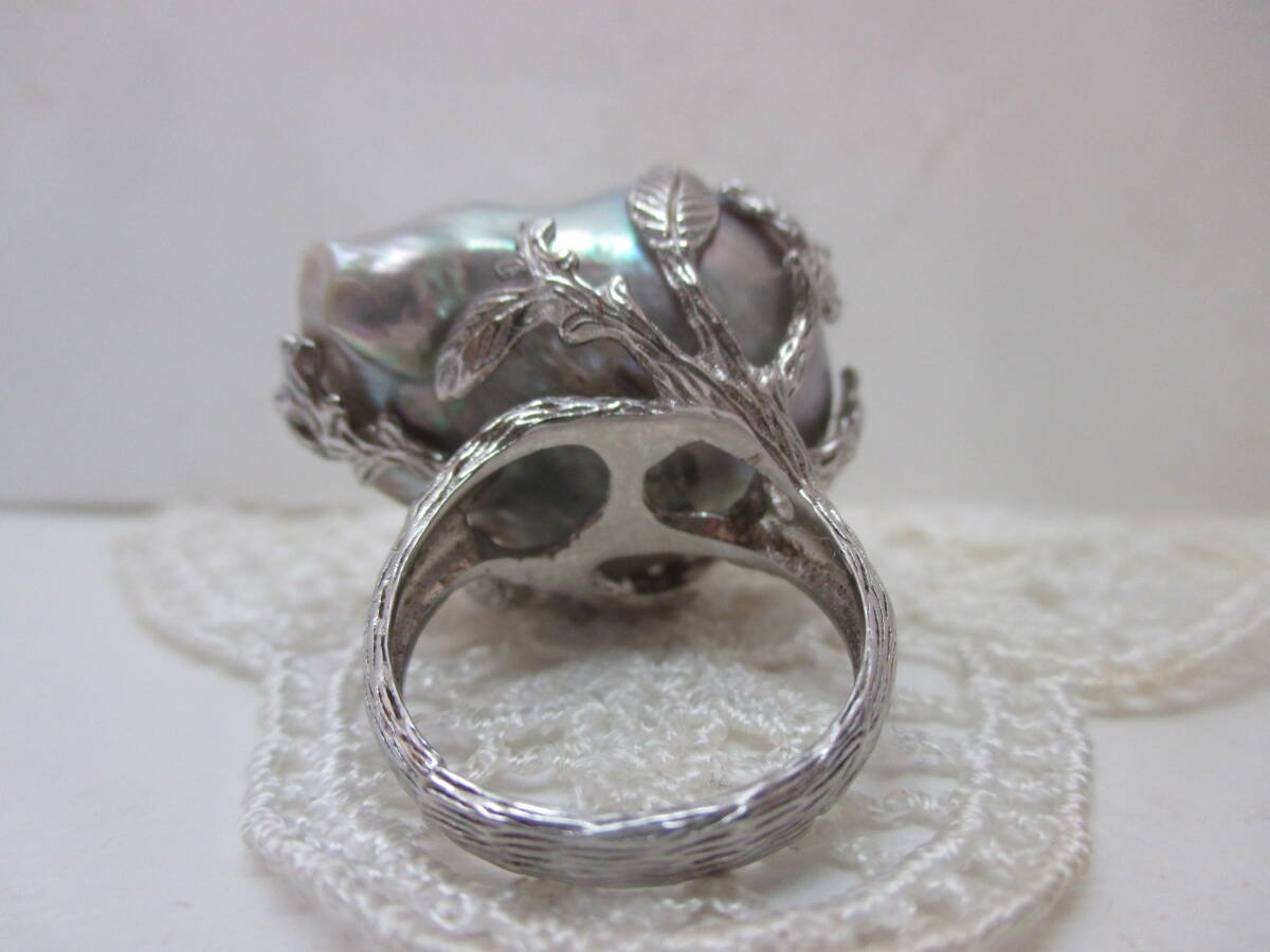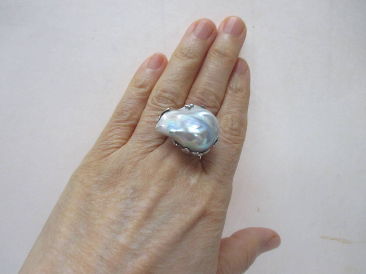 ★新品 デカテリ艶いい 銀細工925南洋バロックグッロシーシルバーグレーパール調節可能リング♪