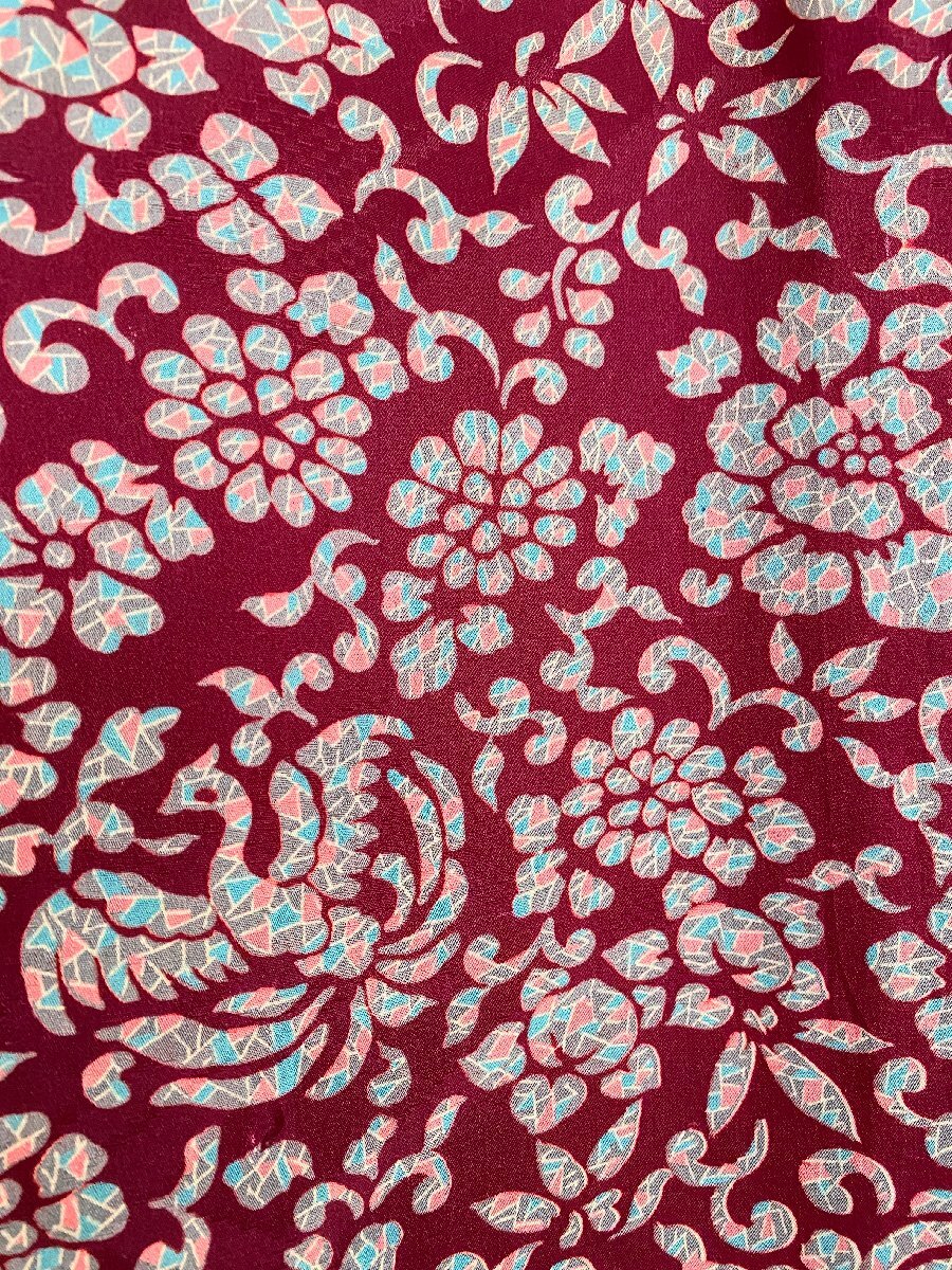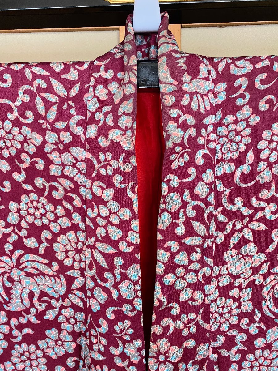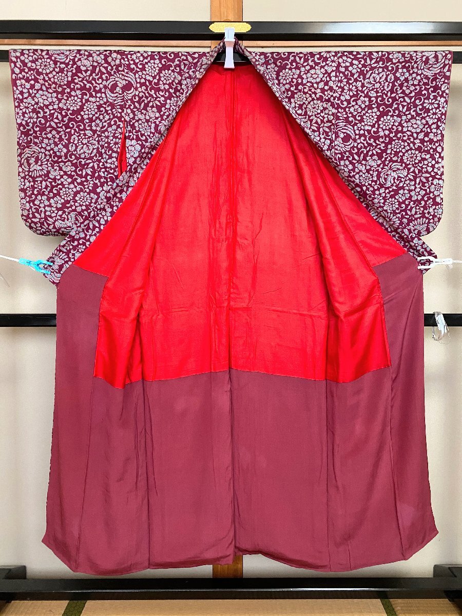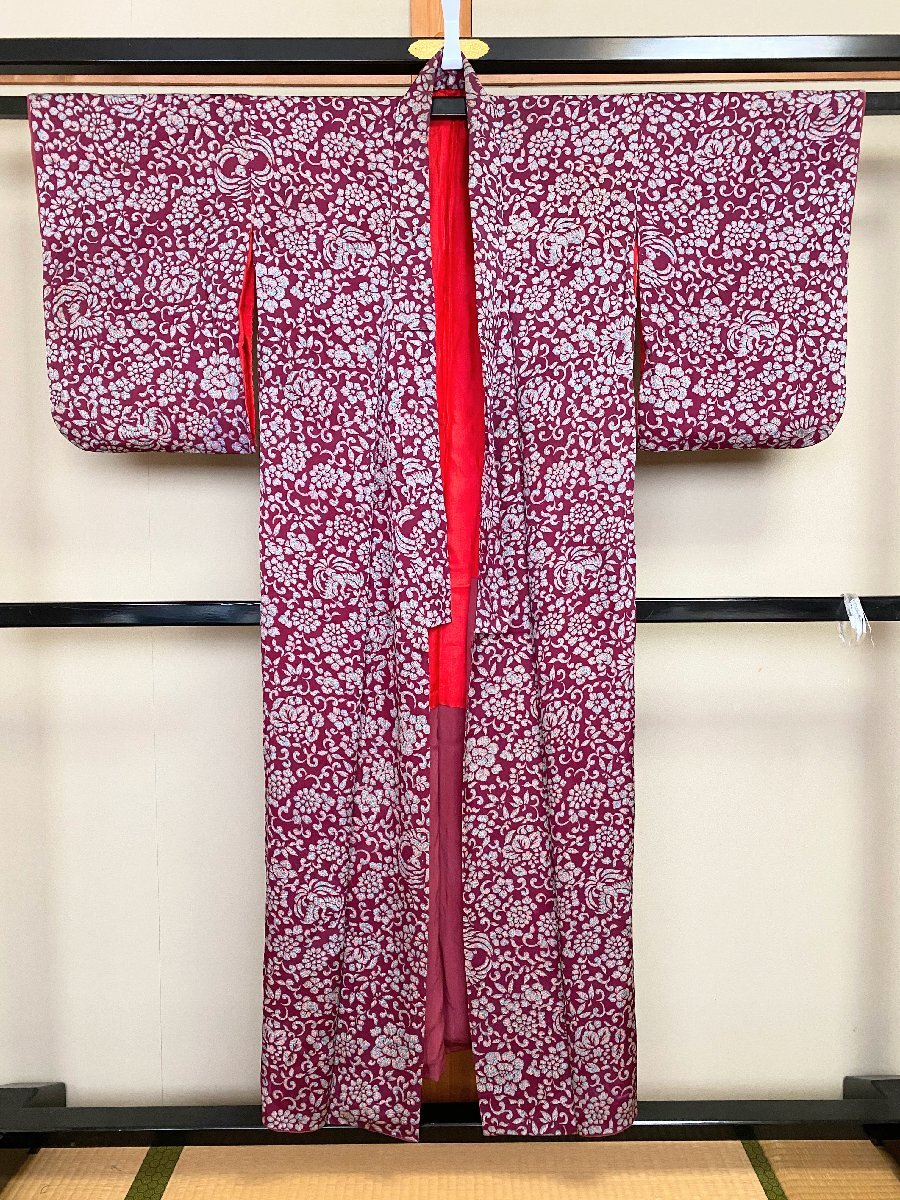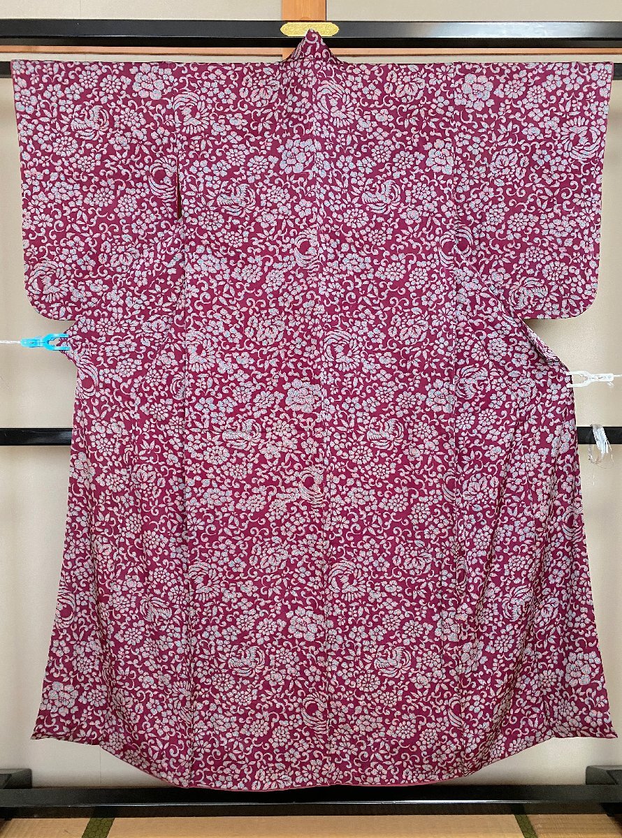 140B/アンティーク★女性着物【着用可】小紋★深紅色 シルバー色の柄 鳳凰、牡丹、菊柄 正絹??モダン レトロ お洒落 豪華 リメイク素材