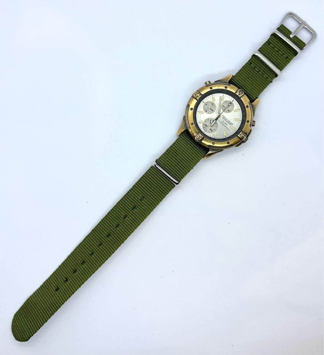 ケースサイズは38ミリで、ゴールドカラーにヴィンテージ風加工がされています。