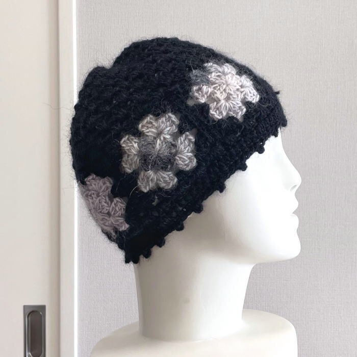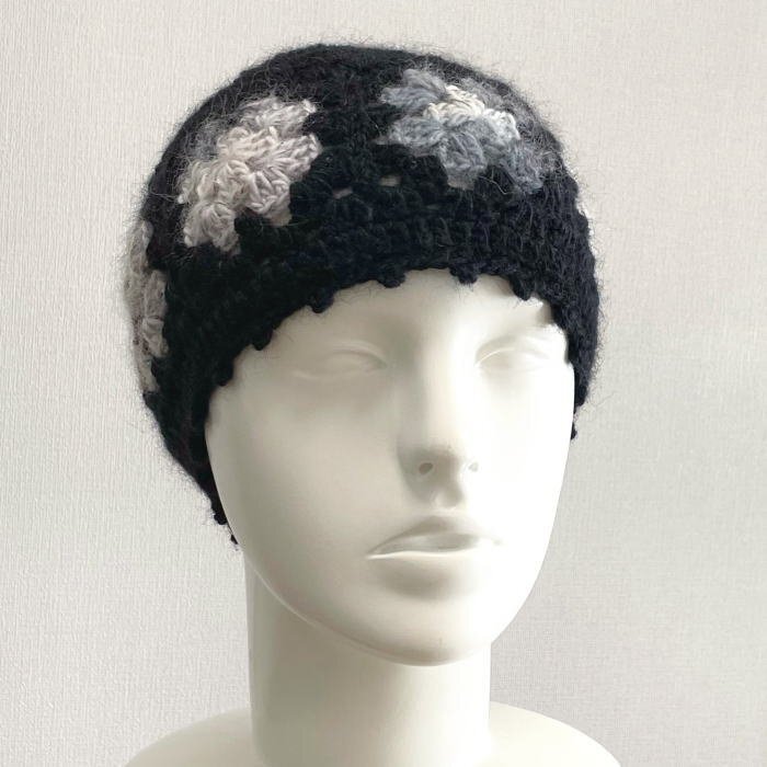 段染め毛糸のドミナでモチーフを、その他を単色のドミナノームで編んだかぎ針編みの帽子