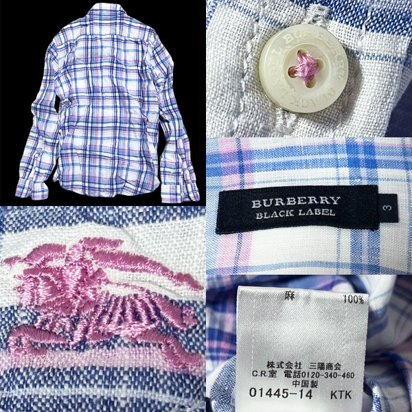 極美品!3(L) バーバリーブラックレーベル ホース刺繍×チェック柄 リネン麻100% ロールアップ2way長袖シャツ■7分袖BURBERRY BLACK LABEL