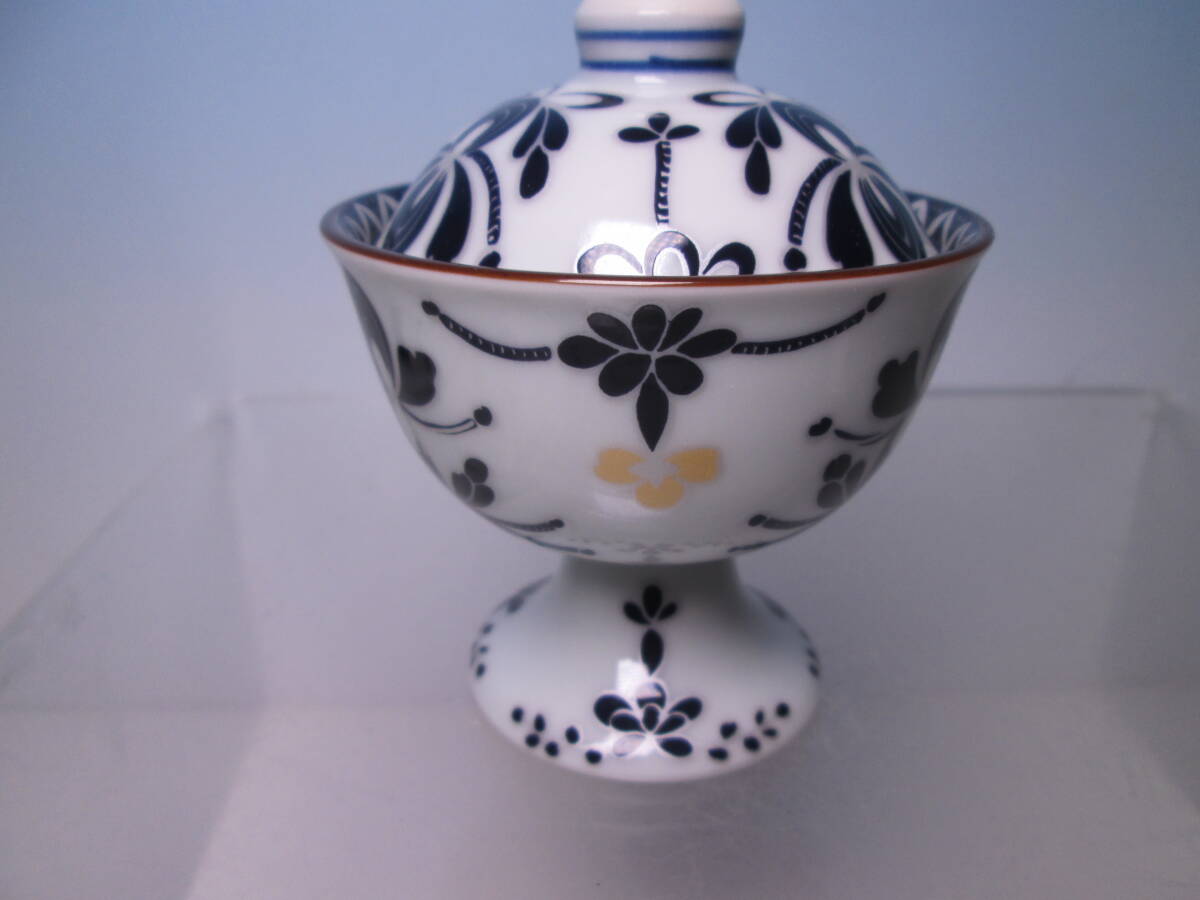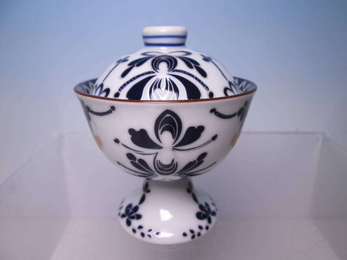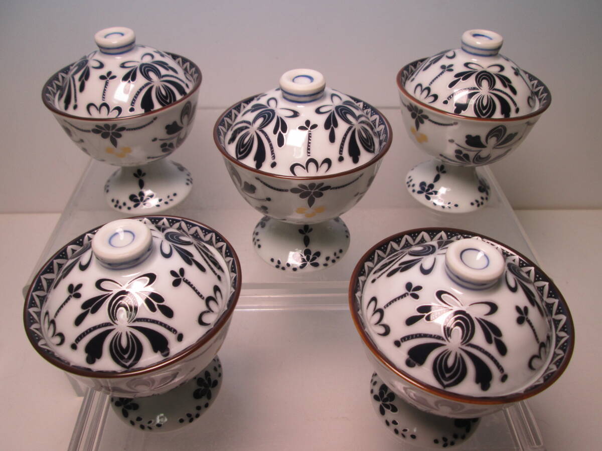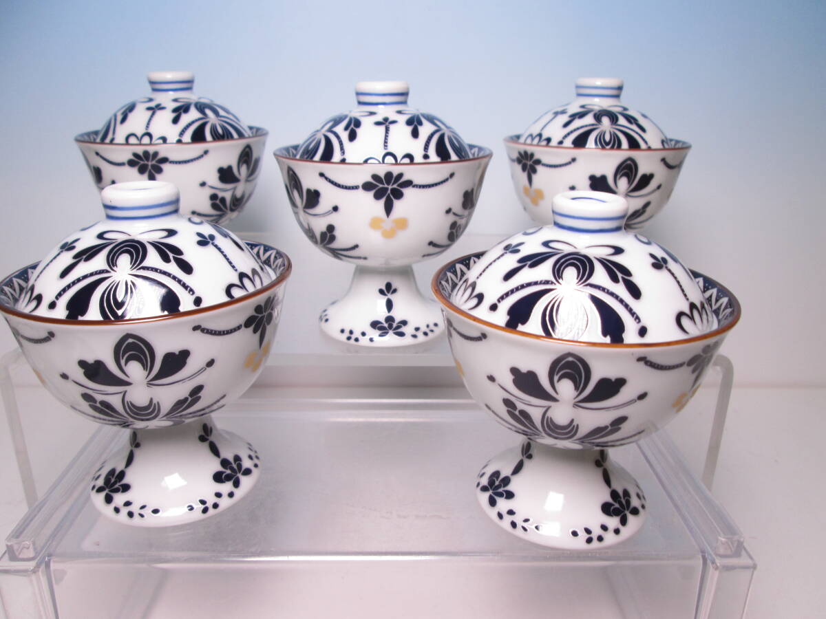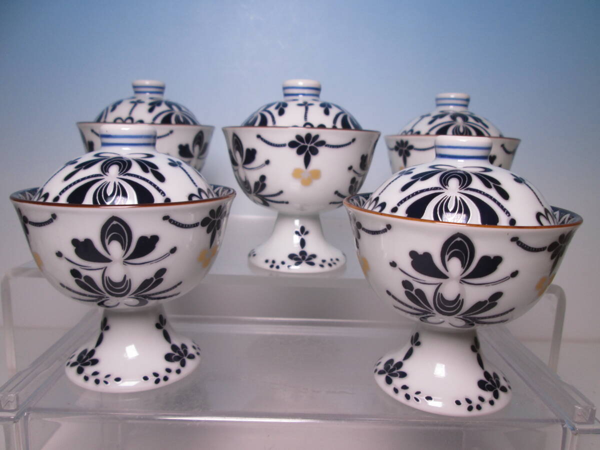 ☆お料理屋さんの器 賜光窯 錦藍文様 銀彩 高杯蓋向付 五客 箱無 茶懐石/割烹/日本料理