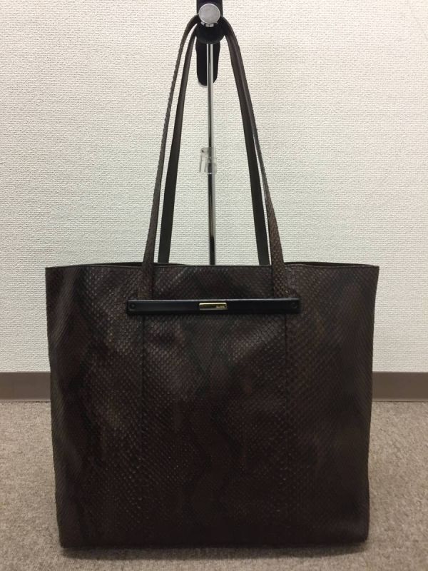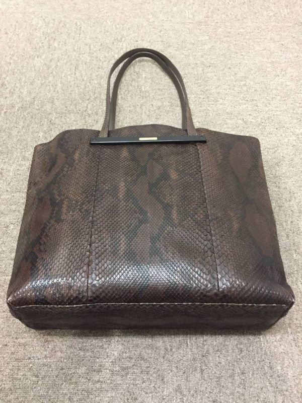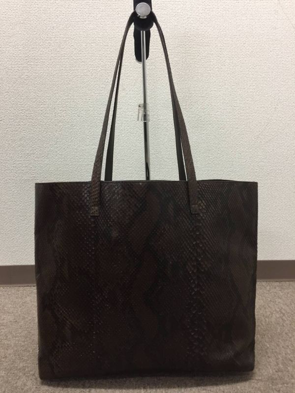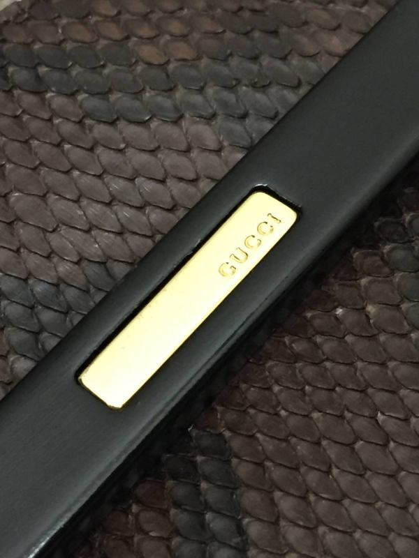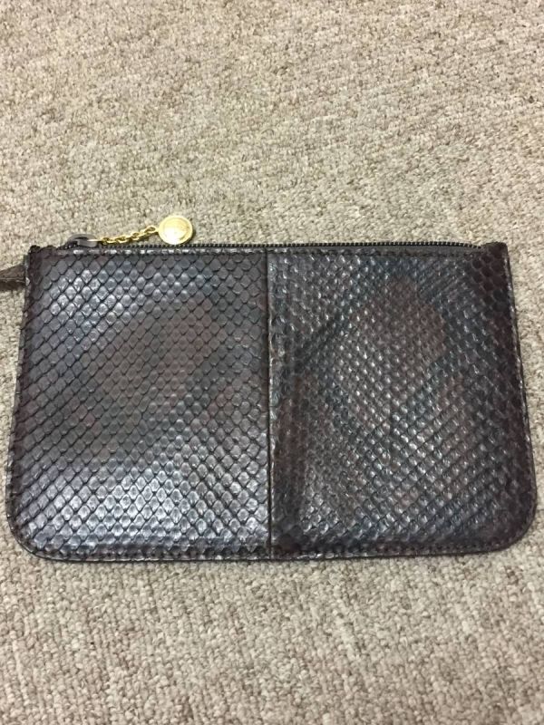 正面にはブランドロゴが入ったプレートが付いていて、ダークブラウンのパイソンなので、素敵で高級感もありますね。