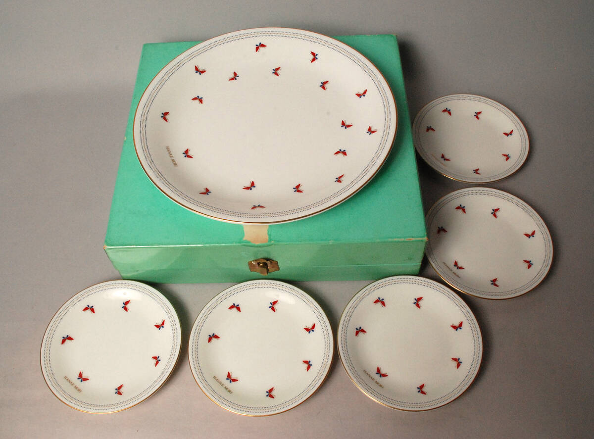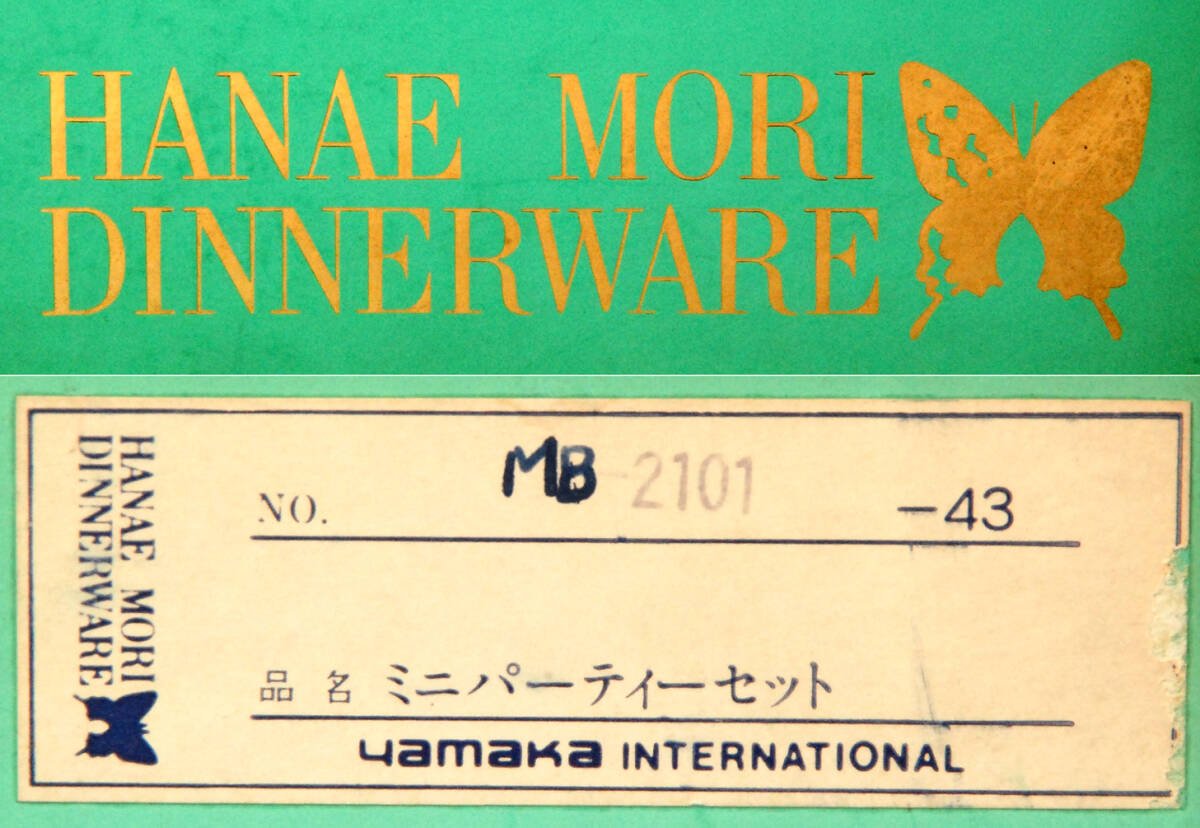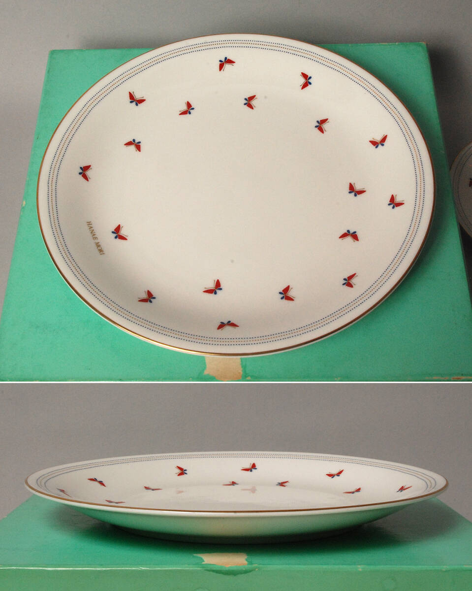 * 商品説明 * 日本の陶器の老舗、yamaka(山加商店)のHANAE MORI(森 英恵)のミニパーティセット、蝶の絵柄の大皿1枚+小皿5枚のセット・・・HANAE MORI DINNER WARE です。大皿の直径は約24cm、小皿の径は約12.5cmです。留め具付きの木?の箱に入っていますが、箱は経年感が有って少し傷んで汚れていますが、プレートは未使用品です。是非お役立て下さい。 |