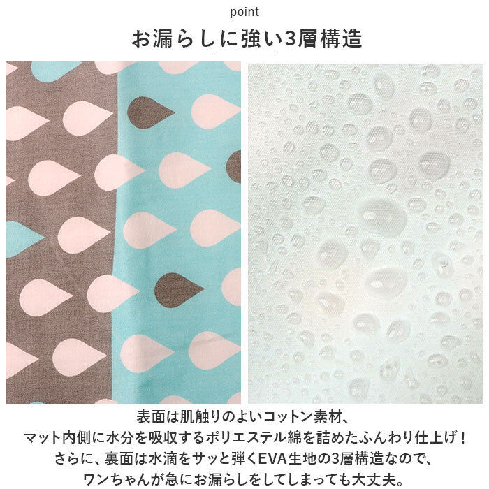商品説明 | ・・ワンちゃんのお漏らしも、サッとひと拭きで安心!ポップな絵柄が可愛い「ペット用はっ水シート(60cm×73cmタイプ)」が新登場。 ・【ふんわりクッションでリラックス】 ・程よい厚みと柔らかなクッション性で、ワンちゃんやネコちゃんのくつろぎスペース用のマットに最適。 ・【お漏らしに強い3層構造】 ・表面は肌触りのよいコットン素材、マット内側に水分を吸収するポリエステル綿を詰めたふんわり仕上げ!さらに、裏面は水滴をサッと弾くEVA生地の3層構造なので、ワンちゃんが急にお漏らしをしてしまっても大丈夫。 ・【トイレトレーニングにも♪】 ・普段使用するペットシーツの下に敷いておくことで、仔犬のトイレトレーニングなどにも大活躍。 ・【お食事用マットにしてもOK!】 ・お食事中にフードを散らかしてしまいがちなネコちゃん用に、フードボウルや水のみ皿用のマットにしてもOK!飛び散り汚れを防いで、毎日のお掃除もラクラク。 ・【ご家庭でお洗濯OK!】 ・ご家庭で手軽に手洗いができるから、いつも清潔に、繰り返し使えるのも嬉しいポイント! |