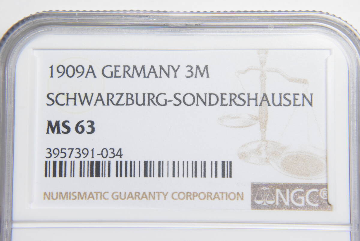 商品名:ドイツ 1909年 3マルク銀貨 シュヴァルツブルク ゾンダースハウゼン侯国 NGC MS63