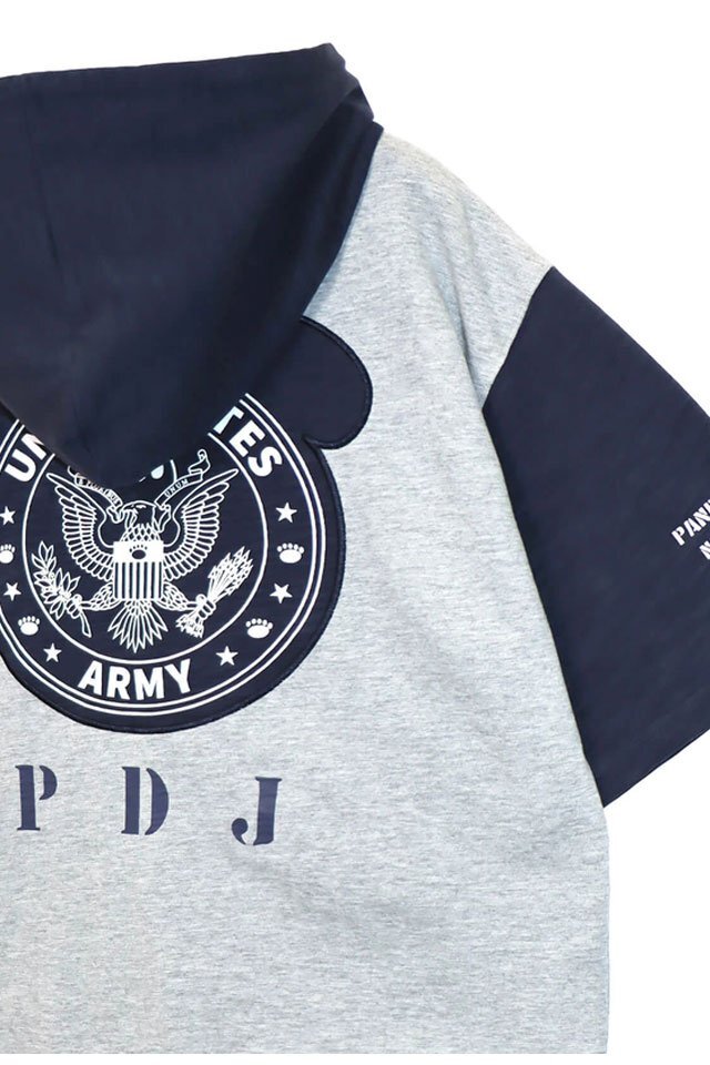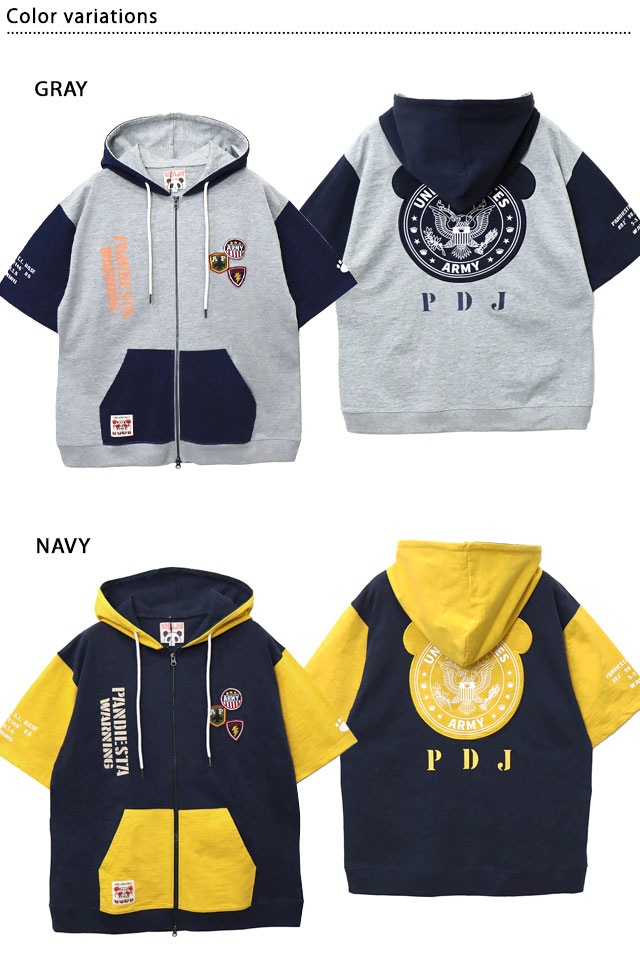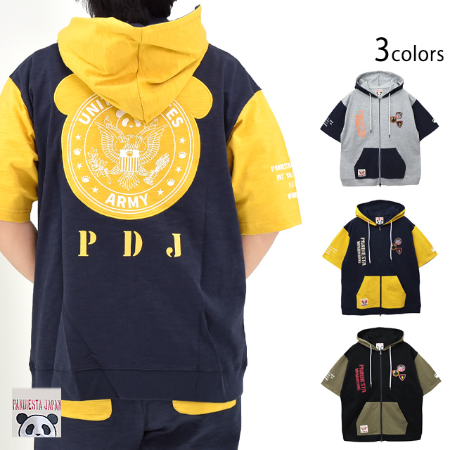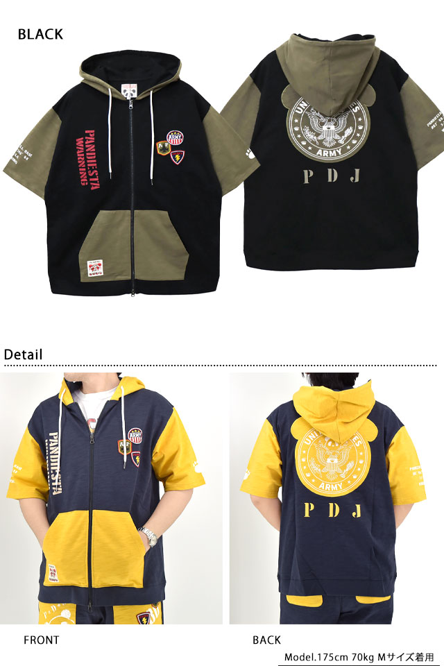 和柄ブランド【錦】の姉妹ブランドとして誕生した、お茶目なパンダをモチーフとした【PANDIESTA JAPAN】より「ミリタリー切替フルジップパーカー(585950)」のご紹介です。 今や、錦の定番モチーフとなった「錦PANDA」!! 袖通しが良く吸汗性に優れた綿100%の天竺素材を使ったフルジップパーカーが登場しました。 パンディエスタミリタリーシリーズから、細い糸と太い糸を組み合わせて作られたスラブ天竺素材を使った半袖フルジップパーカーをデザインしました。 スラブ天竺とは特殊な織り方で生地の表面に表情を持たせた天竺素材の一つで、夏場のアイテムに使われることが多い素材になります。 こちらの商品では、その生地の中でも、ハリやコシのある肉厚なヘビーウエイトスラブ天竺をチョイスしました。 フード部分や両袖、カンガルーポケットには配色切替を用いてミリタリーテイストを演出しました。 前身胸部には部隊マークの様なワッペン刺繍を施し、バックにはパンディエスタのアイコンをベースとしたミリタリーモチーフをアップリケにしました。 今期生産分にはフロントファスナーにはダブルスライダーを採用しており、着心地や使い勝手の良さを格段に向上させています。 | |||||||||||||||||||||||||