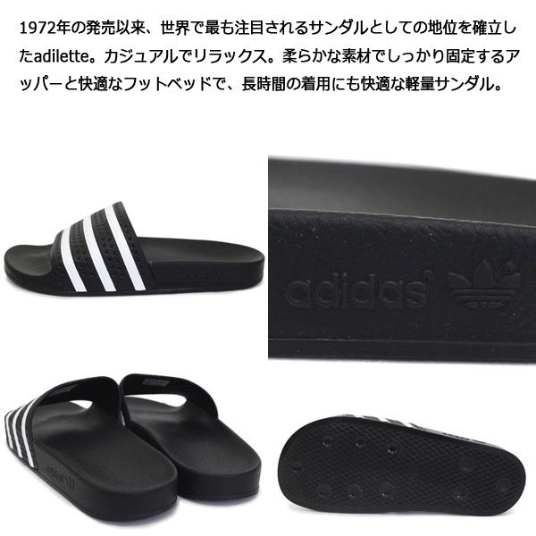 スペック | 1972年の発売以来、世界で最も注目されるサンダルとしての地位を確立したadilette。カジュアルでリラックス。柔らかな素材でしっかり固定するアッパーと快適なフットベッドで、長時間の着用にも快適な軽量サンダル。 |