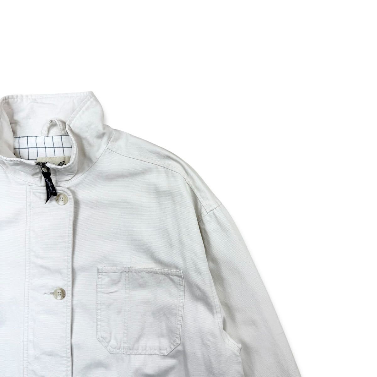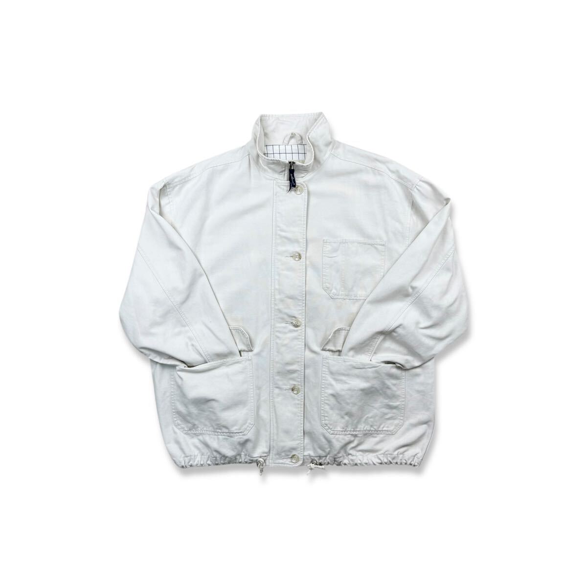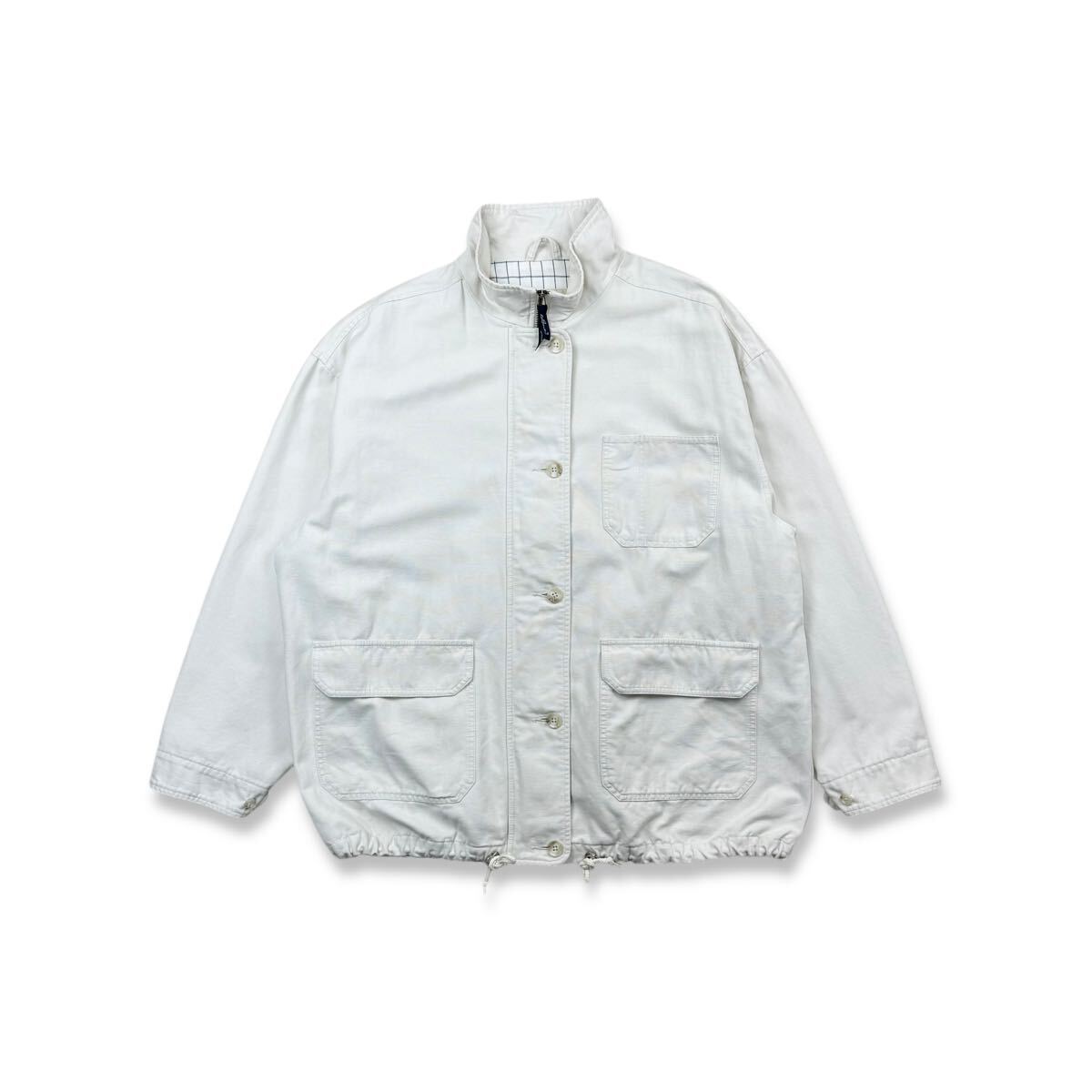 シェルは厚手のコットンキャンバスで、ホワイトカラー。比翼仕立てのフロントや実用的なフラップポケット、ライニングのグリッドチェック柄など、クラシカルながらもどこかアウトドアライクなムードを漂わせる仕上がりです。